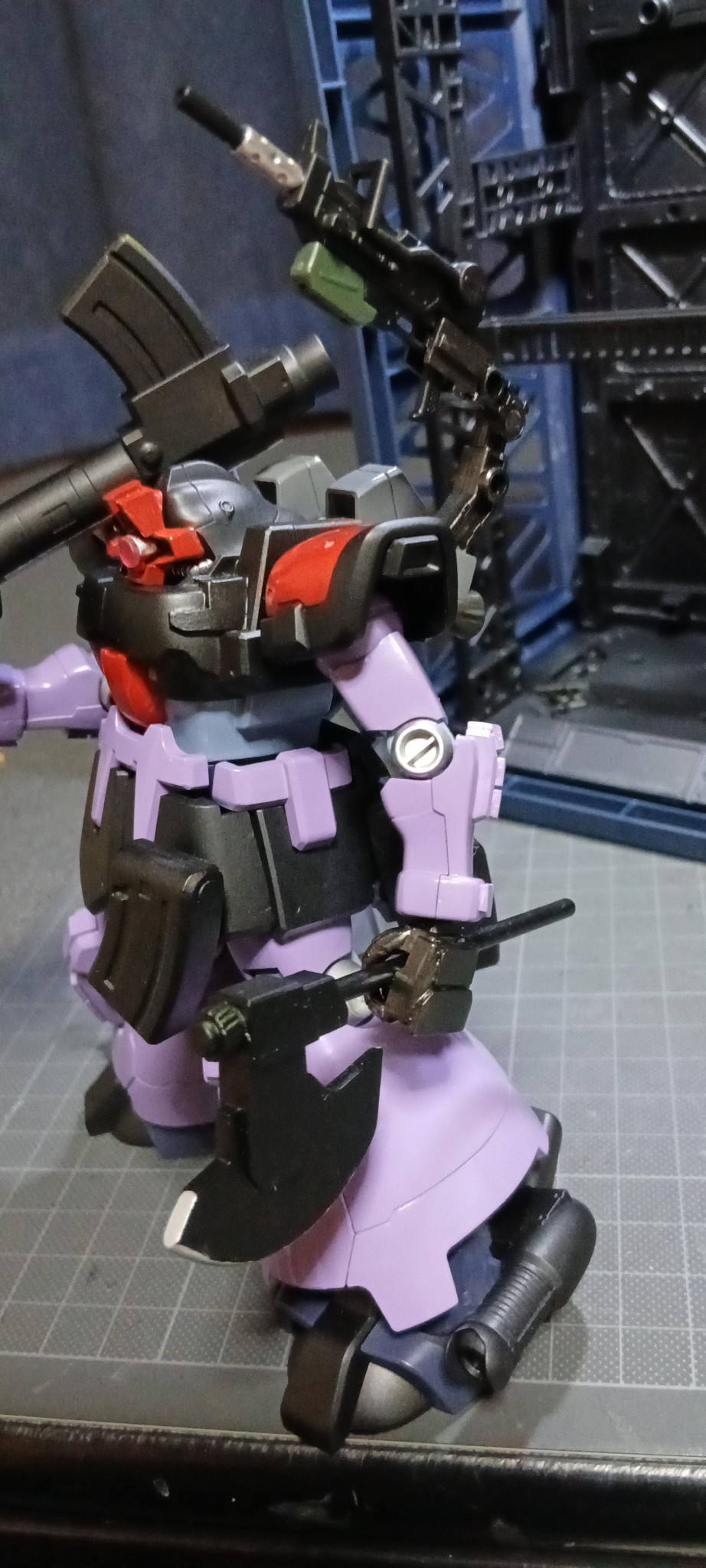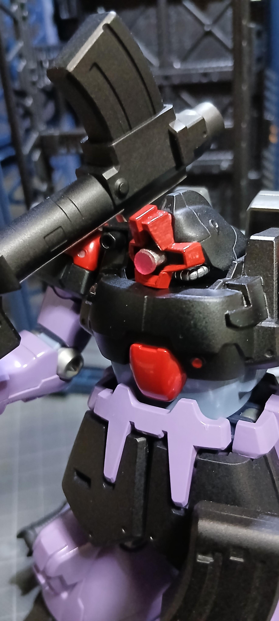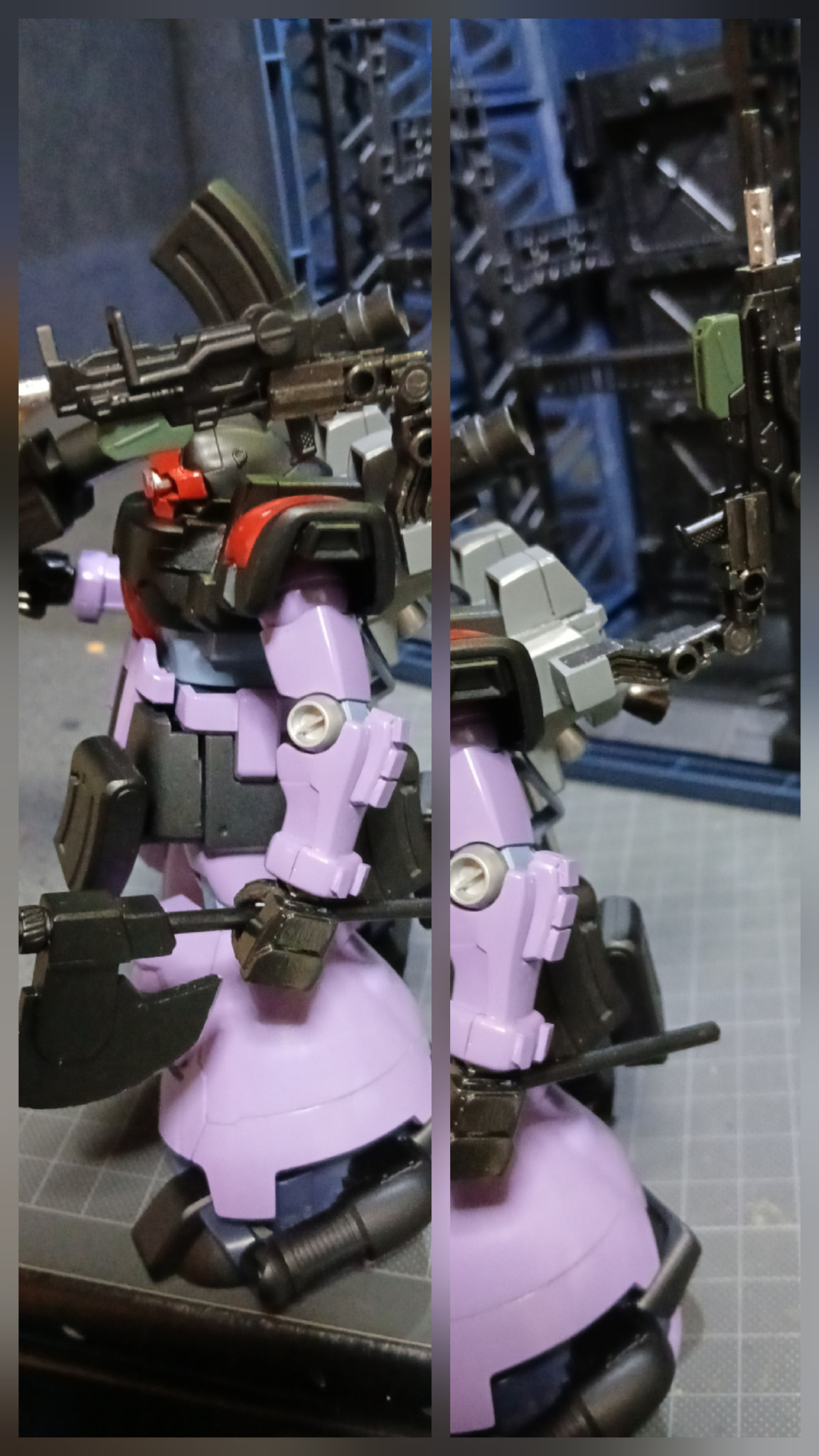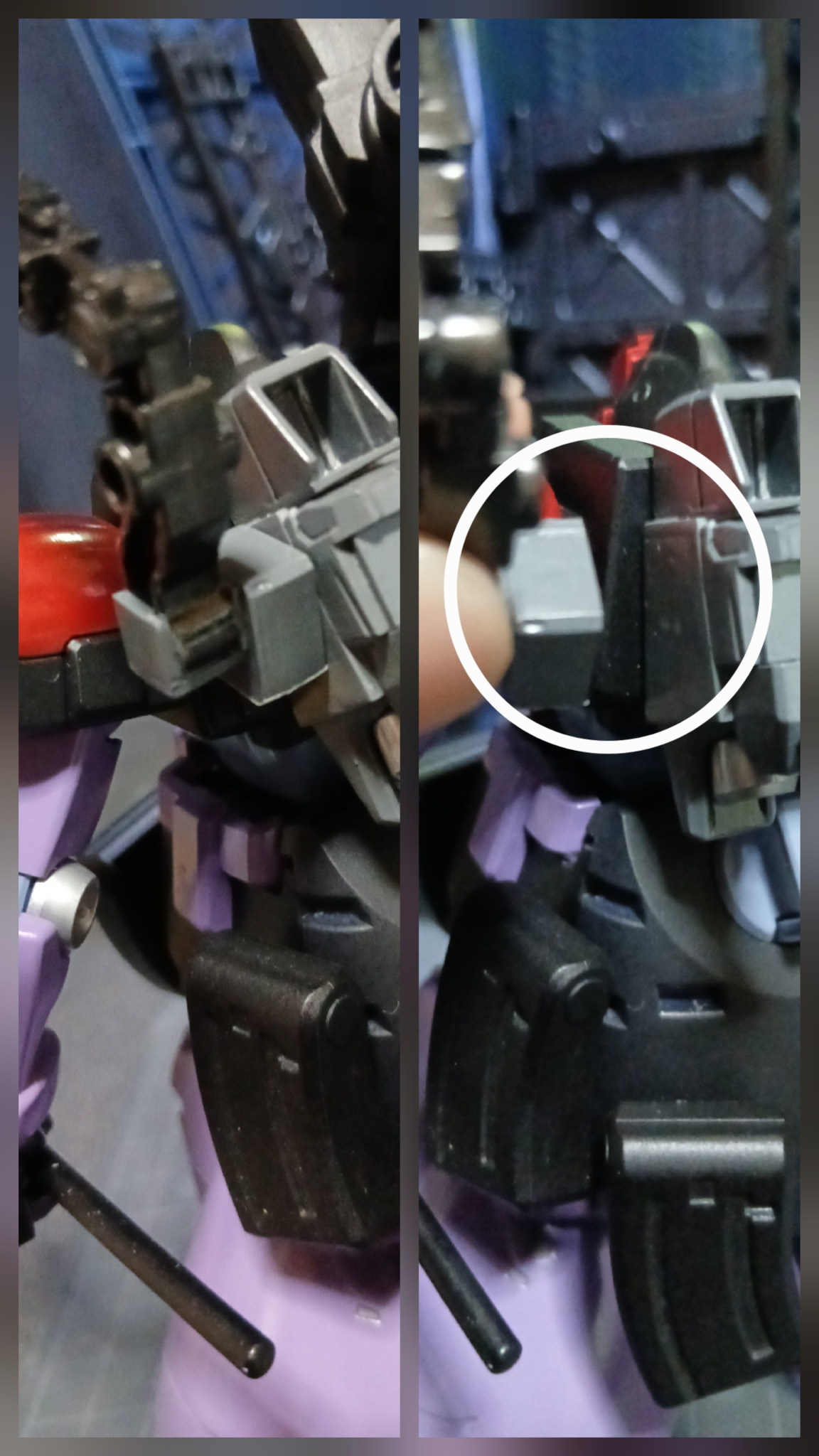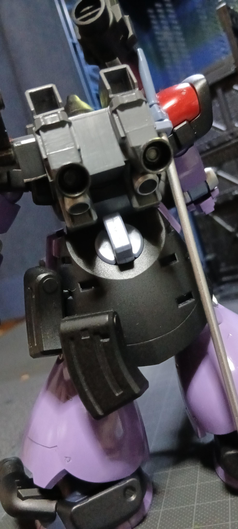 ショルダーアーマーの隙間が気になったので、ジャンクパーツとプラ板でダクトを取り付けました。あと、合わせ目消しもやってみました😄ジャイアントバズですが、元のままだとマガジンが肩に引っ掛かるので、カットして上下を反対にしました。これである程度自由がききます。