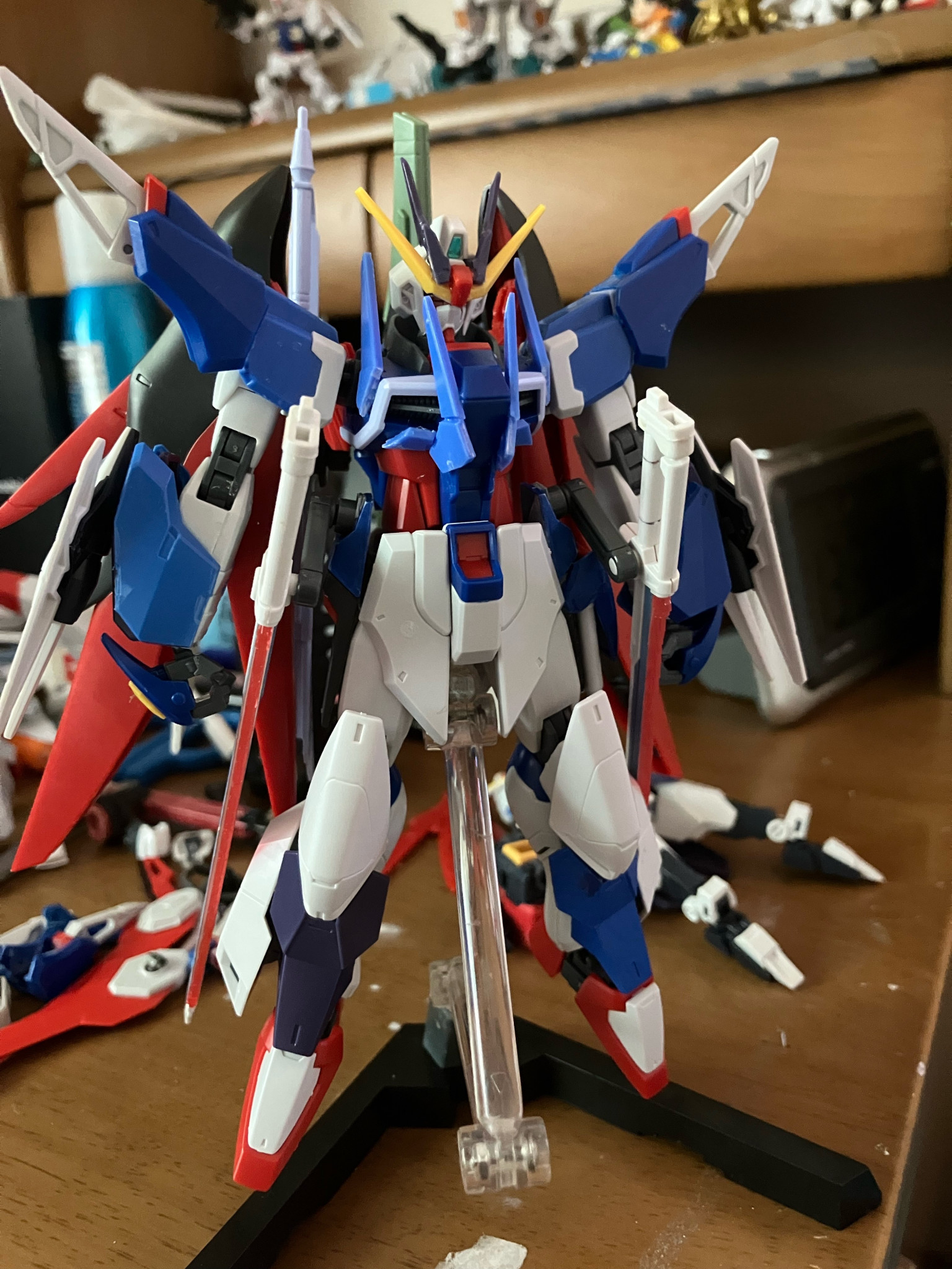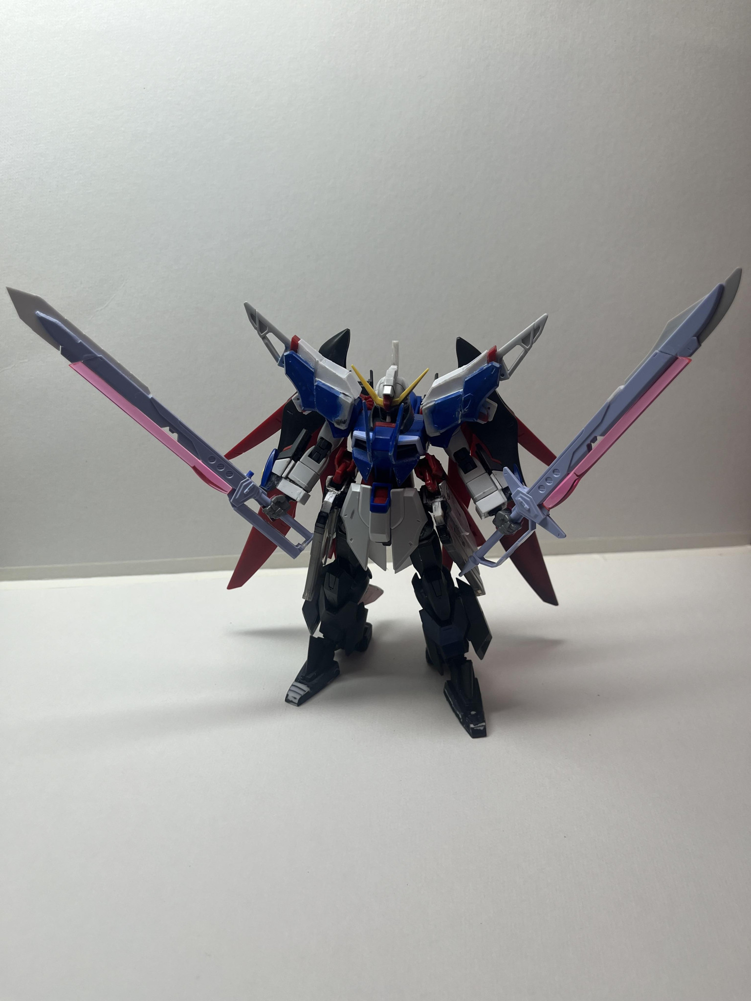 このガンプラは、デスティニーを改造したものです。僕がデスティニーとZガンダムが好きなので、ベースをデスティニー、足にZっぽい雰囲気のあるユーラヴェンのパーツを使っています。