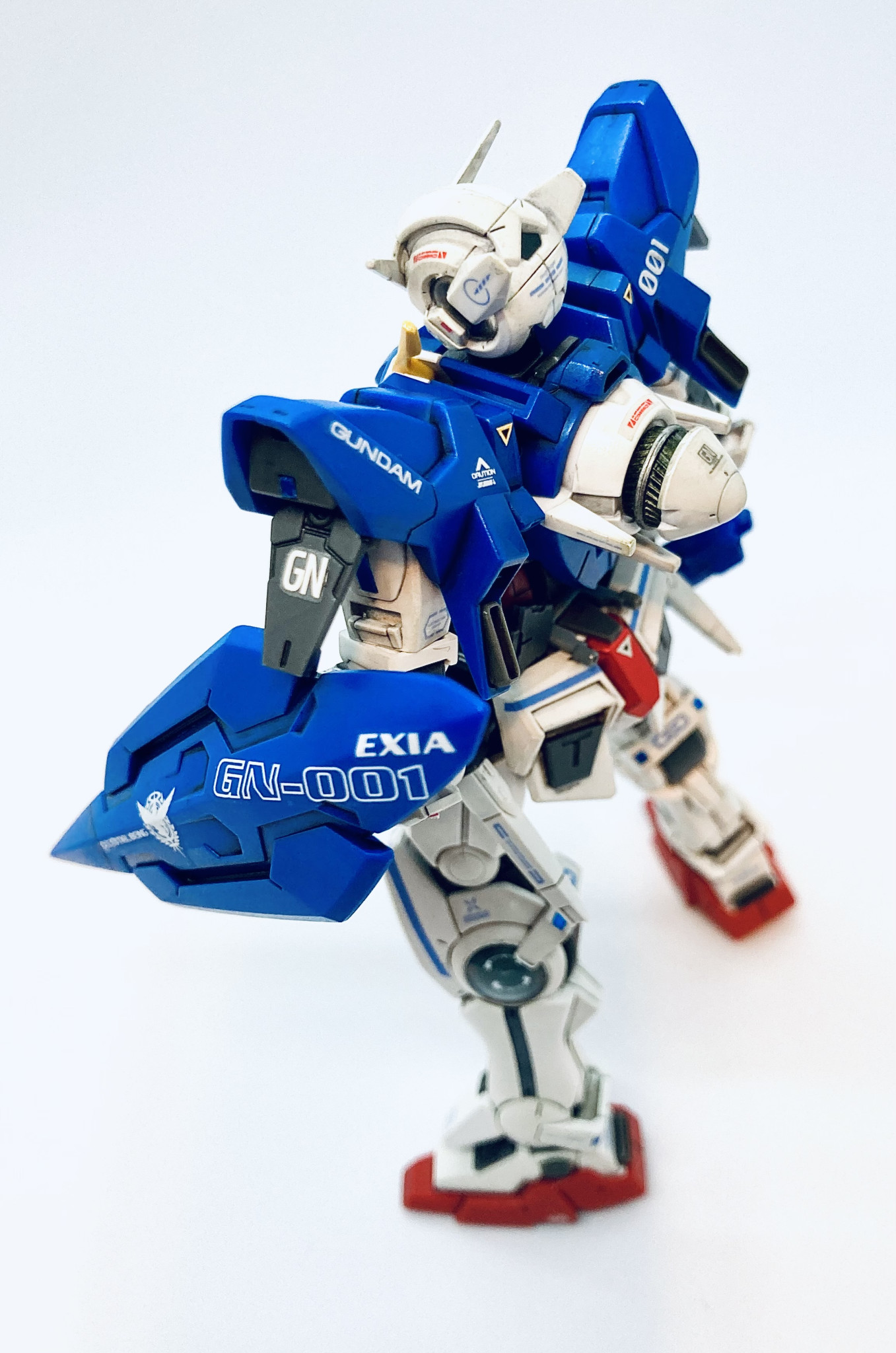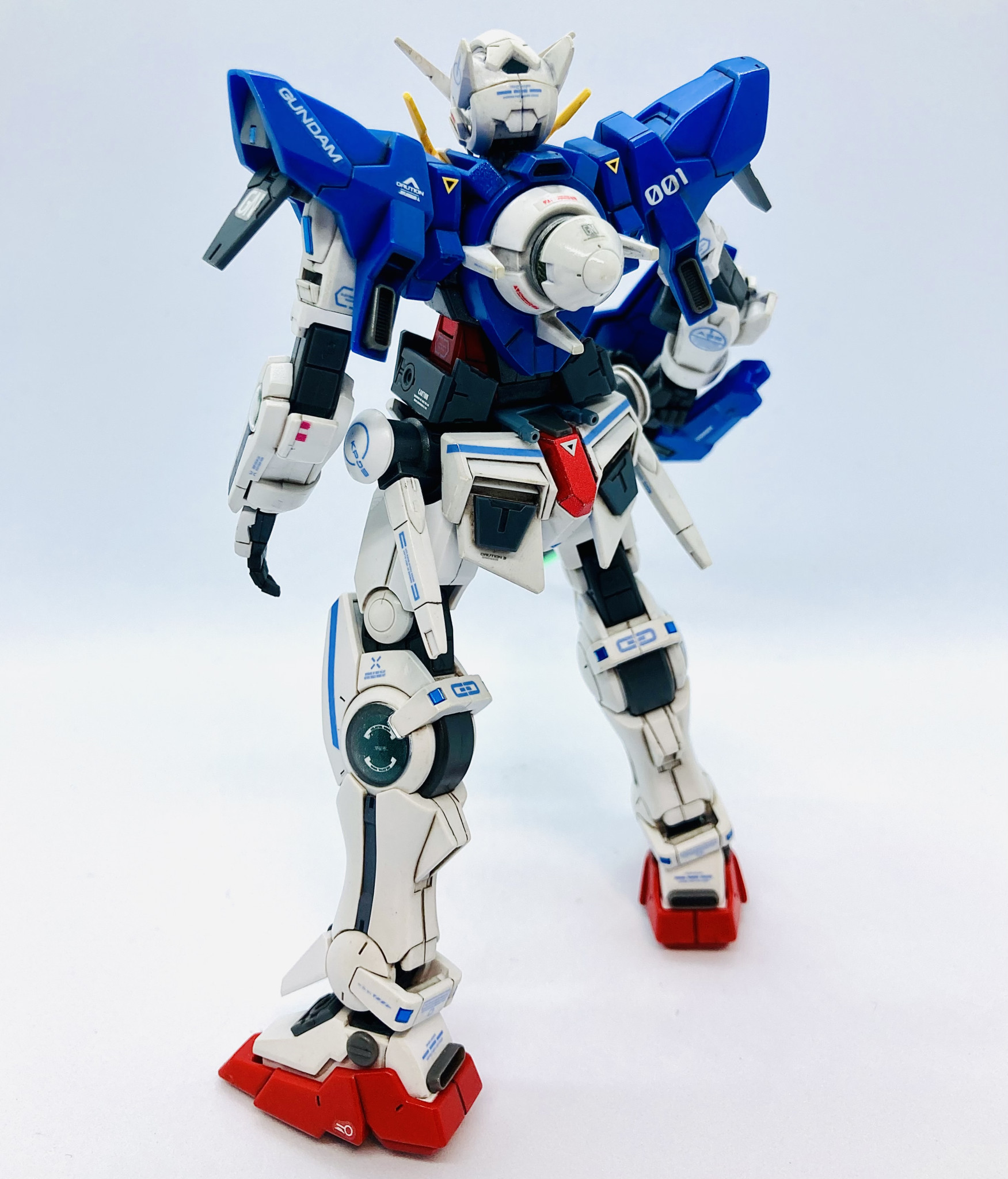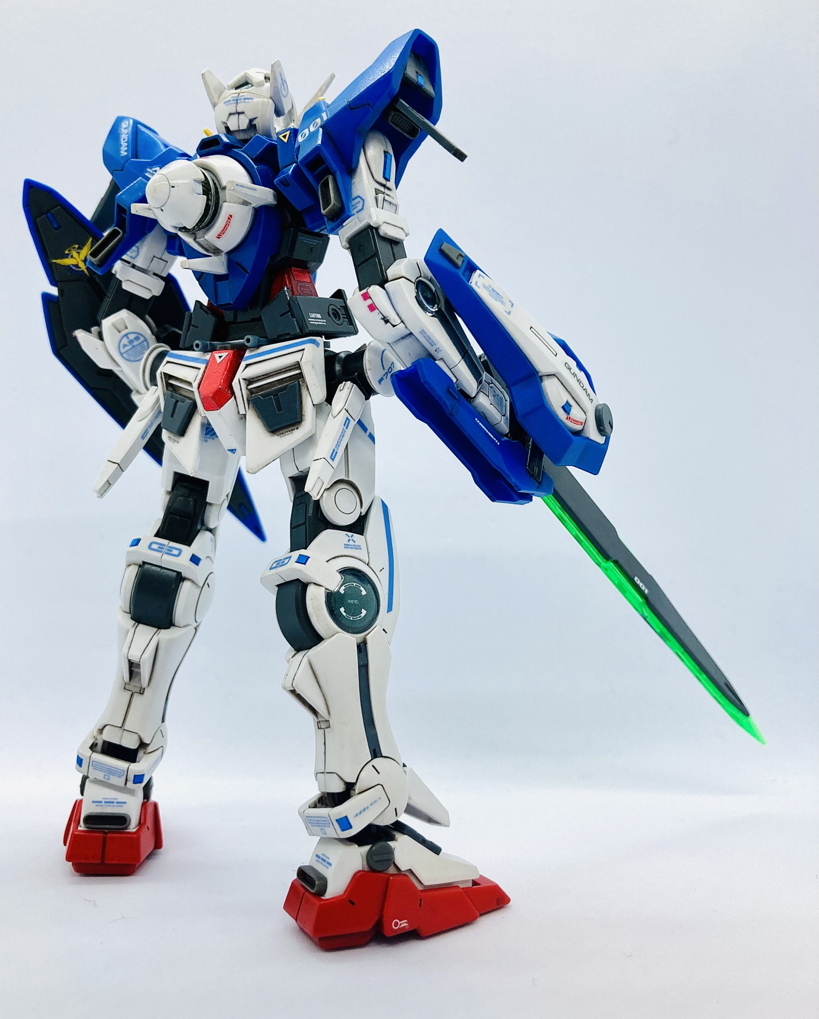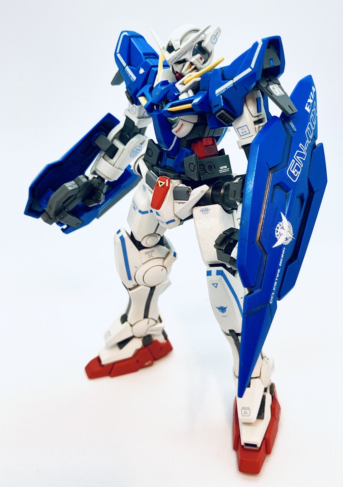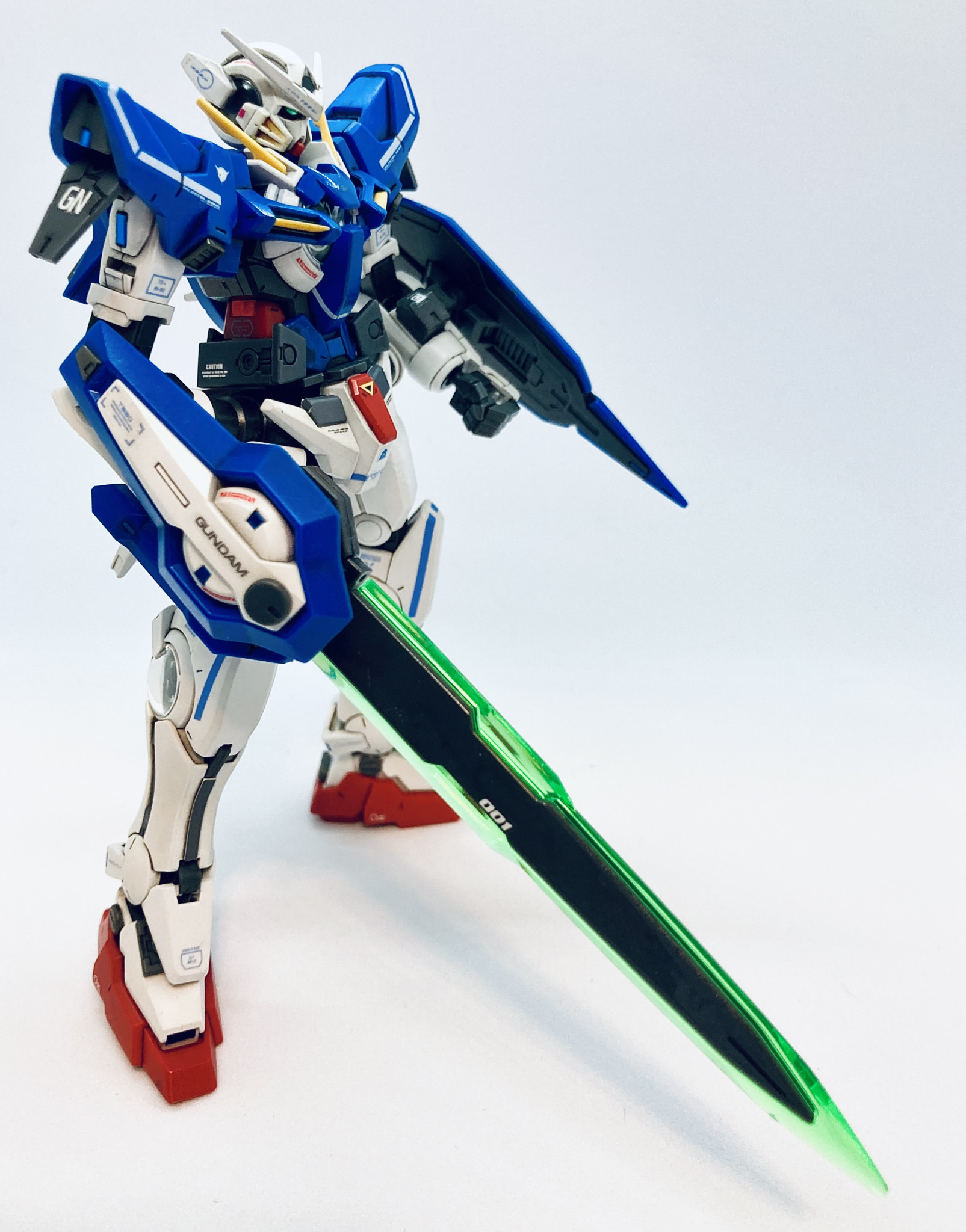 両肩の先、上腕二頭筋💪、膝やくるぶしの後ろ、GNソードの表面に、以前作製したエクシアで使用したカスタマイズマテリアルのメタリックシール(青)を貼りました。
