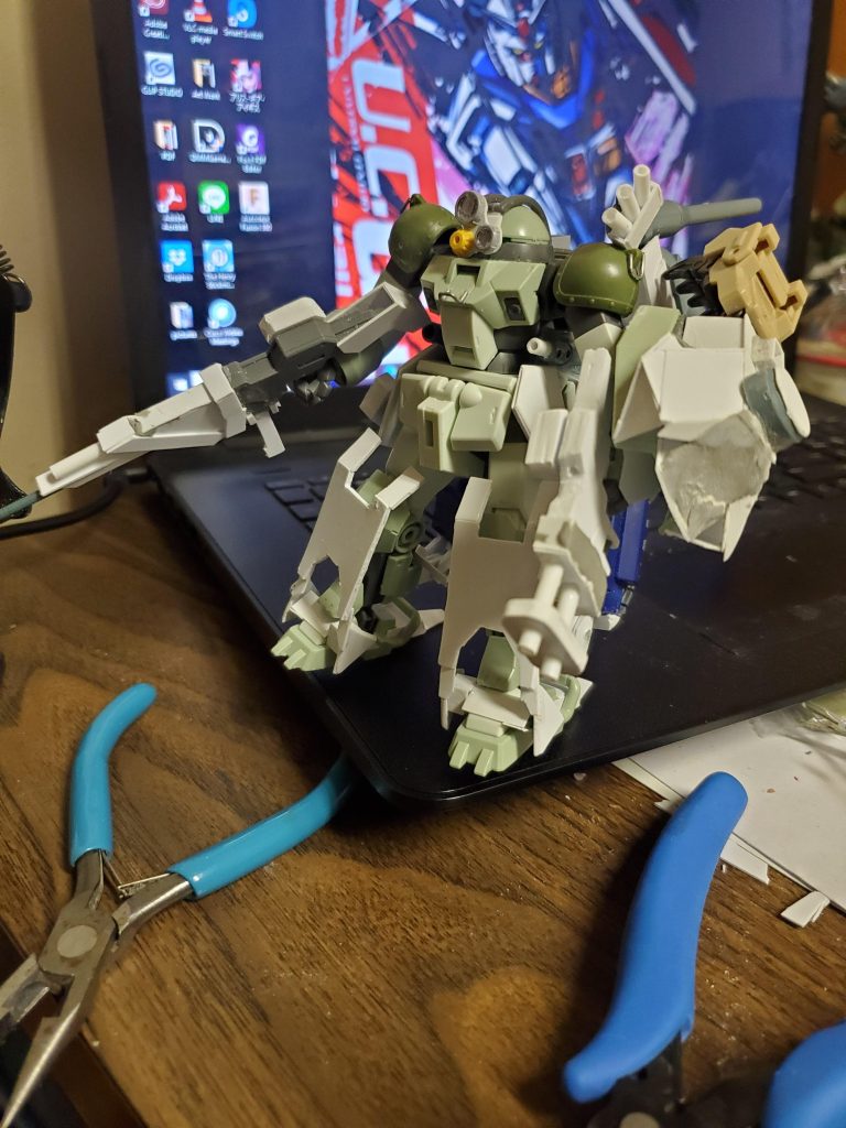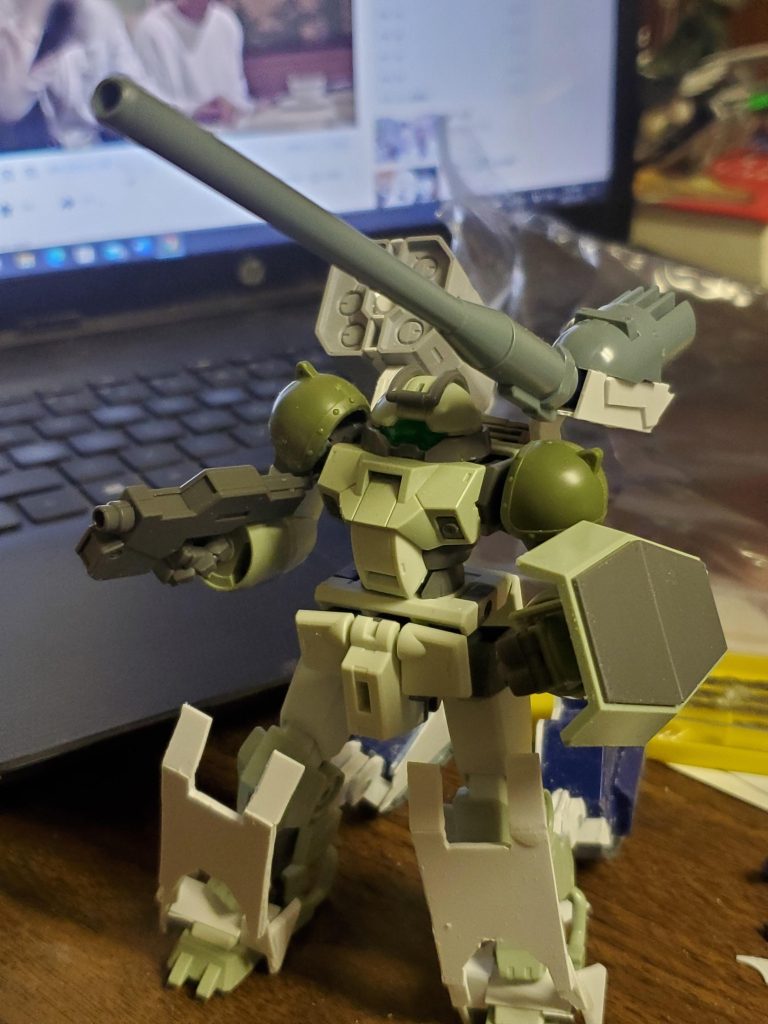 武器はスクラッチしたものもありますが、他はガンタンクのジャンクパーツ、シールドのアーム部分はこれは使えると思い購入した他社のサポートパーツ用キットです。思ったよりインパクトの大きい武器になってしまいましたが😅
