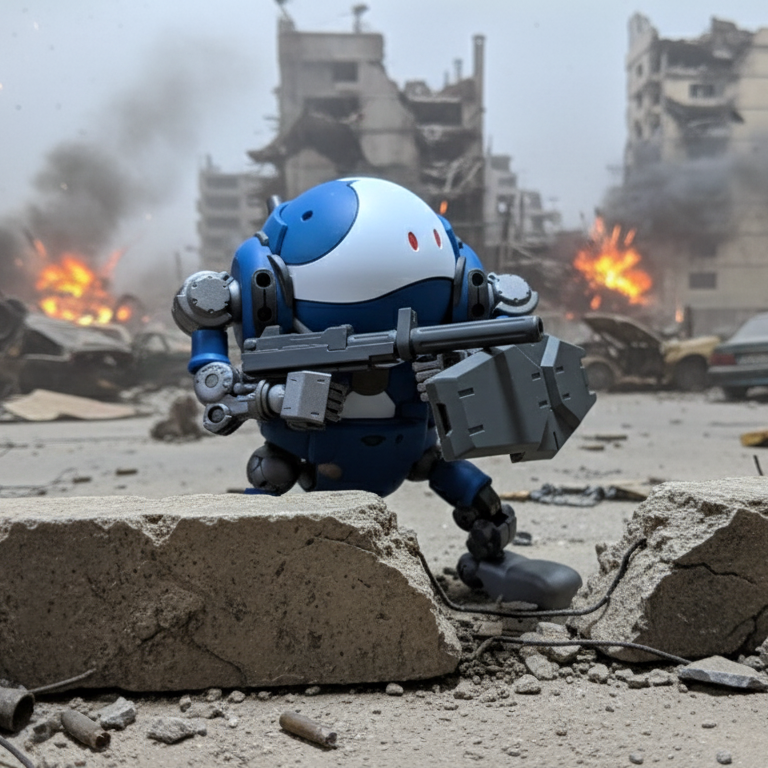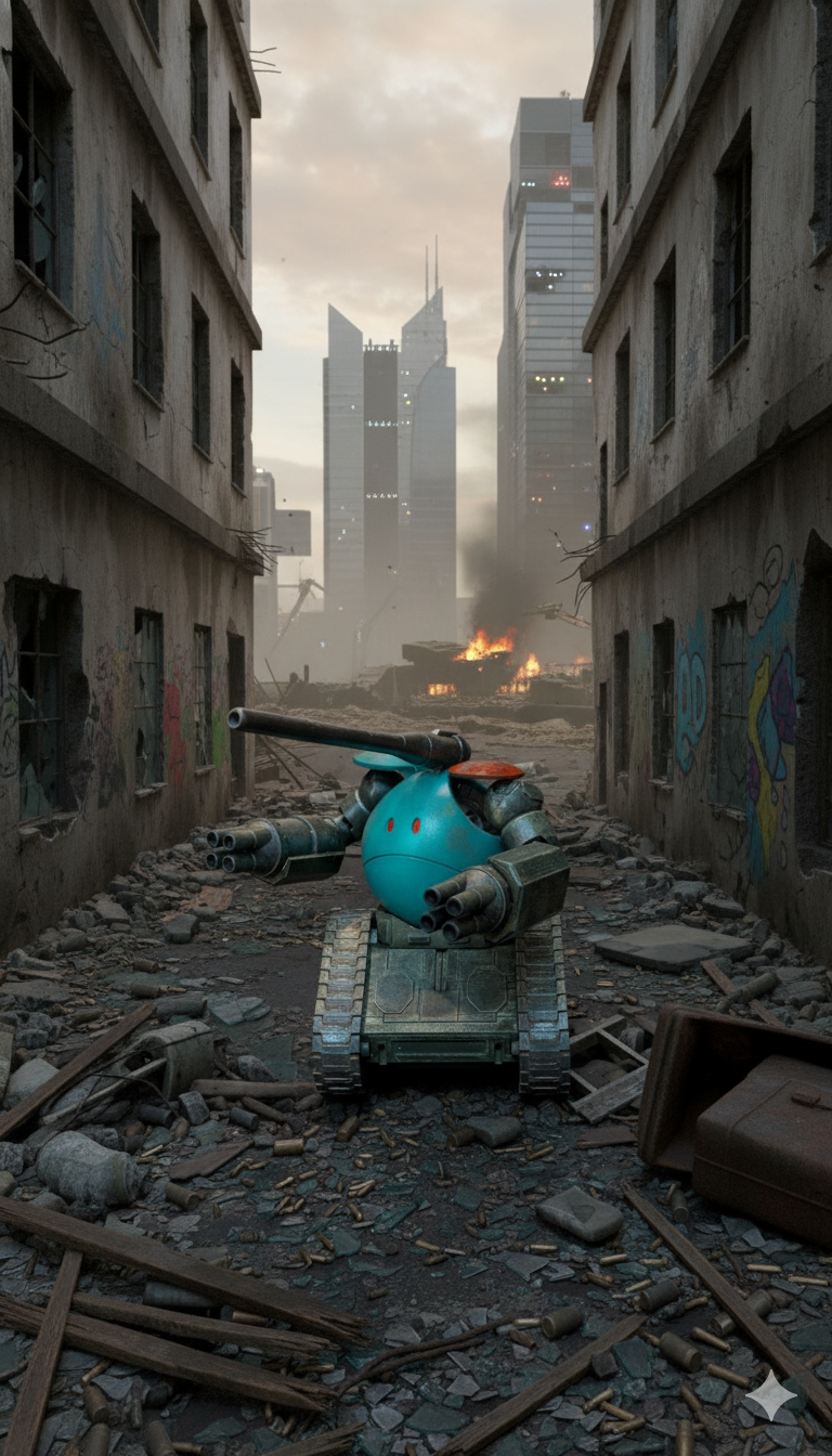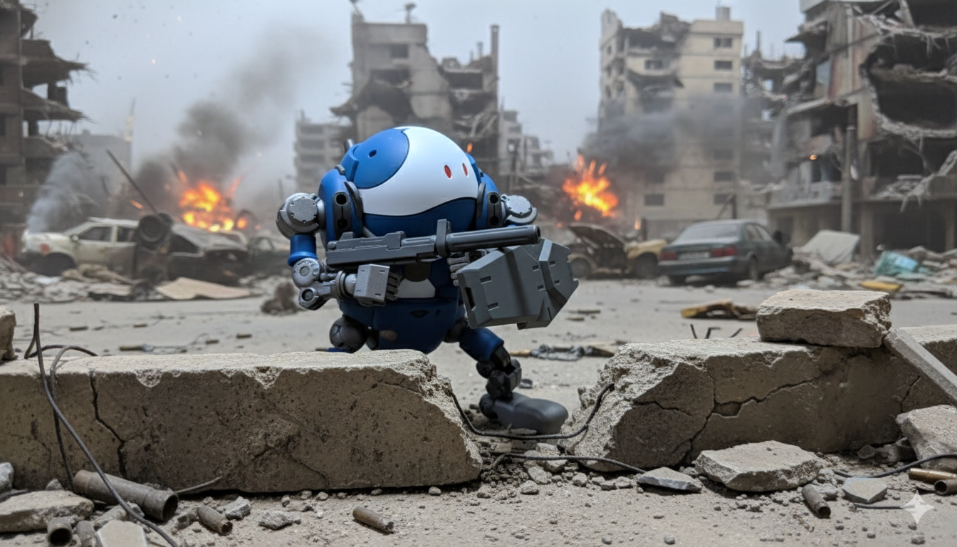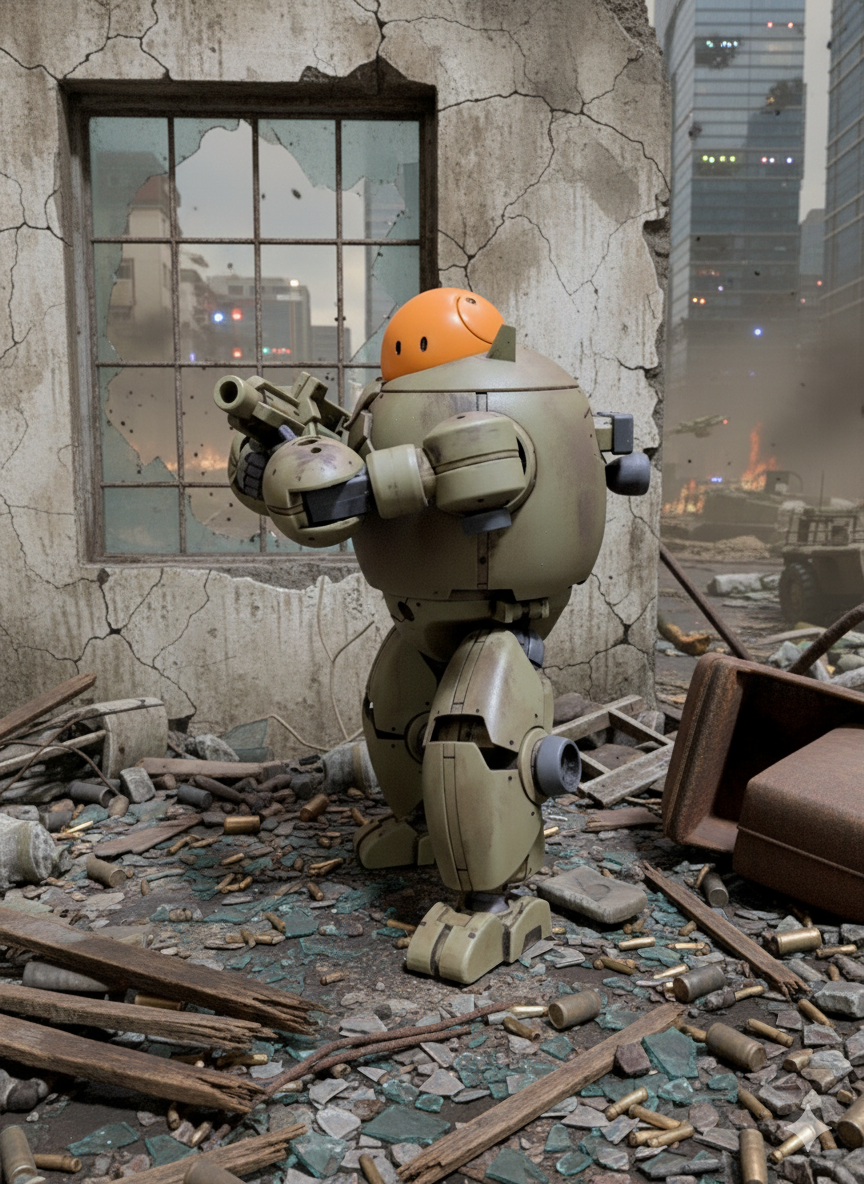 Gemini Nano Bananaに渡して「背景を削除して」→「背景を市街戦闘区域にして」「足元に瓦礫を入れて」など指示すると…