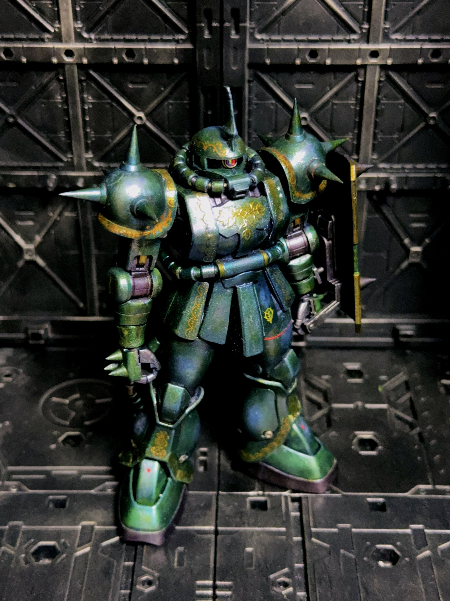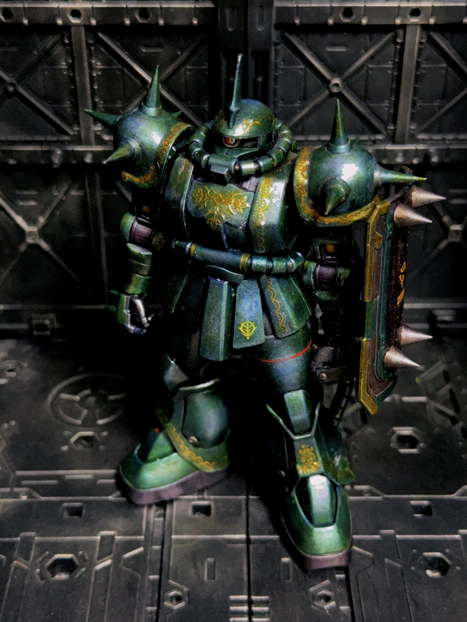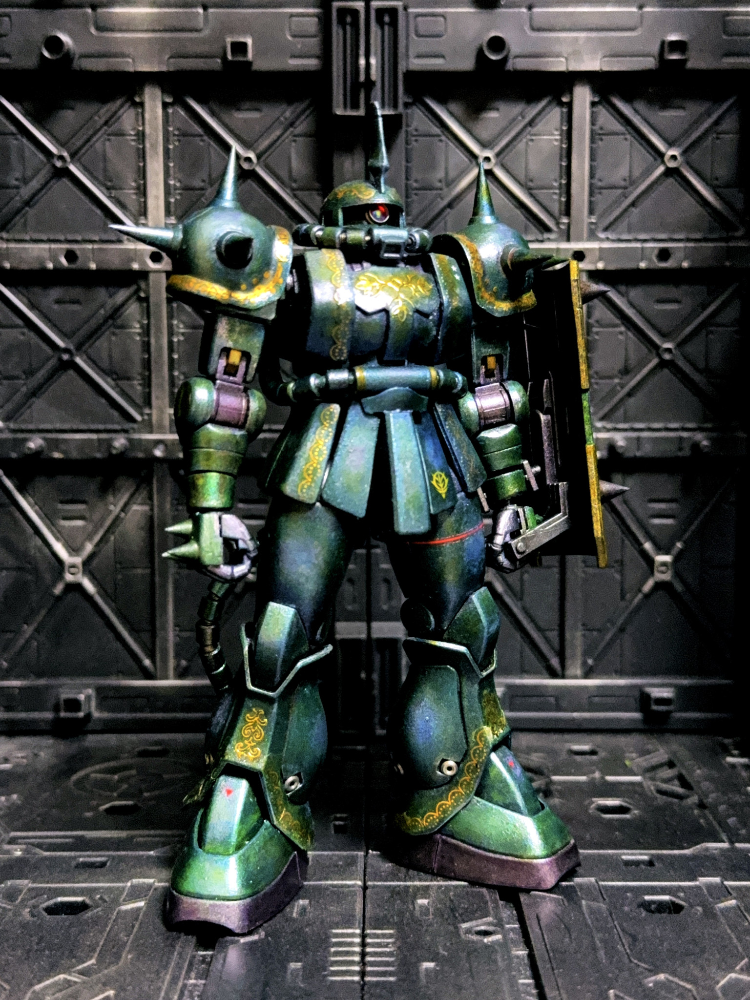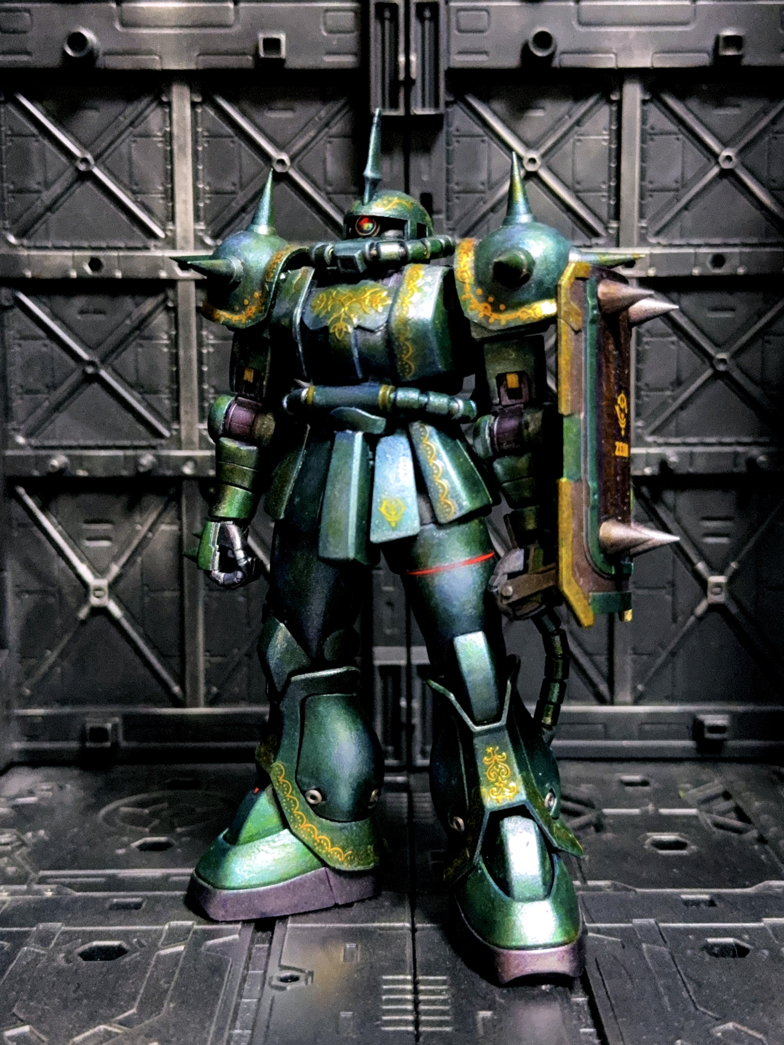ドズルの重厚感と式典用とは言えそれなりに使い込まれた金属感を出すために、塗装で陰影を強調し、緑の単色にならないように、光の当たり具合で青や黄緑のグラデーションがかかるように、偏光塗料とクリア塗料で調整しました。