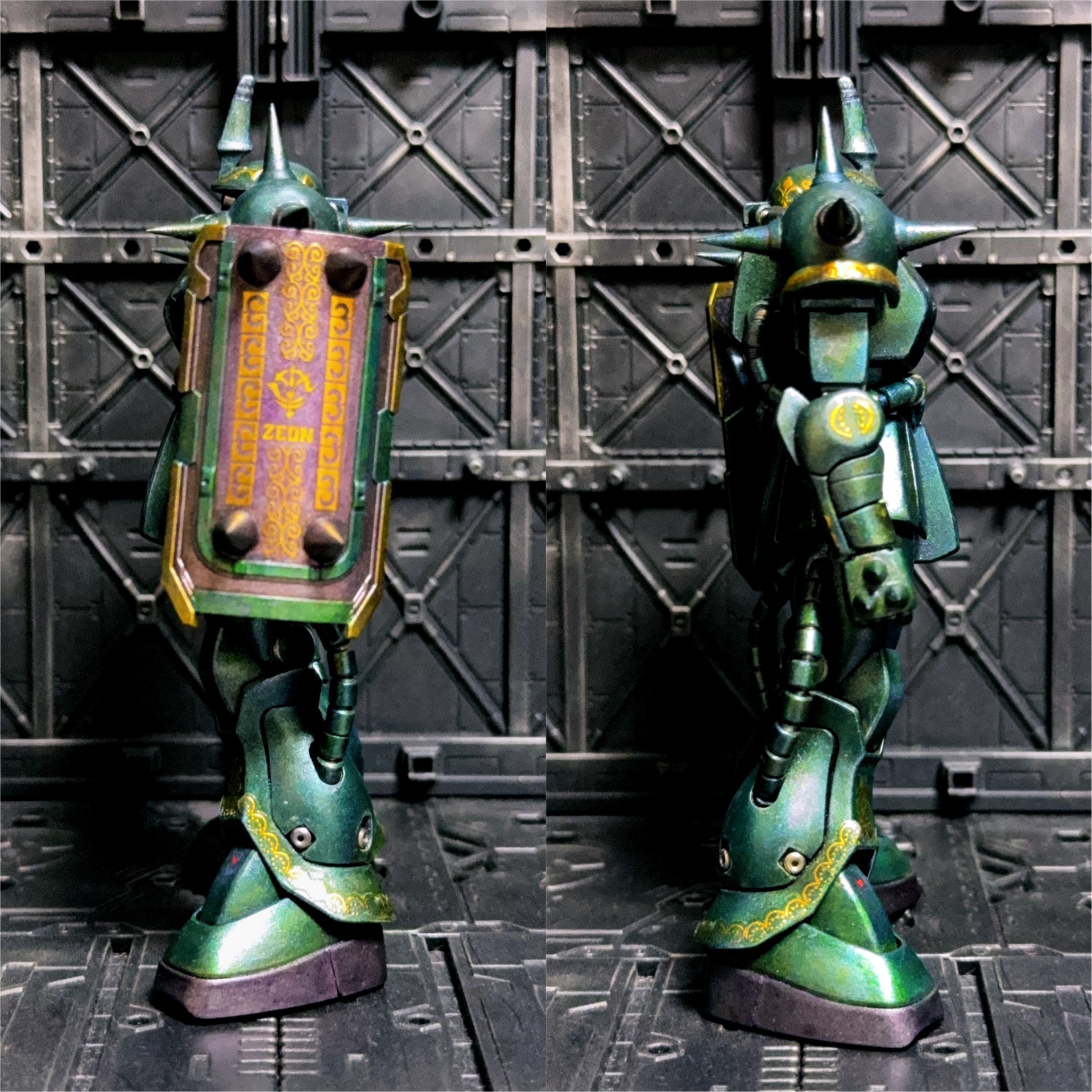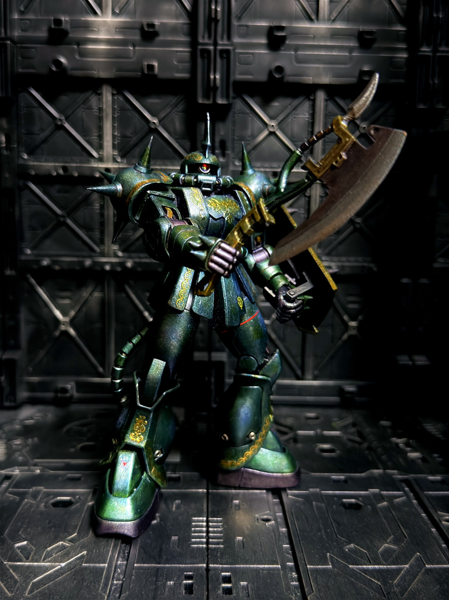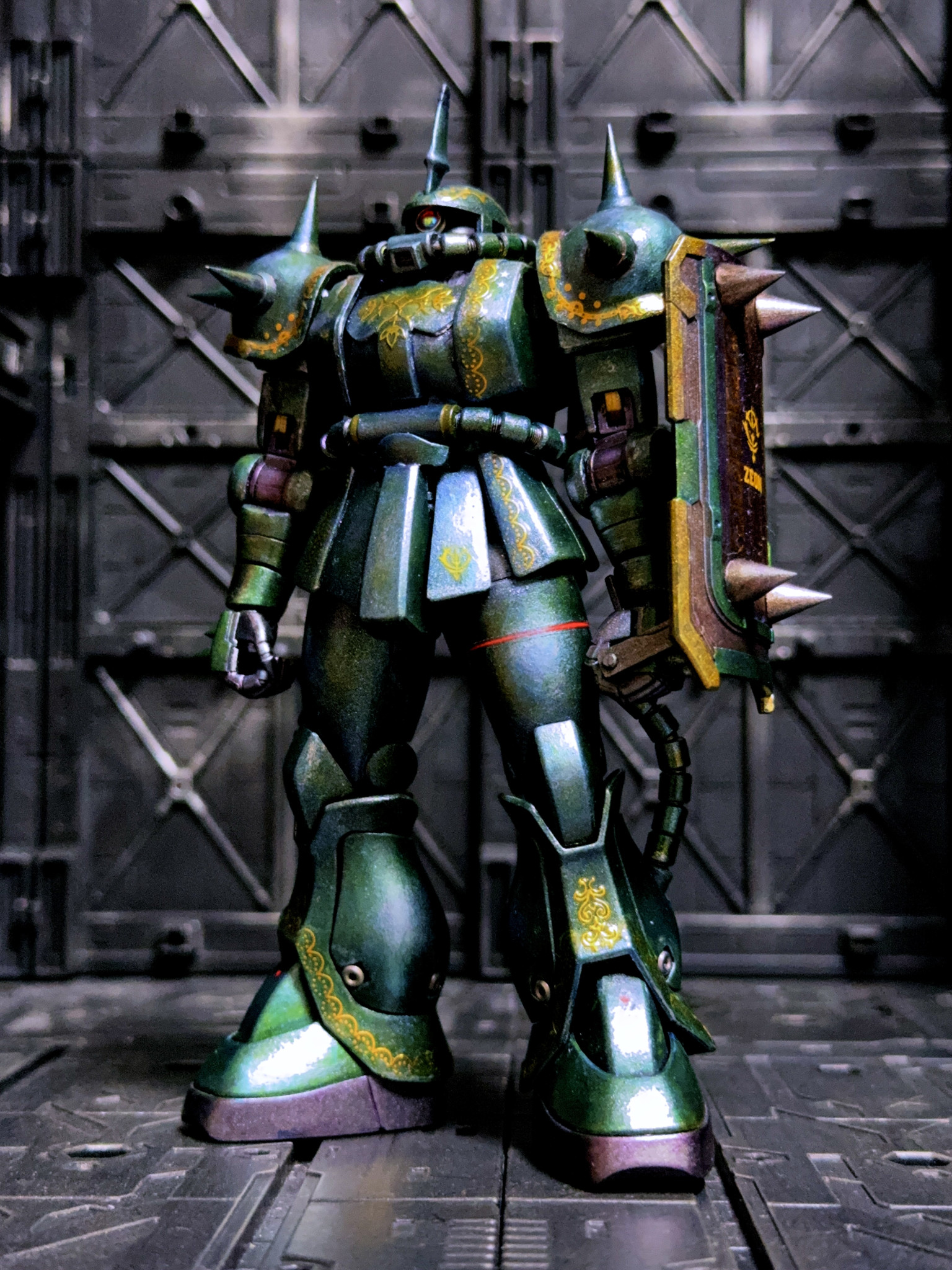 ドズルの重厚感と式典用とは言えそれなりに使い込まれた金属感を出すために、塗装で陰影を強調し、緑の単色にならないように、光の当たり具合で青や黄緑のグラデーションがかかるように、偏光塗料とクリア塗料で調整しました。