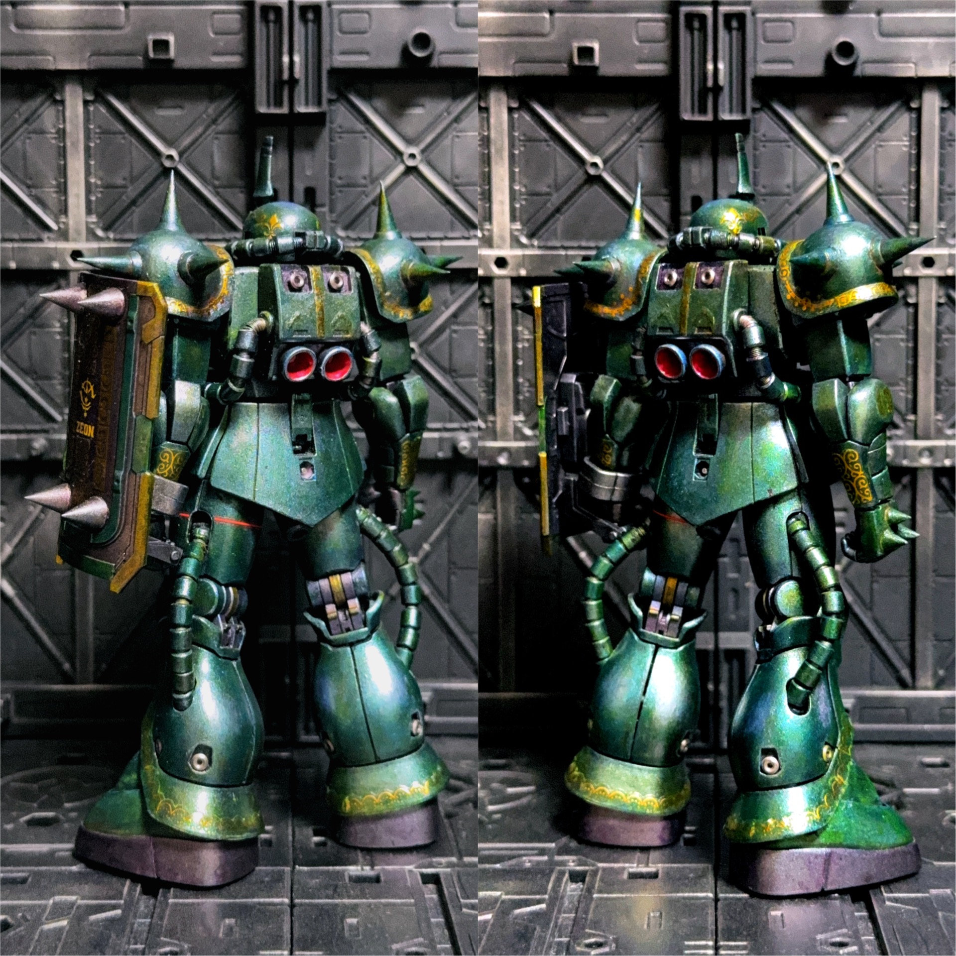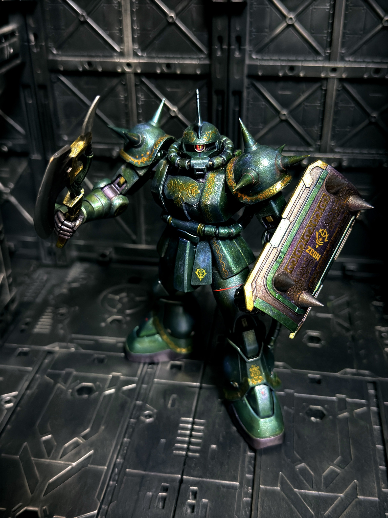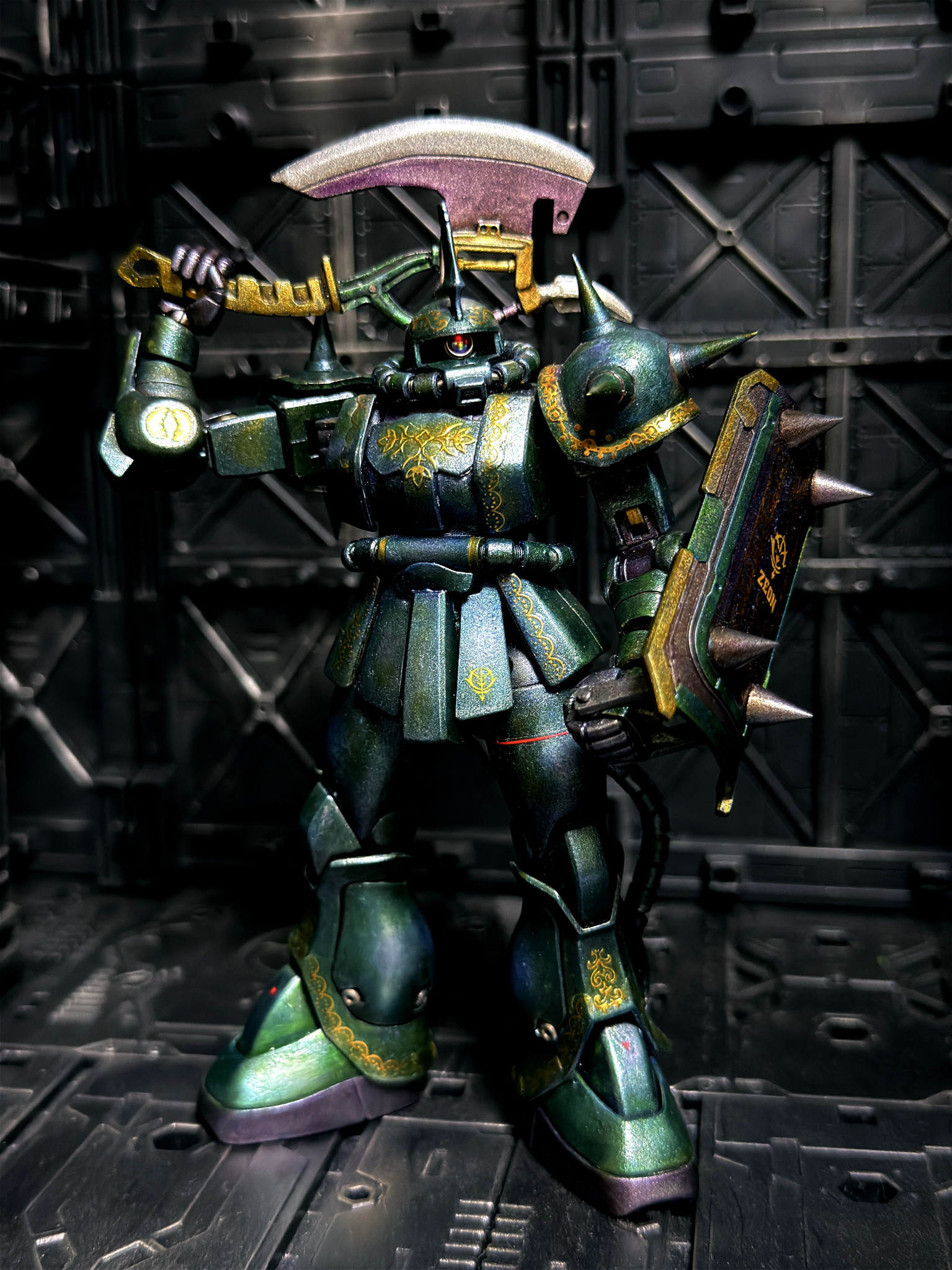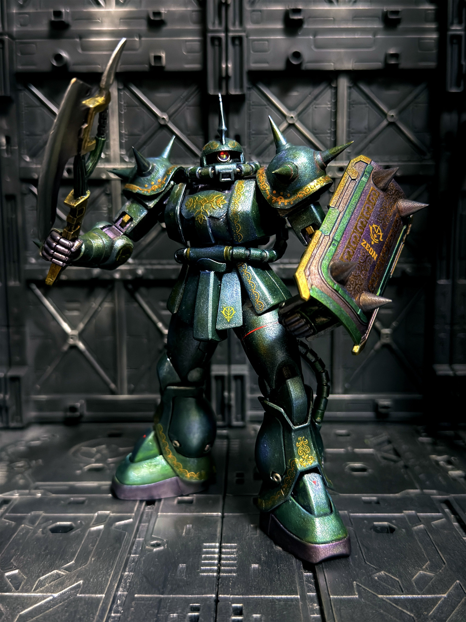 ドズルの重厚感と式典用とは言えそれなりに使い込まれた金属感を出すために、塗装で陰影を強調し、緑の単色にならないように、光の当たり具合で青や黄緑のグラデーションがかかるように、偏光塗料とクリア塗料で調整しました。