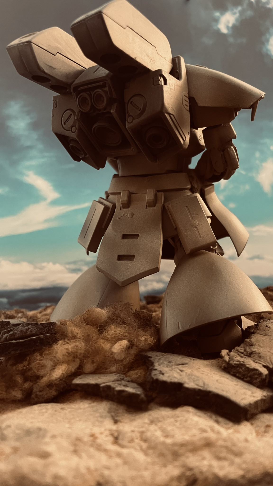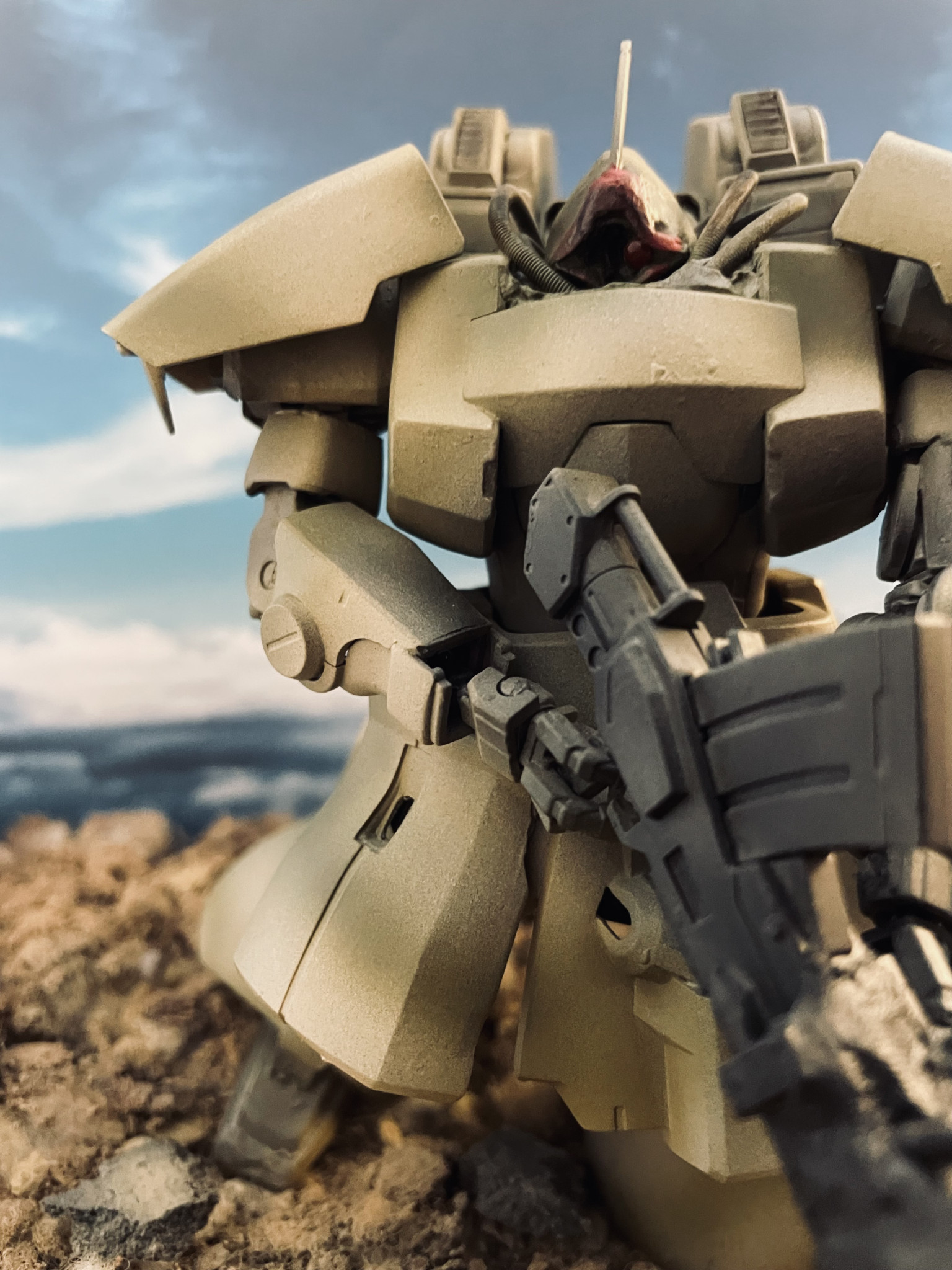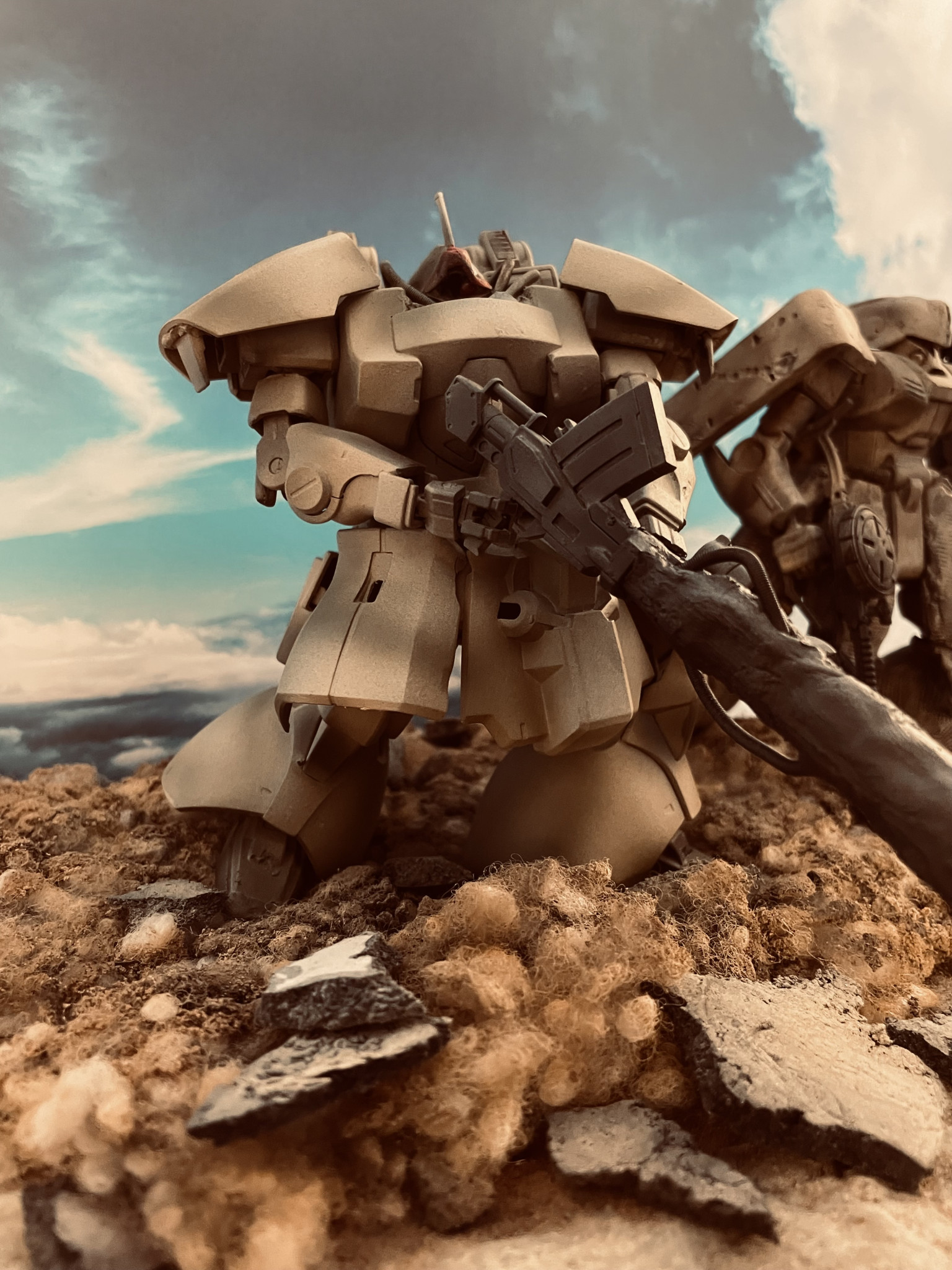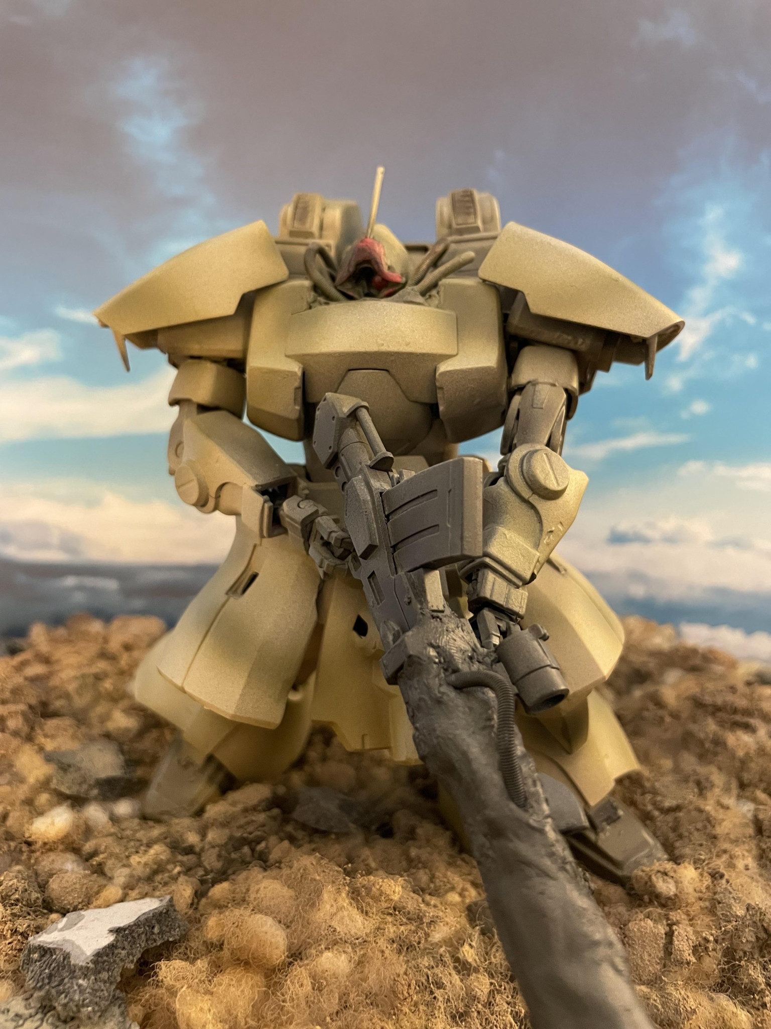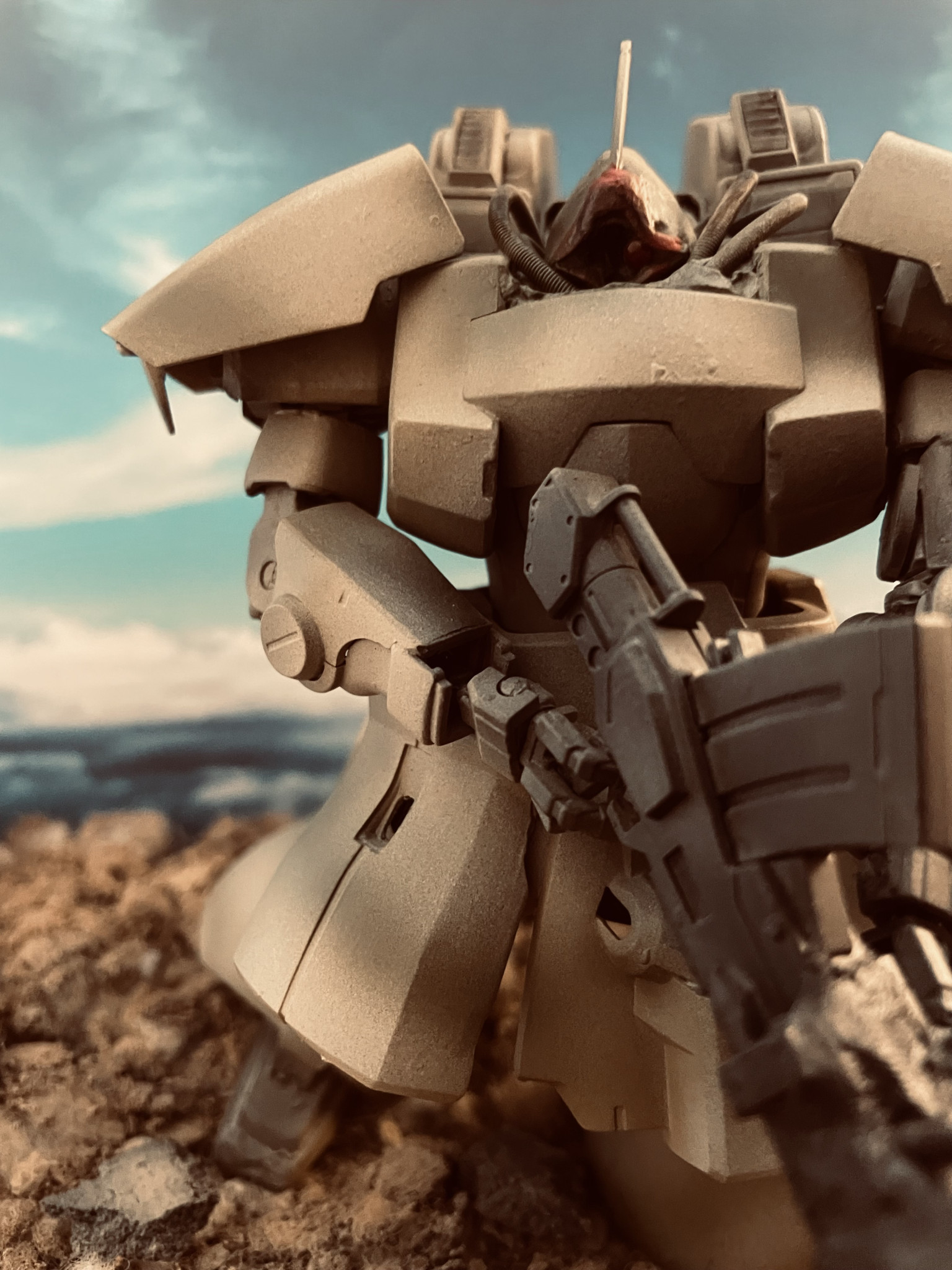 正面です。タンをベースにダークグリーンで迷彩線を軽く入れています。筆塗りでよりはっきりとグリーンの迷彩線が判別できるようにした方が近藤氏のイラストに沿ったイメージになるかもしれません。HGドムの頭部はそのままだとサイズが過大となり近藤氏の描くドワッジらしさがでませんので幅を縮小し所謂「小顔」になるよう調整しています。バイザーはガンダムカラーのつや消しレッドで着色しています。モノアイはHアイズの2.5mmです。