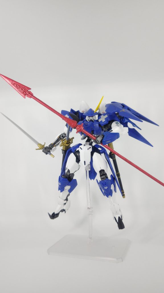 メイン武器である朱色の槍は「マクギリス・ファリド事件」の際に、鉄華団鎮圧に使用されたダインスレイヴをどさくさに紛れ偽物とすり替え、槍とて鋳造したものである。