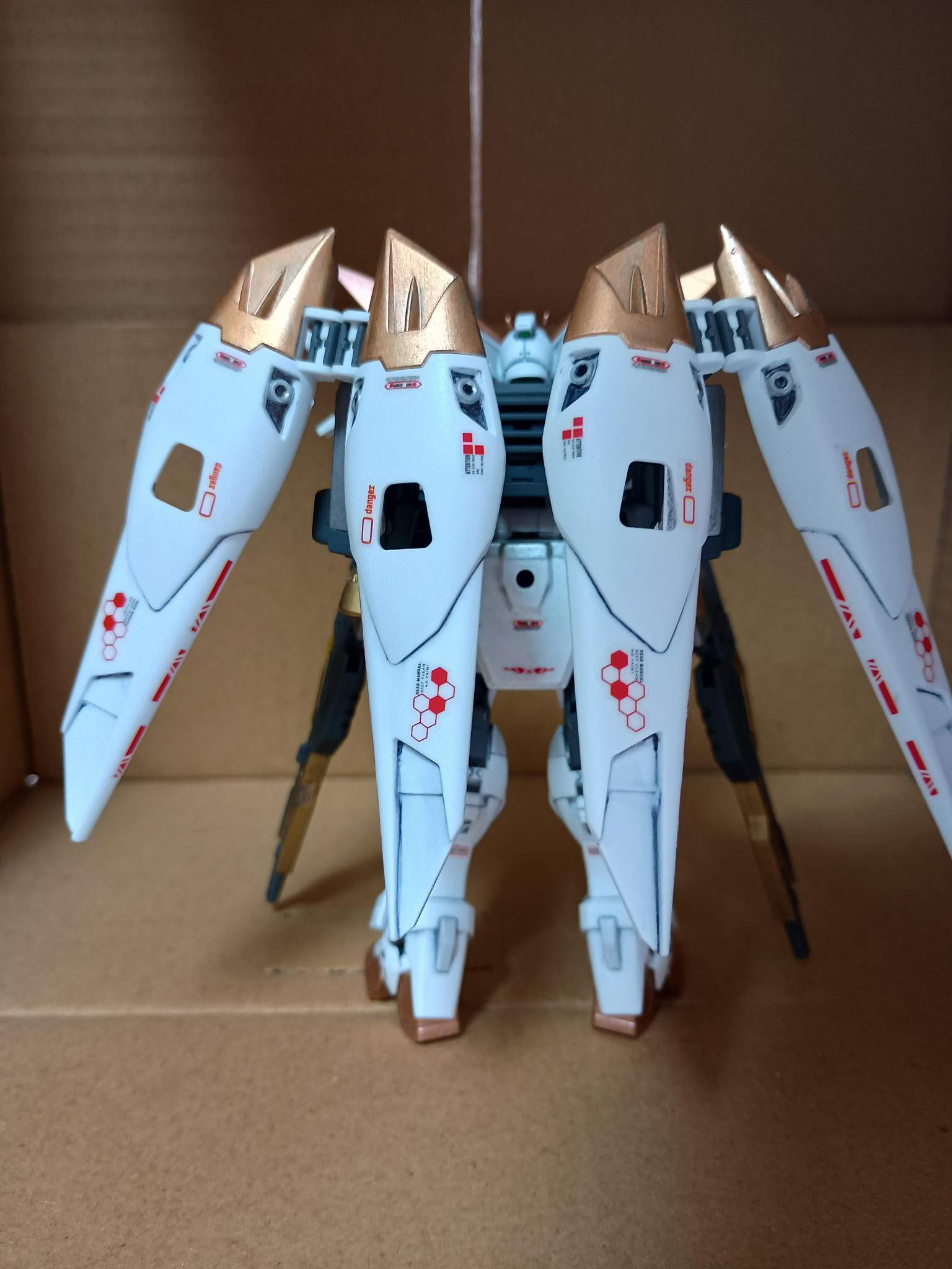 バーニア内は赤で塗った後に、やっぱり青にすればよかったと後悔。あとショルダーアーマーはシルバーかグレーに塗った方がよかったなぁと。金のパーツが家紋みたいになってますね。