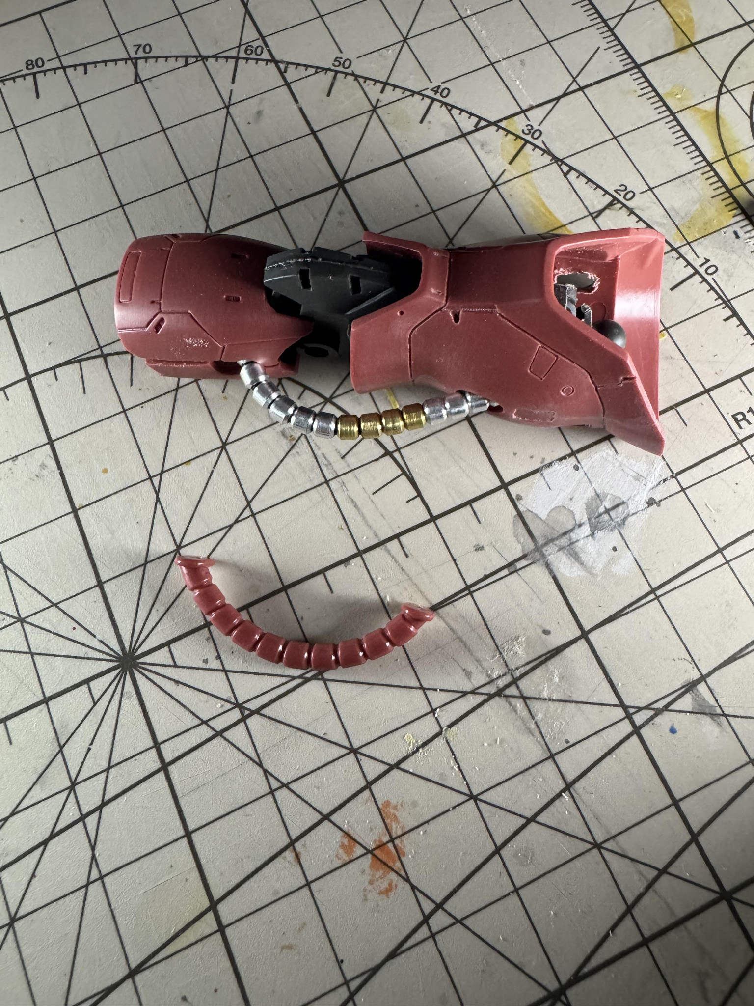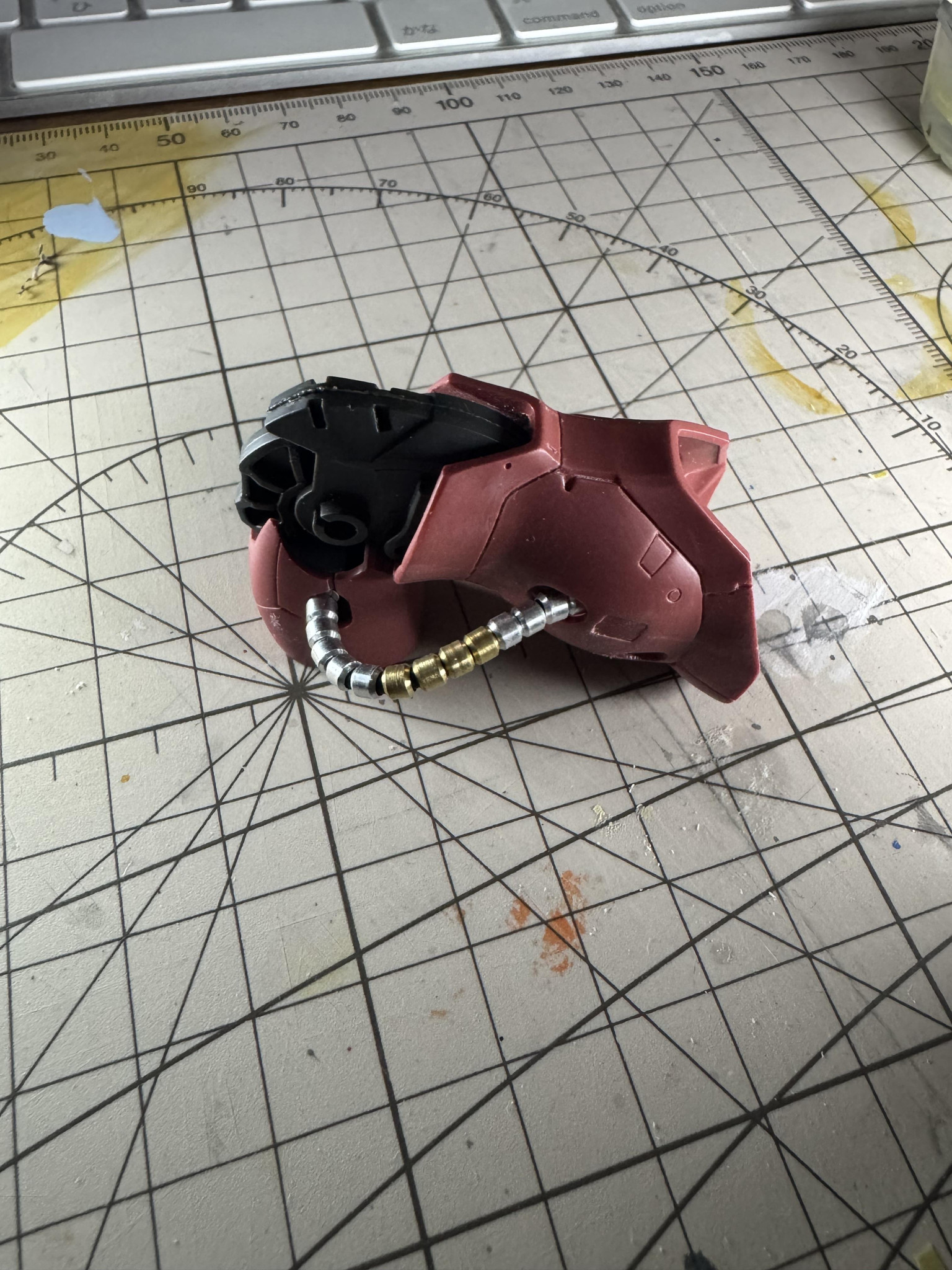 腕の関節左右のモールドは消して掘ってメタルパーツを埋め込みました。