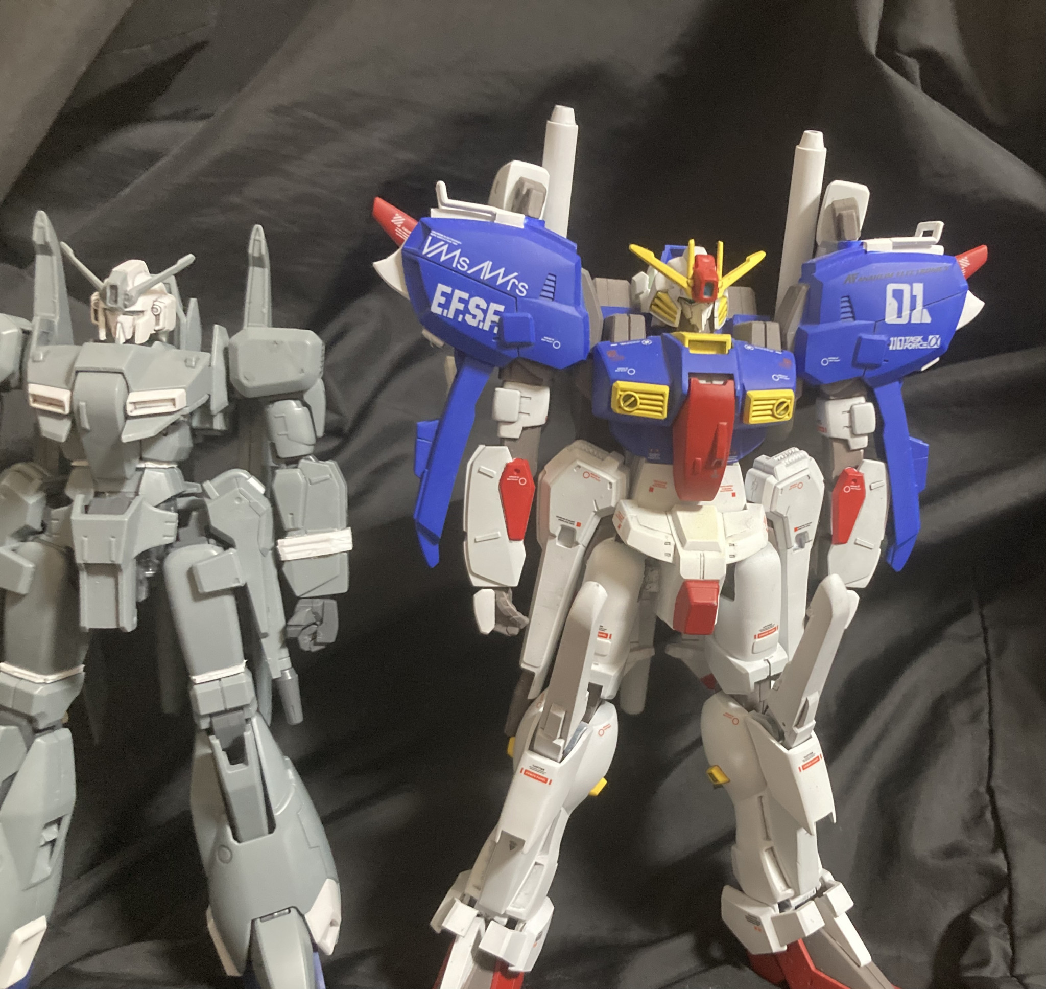旧キットとhgのミキシング細かいディテール追加やプラ板工作は得意ではないのでプロポーションの変更で勝負です。塗装はセンチネルの頃の設定画を参考にしている為HGや現行キットで色が付いている箇所に色が付いていない場合がありますがミスじゃ(ないです)。