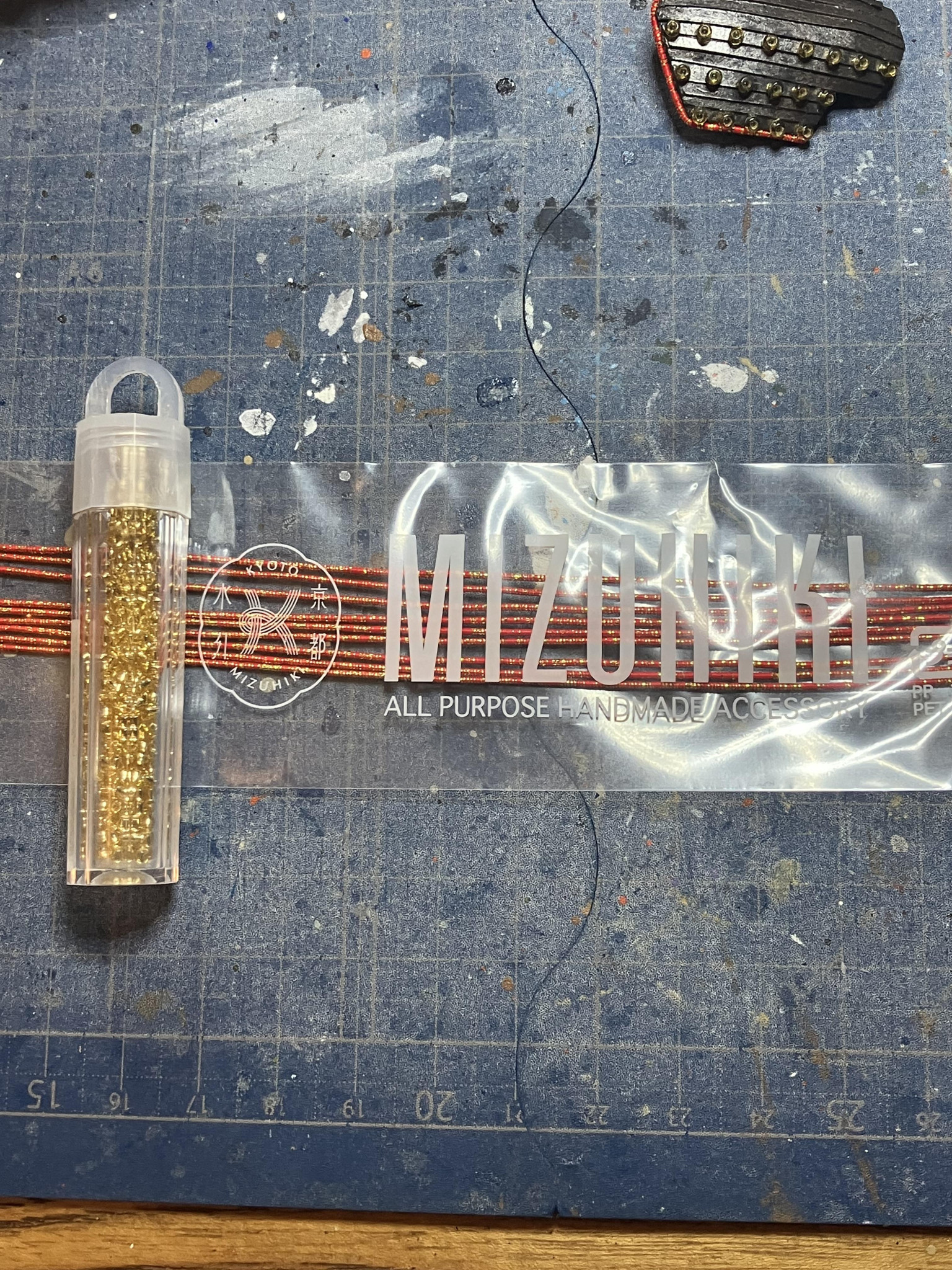甲冑の装飾にビーズと水引き紐を使い方ました