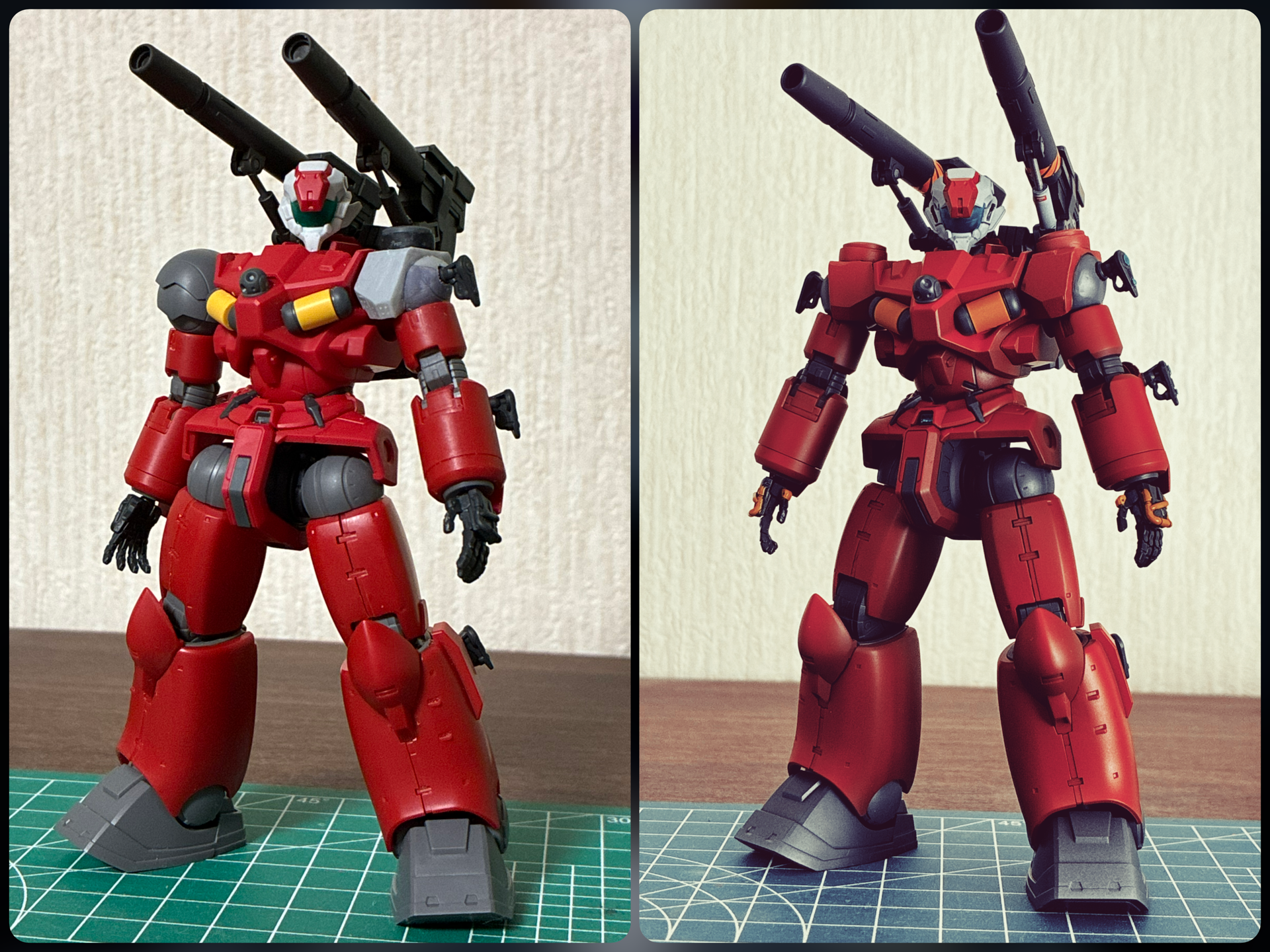 軽キャノンとオリジン版をミキシングして、GQガンキャノンを作成。オリジンガンキャノンは素材用ではなく完成させたいので、切った貼ったは無しにしましたが、肩の形状は違いすぎるので、自作しています😃