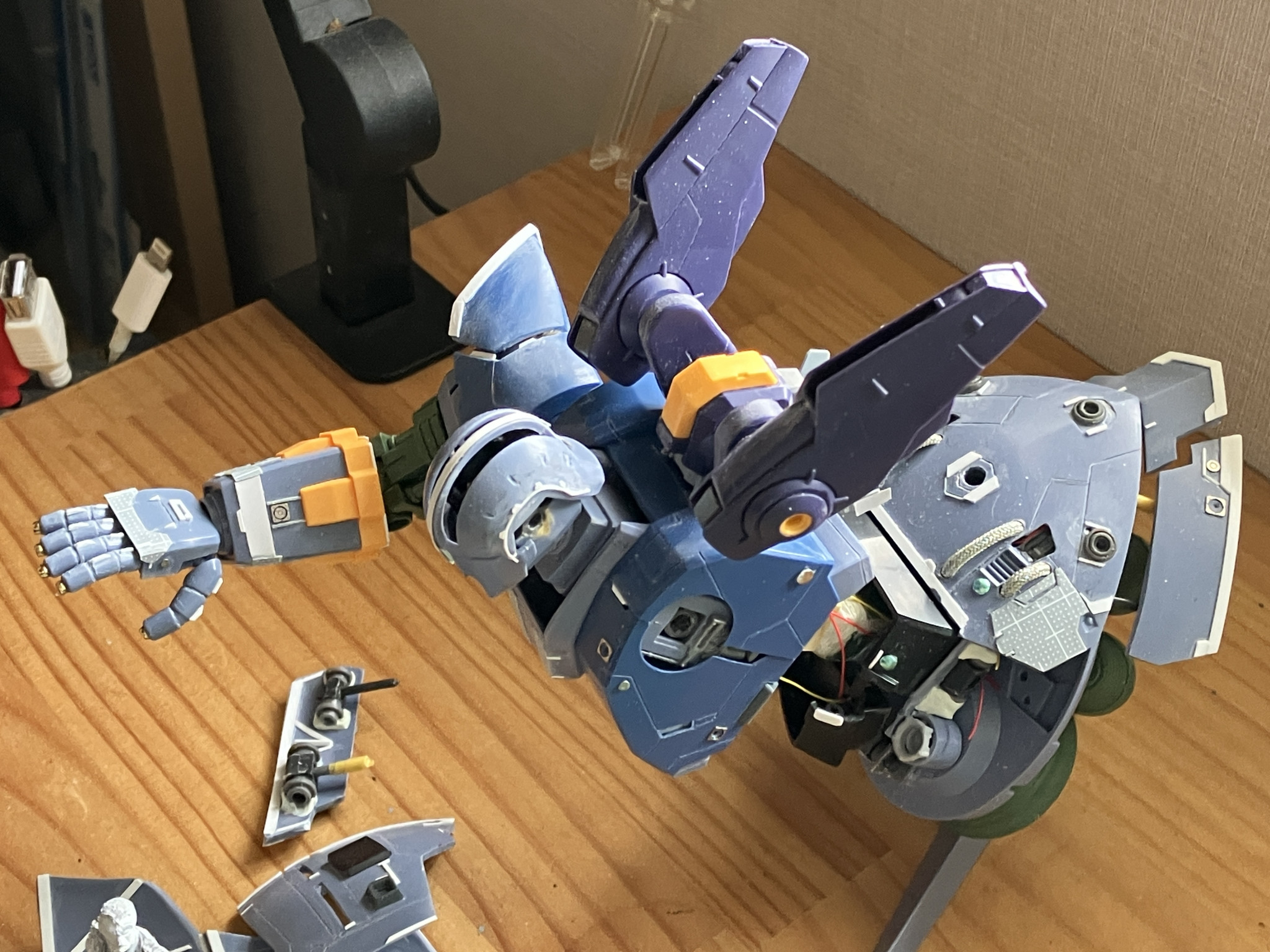 過重やバランス悪く、腕も腰もスタンドも姿勢維持できない、可動範囲も小さい、プロポーション悪い、ディーティール全般的に無いと。RGキットに比べれば沢山遊んでもらえる要素が詰まっていてお得なキットでした。写真は6月すぐ頃で、工作の完成にあと少しというあたりです。半年も塗装しないって生活がやや不安になりました笑