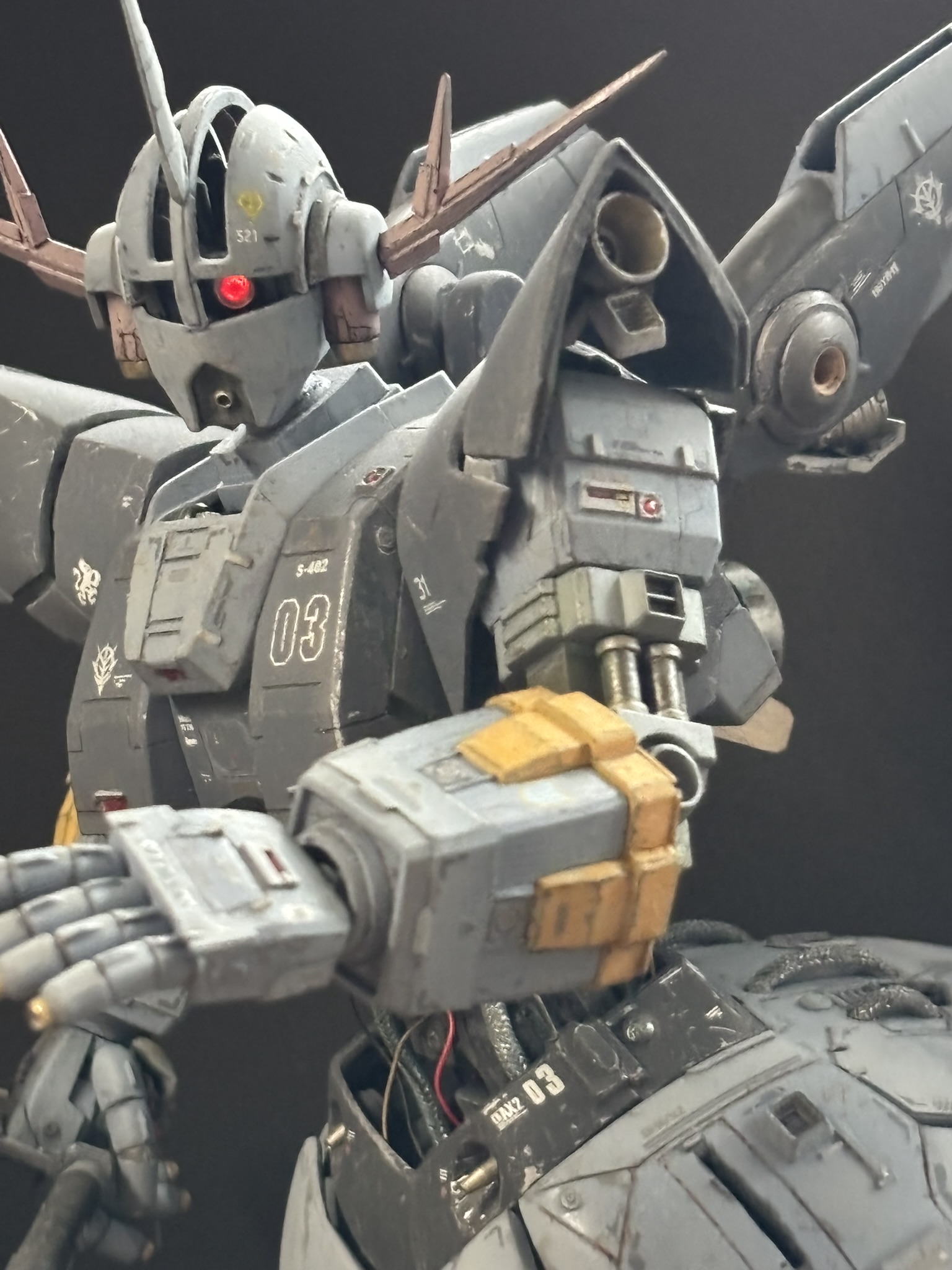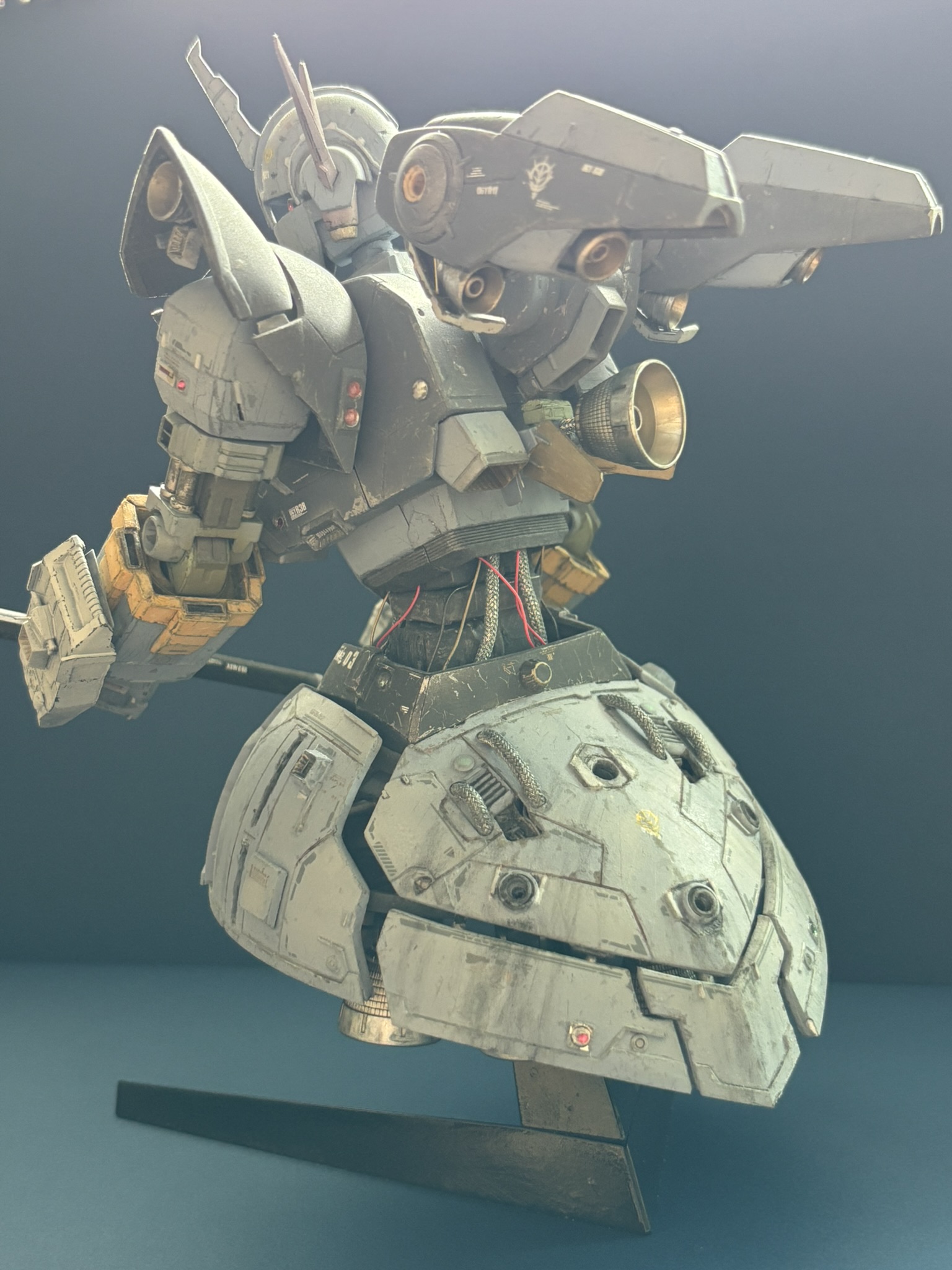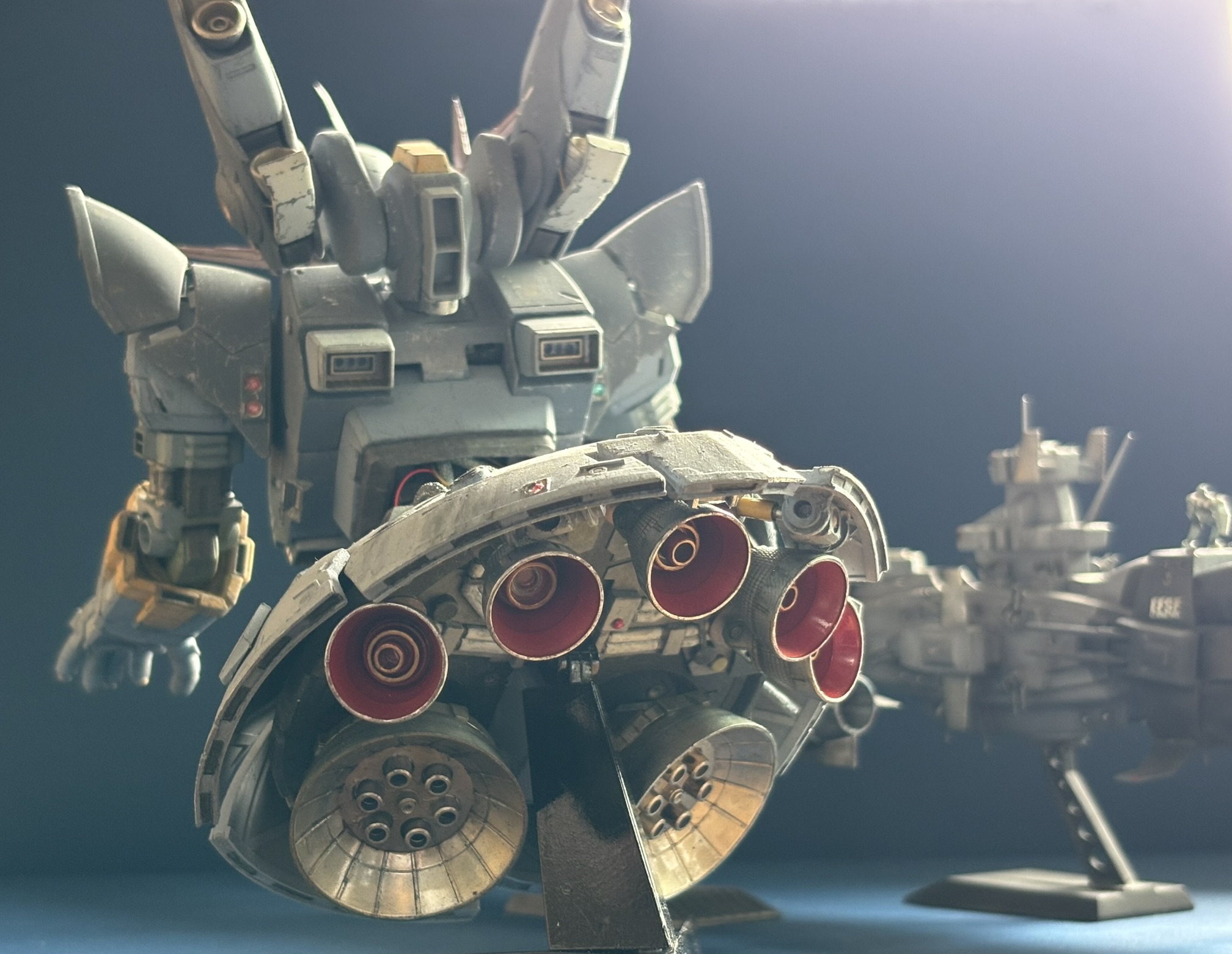 てことでジオング3号機です。彼はジオン本国で公王の親衛部隊に属し、ケーニヒス・ジオングと呼ばれてます。公王の身辺警護や帝都防衛の最終決戦といった想定任務のため、コロニー内の飛行、宇宙空間での長時間の対艦戦を可能とする追加開発に勤しんでいます。
