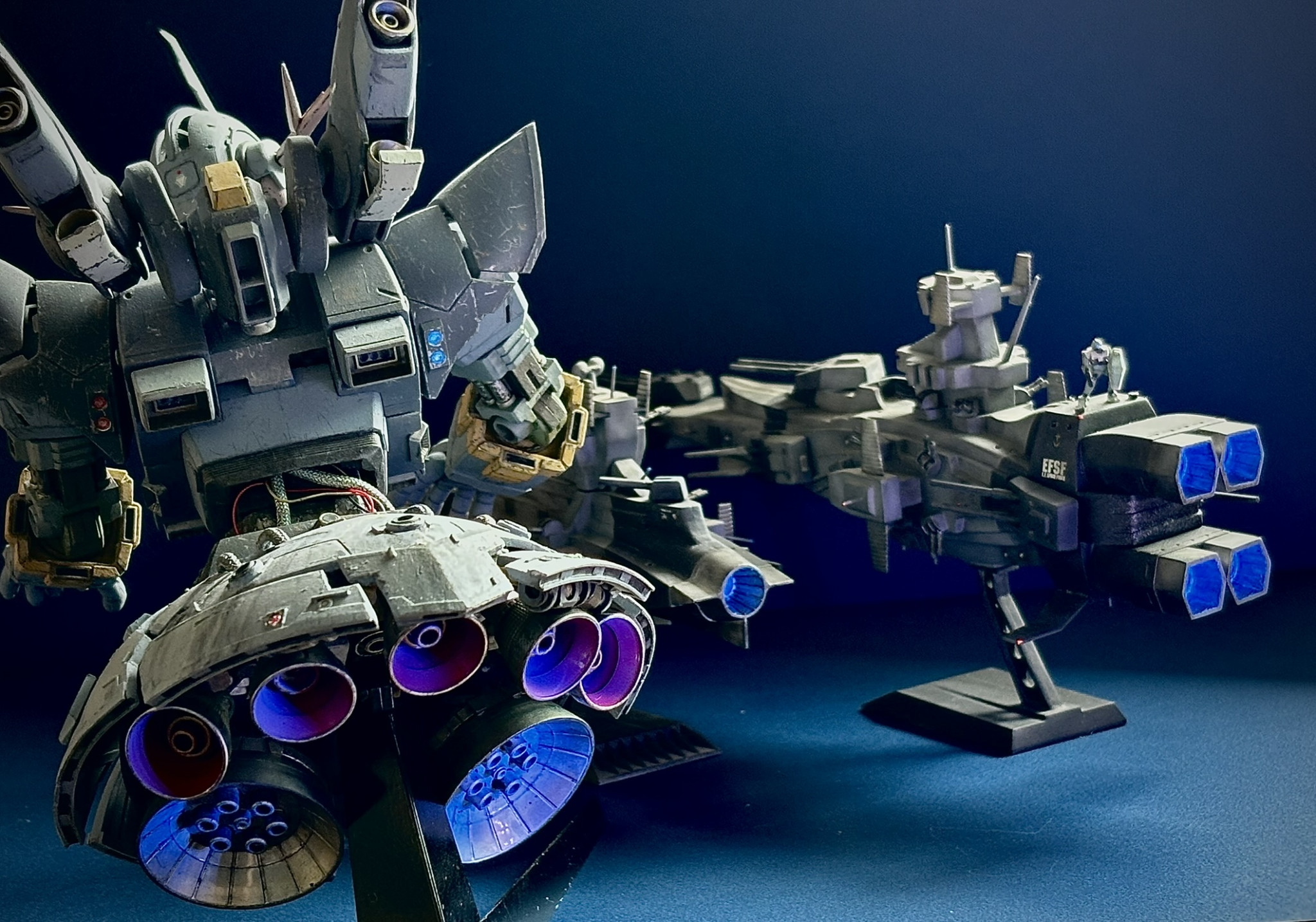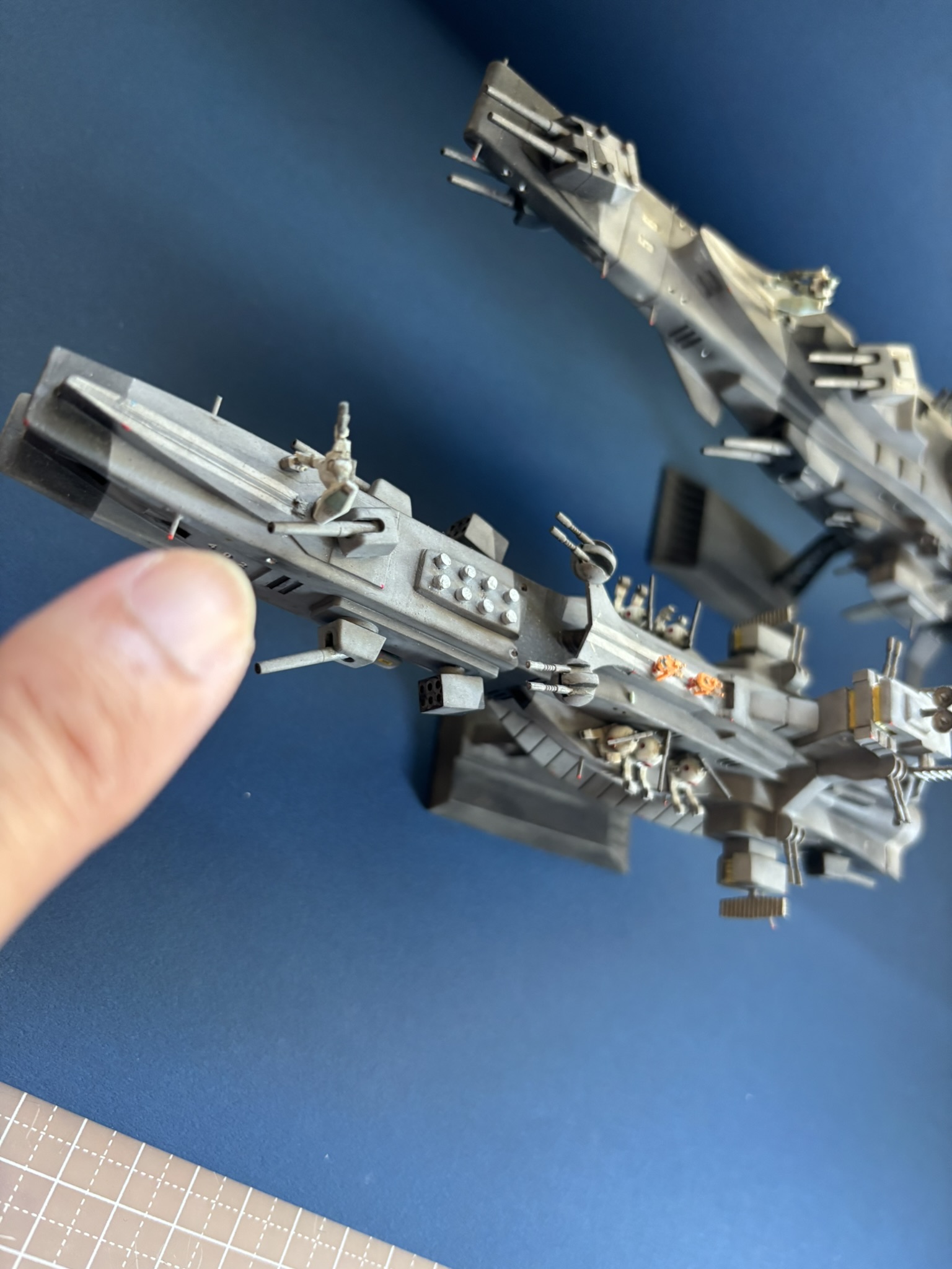 1/1200サラミスとマゼラン。以前に作ったキットですが、今回ダズル迷彩を追加、ノズルやスポンソン先端、キャビンに蛍光色発光の塗料を追加しました。