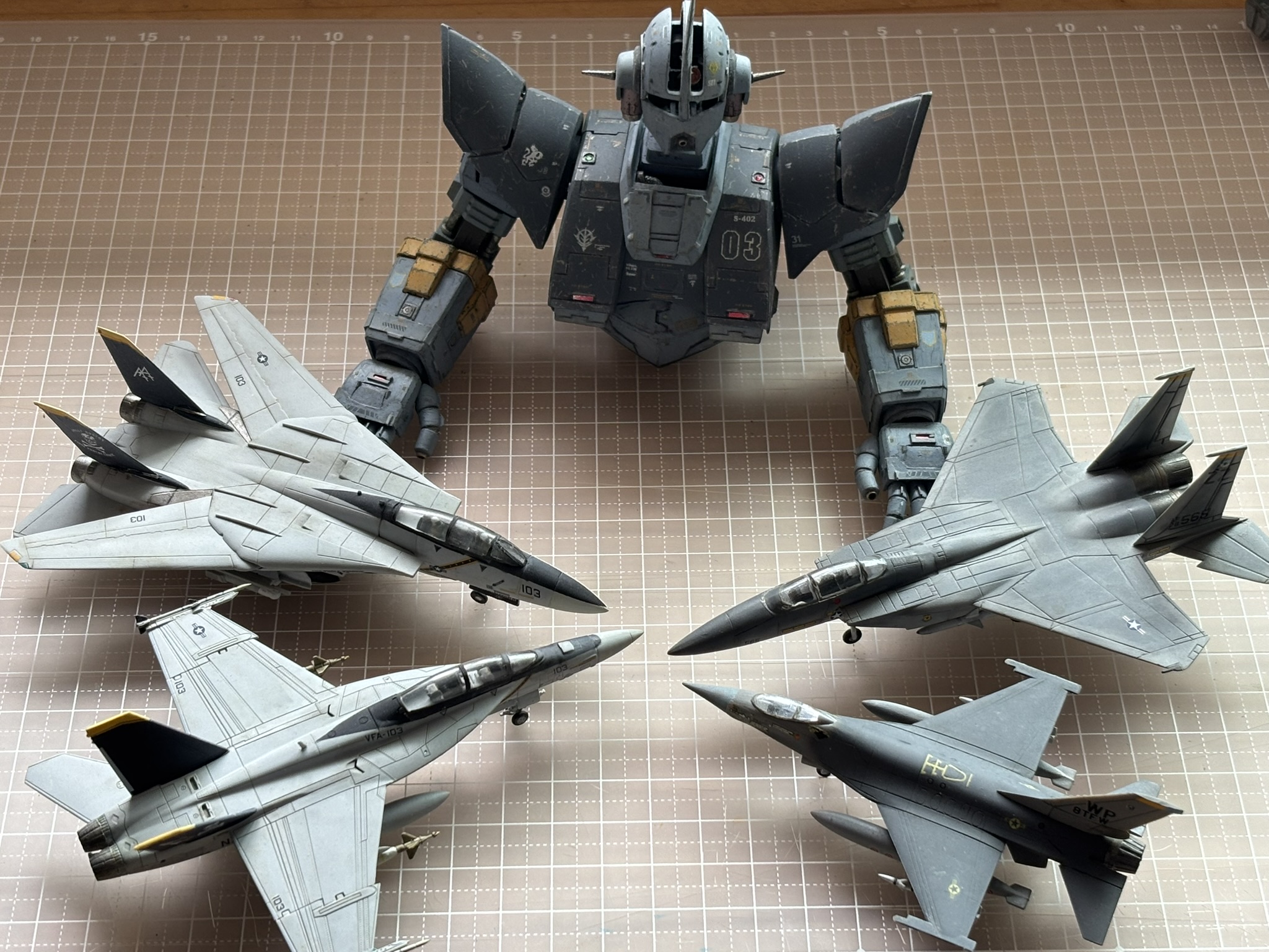 ジオングの右側が米空軍の制空迷彩F15,F16。左側は米海軍VF84所属の記念塗装されたF14,F18です。ジオングと同じ1/144スケールです。自分基準では殆ど汚してないです。