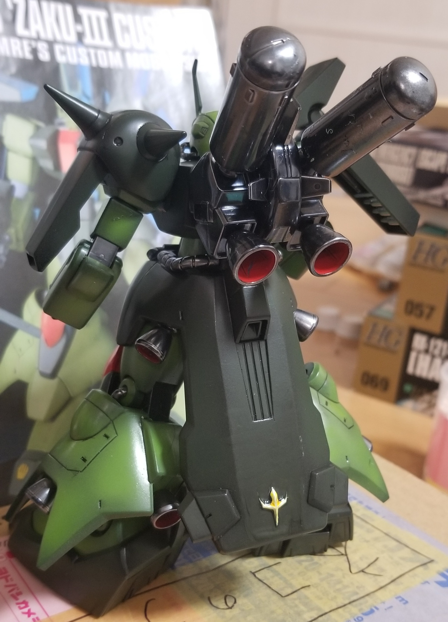 HG ザクⅢ、全塗装完成。 合わせ目消しが甘かったり、モール…