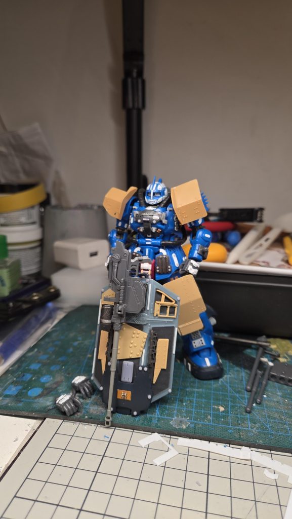 * A fade or reverse pre-shading was applied using a light grey or off-white color on the center areas of the armor panels (especially visible in the early photos on the workbench). This creates a lighting and volume effect, making the center of the panels brighter and making the color appear subtly sun-faded.