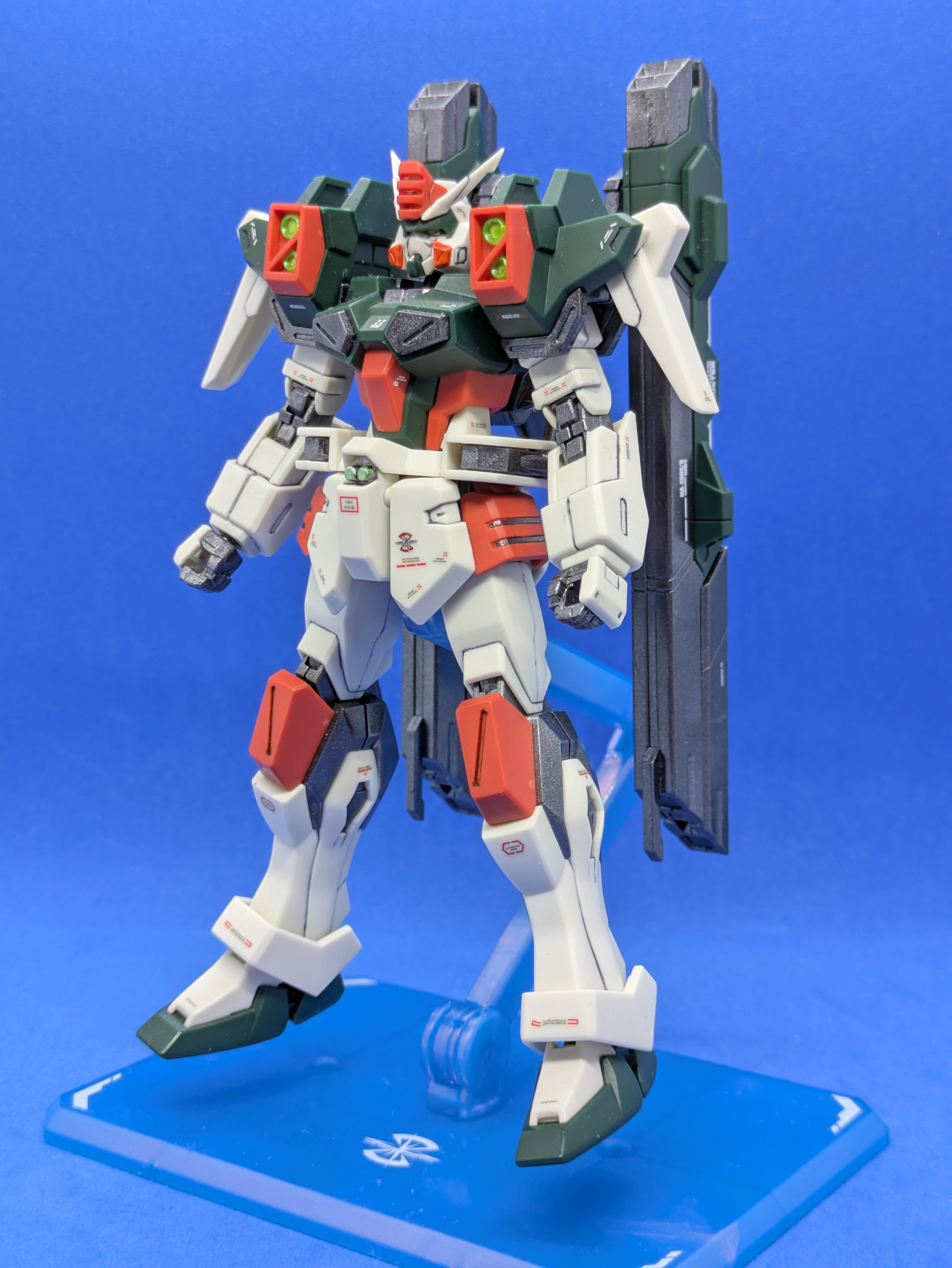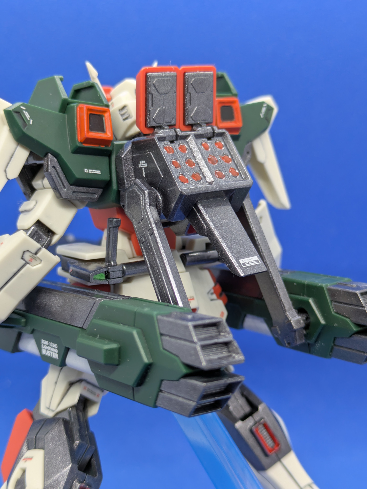 グレー部分をガンメタルで塗装し、ガンメタル部分は光沢、その他はつや消しトップコートで仕上げました。組んでいる途中にガンダムデカールSeed Freedom汎用2が出たので、ライトニングバスター用のものを一部使っています。