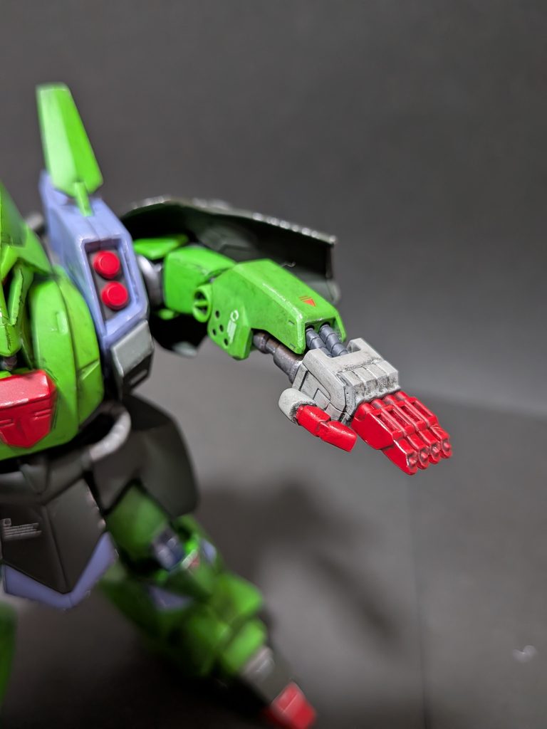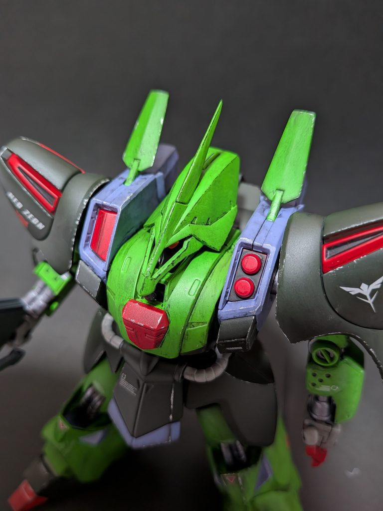 パープルグレー部分は成形色のままでライトグリーン、ダークグリーン、モンザレッド、ライトガンメタル(フレーム等)、MSファントムグレー、明灰白色(動力パイプ系)と塗装し最初はウェザリングカラーでウォッシングしていましたが二の腕両方にエナメル溶剤が入ったせいで内部でヒビ割れが起こり急遽パテで補修し今回は一回でパテとの境目なくせて良かったです😊