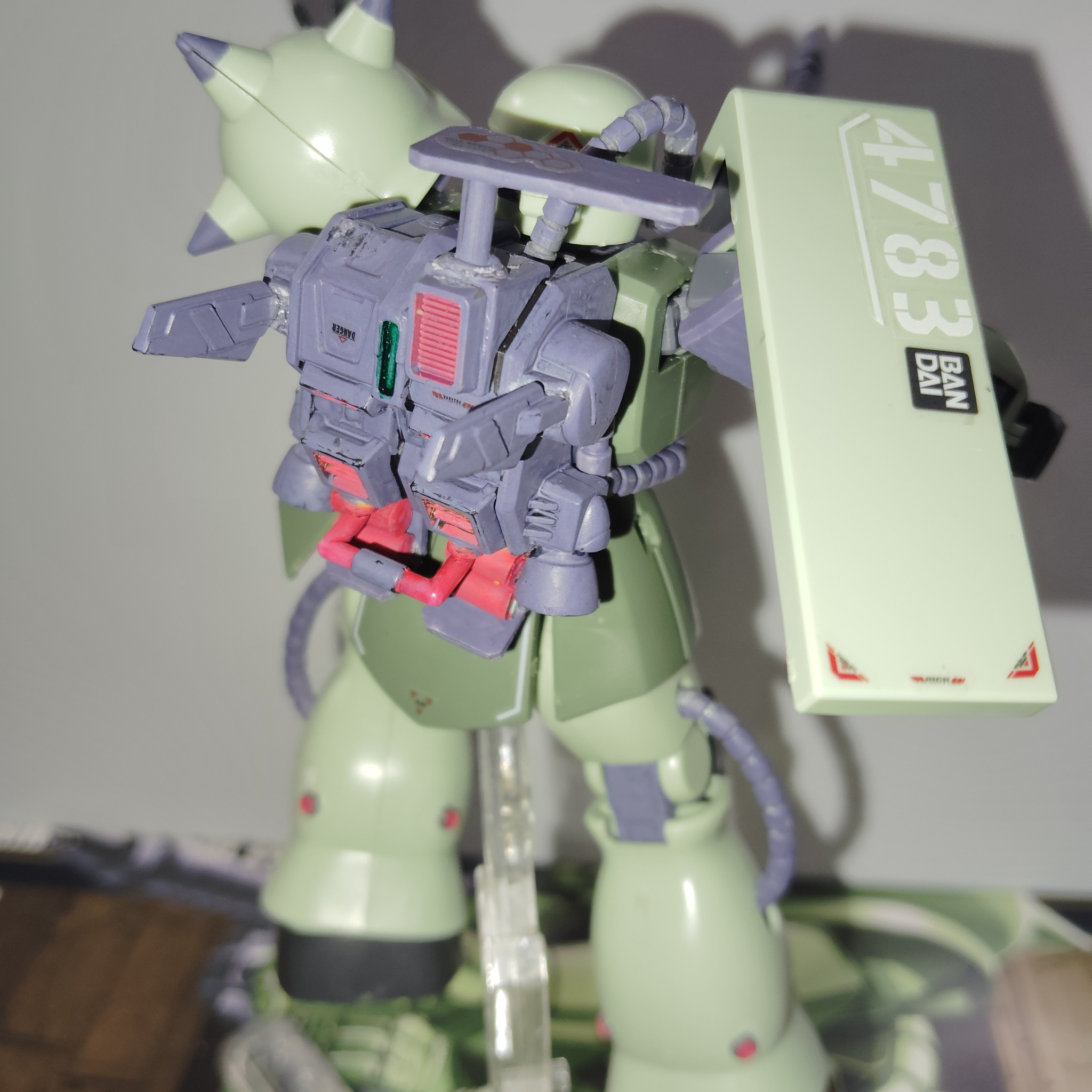 バックパックはGフレームのザクII R1のものをいじってそれっぽくしました。後ろに倒れる度にスタビライザーが折れていたのでちょっと汚くなってる