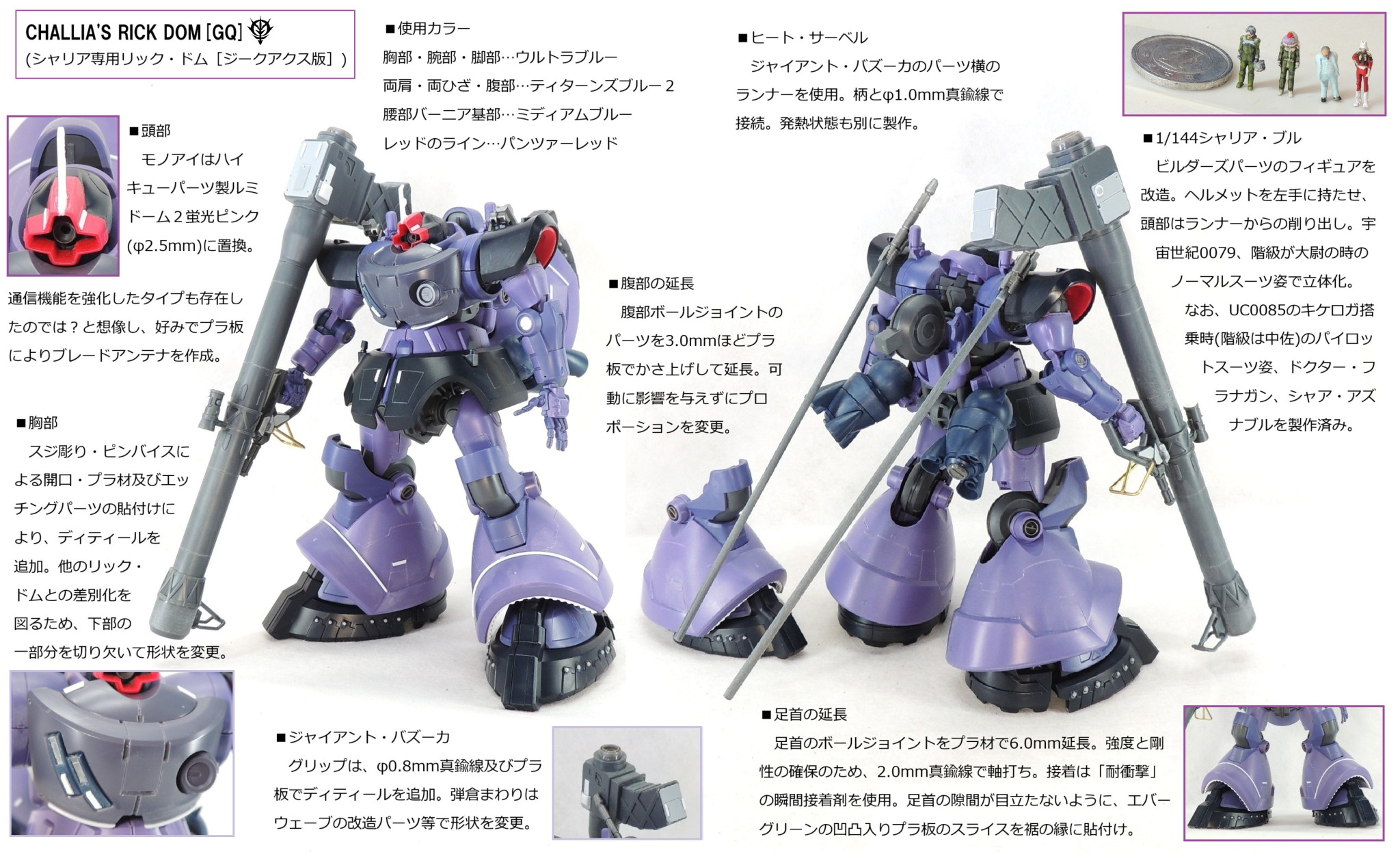 HG1/144 MS-09 リック・ドム シャリア・ブル専用機(GQ)を、ガイア機を改造して製作しました。同スケールのシャリア・ブル大尉のノーマルスーツ姿のフィギュアも併せて製作しています。どうしても、来年2月のキット発売まで待てませんでした…!