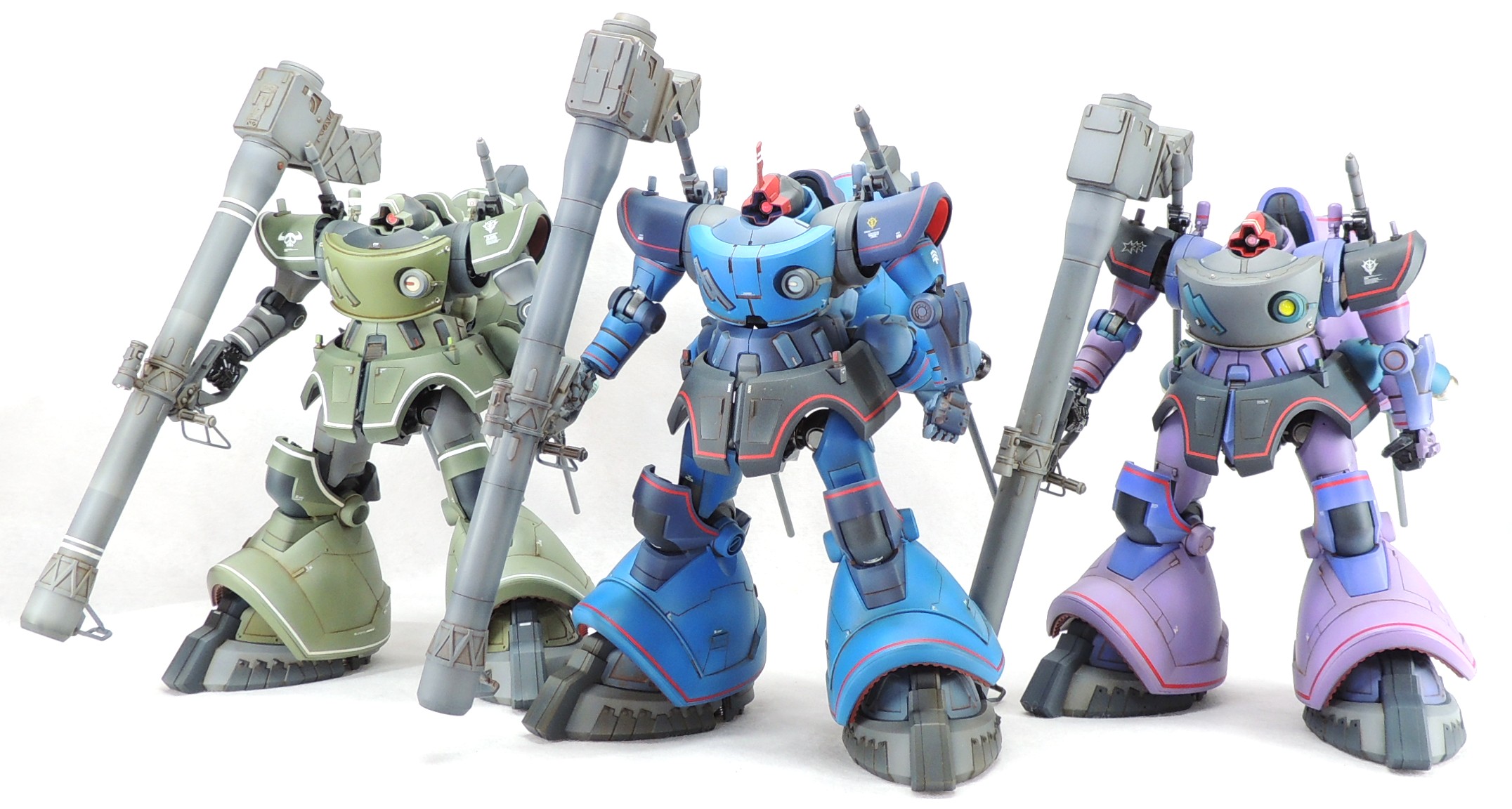 写真ですが、トクワン専用機、ガイア/オルテガ専用機、シャリア専用機と3機そろい踏みとなり、御指摘のとおり期せずしてトリプル・ドムのような恰好になりました。元の素材キットは同じなので、塩味・味噌味・醤油味といった風味の違い?を楽しんでいただければ幸甚大です。特に主兵装のジャイアント・バズーカですが、製作時期が異なるとはいえ、同じ武器なので細部が異なるのはおかしいと言えますが、モデラーの性(さが)で、作るたびにディティールが増してます。( ゚Д゚)