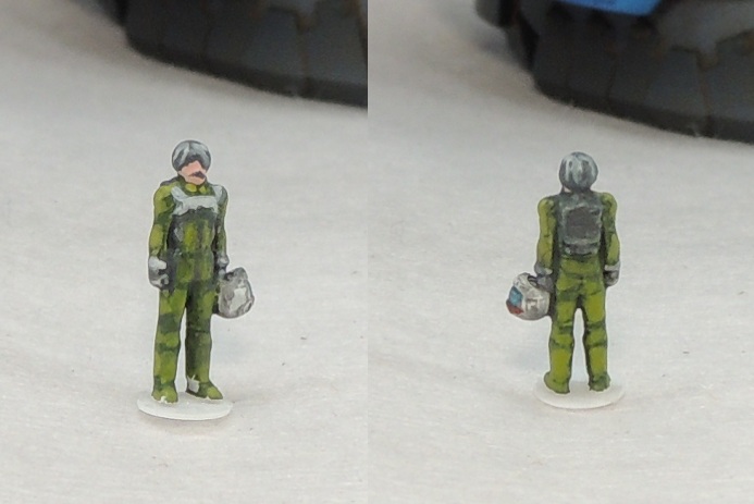 ビルダーズパーツのフィギュアを改造して製作しました。元のフィギュアは直立したタイプであり、ヘルメットを切り取って手に持たせるとともに、頭部をランナーから削り出しました。ジークアクス世界線での宇宙世紀0079、階級が大尉であった時のノーマルスーツ姿を再現しています。