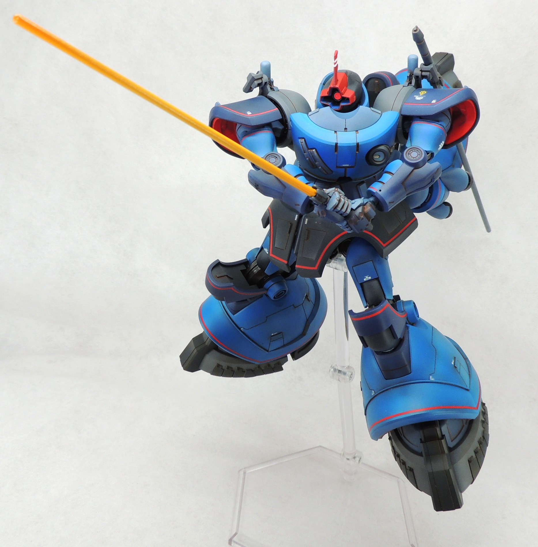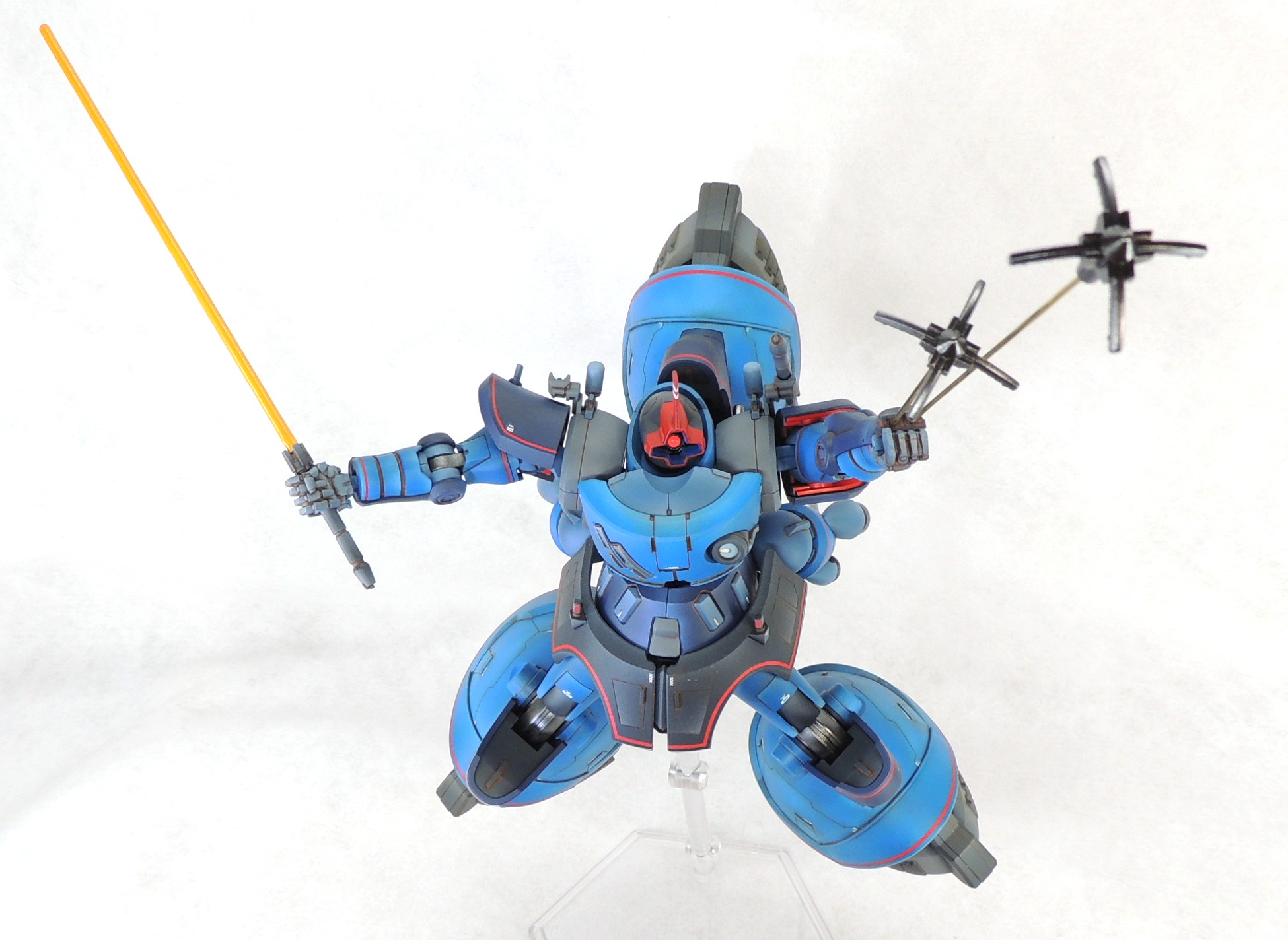 モノアイはハイキューパーツルミドーム2蛍光ピンクに置き換えました。好みで、指揮官機特有のブレードアンテナをプラ板で自作して取り付けています。完成後の強度を確保するため、モノアイガードの上面に0.9mmBMCタガネで溝を彫ってから接着しました。