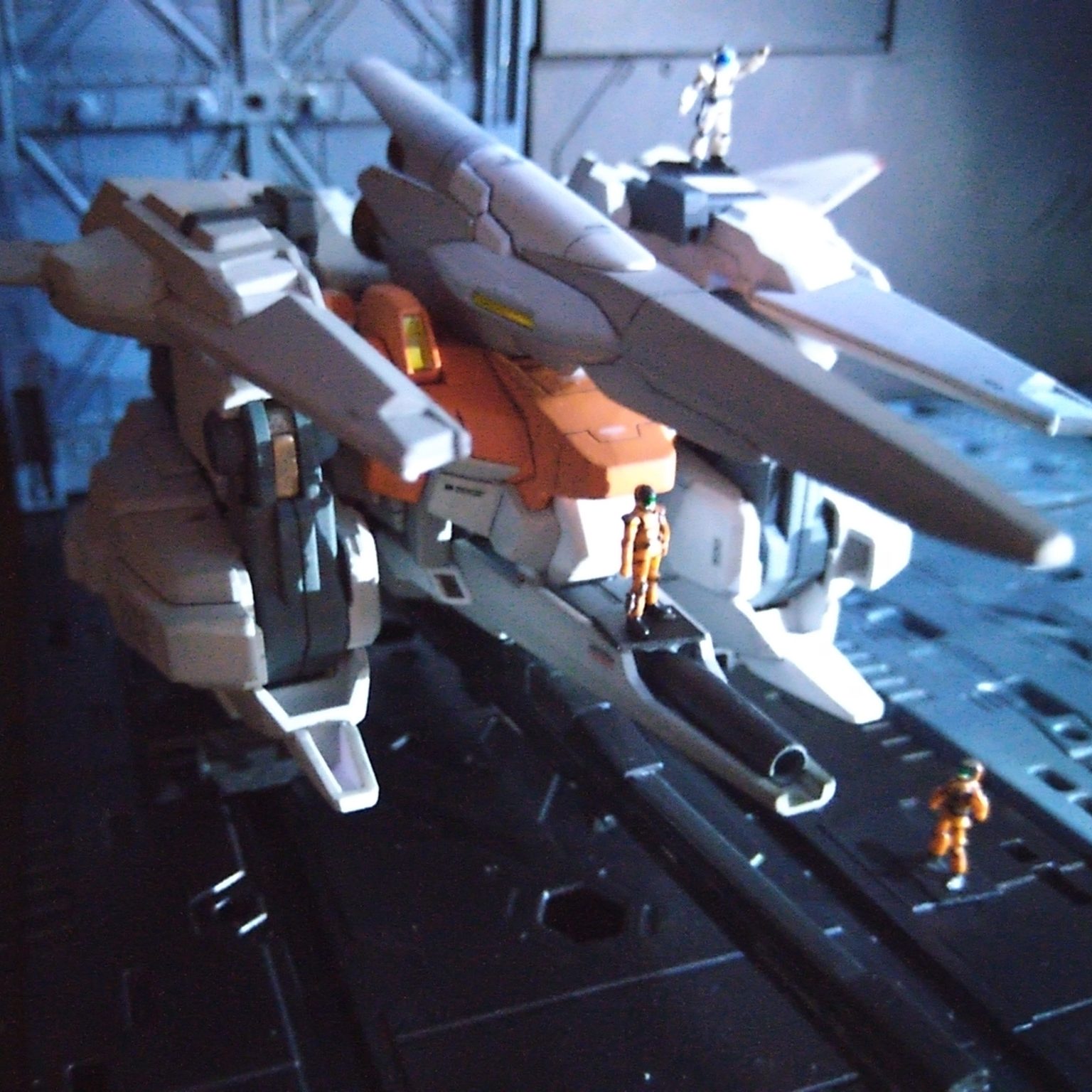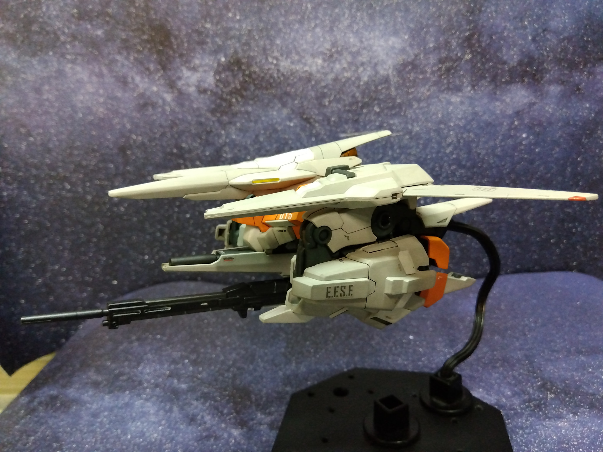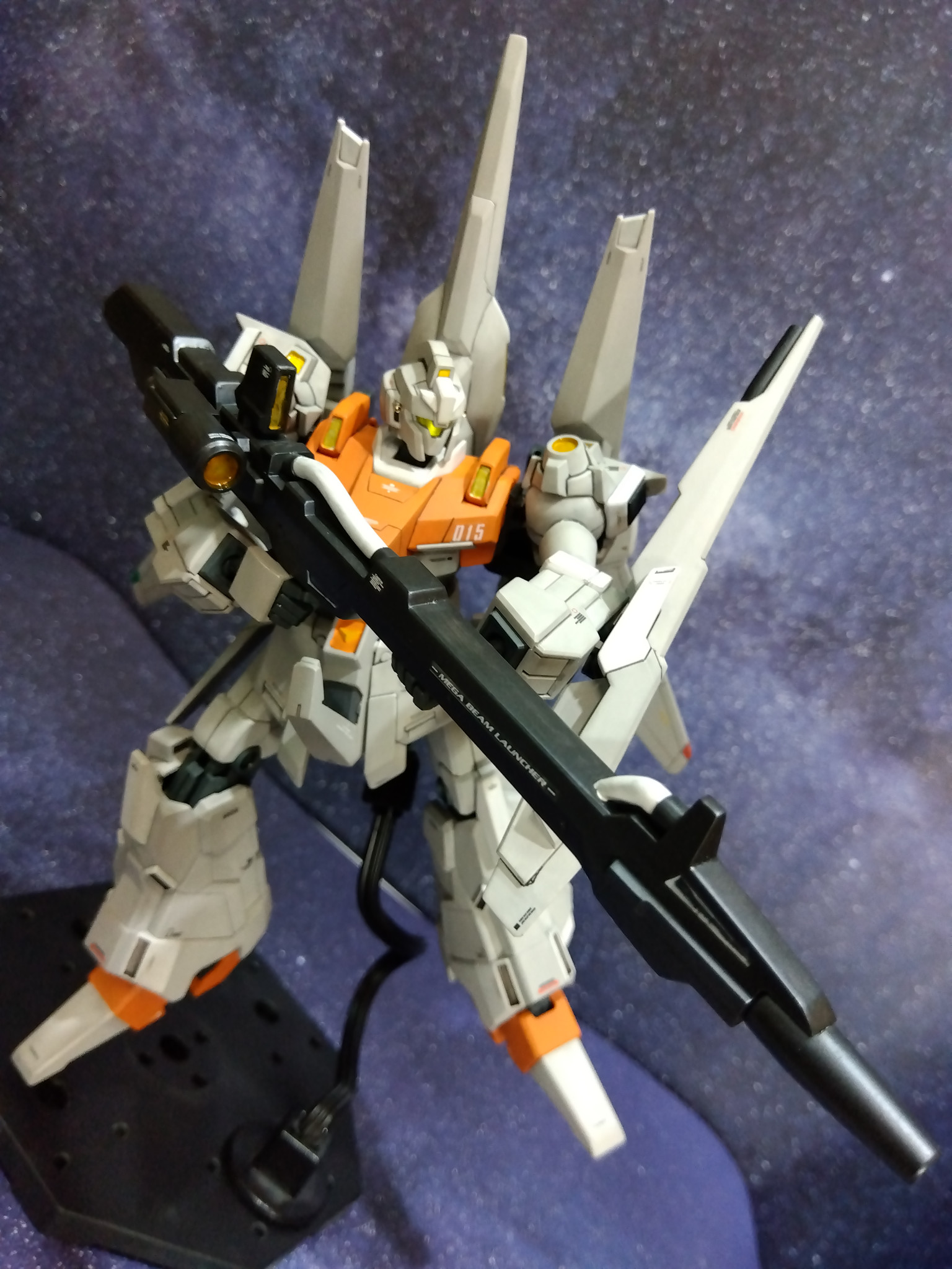 パケ絵と同じビームランチャー無しタイプで組みました。頭部バルカンの開口したらマズルが無くなってしまい、仕方なくメタルパーツを使用しましたがあまりの細かさに辟易。多用しているモデラーさんは尊敬します。
