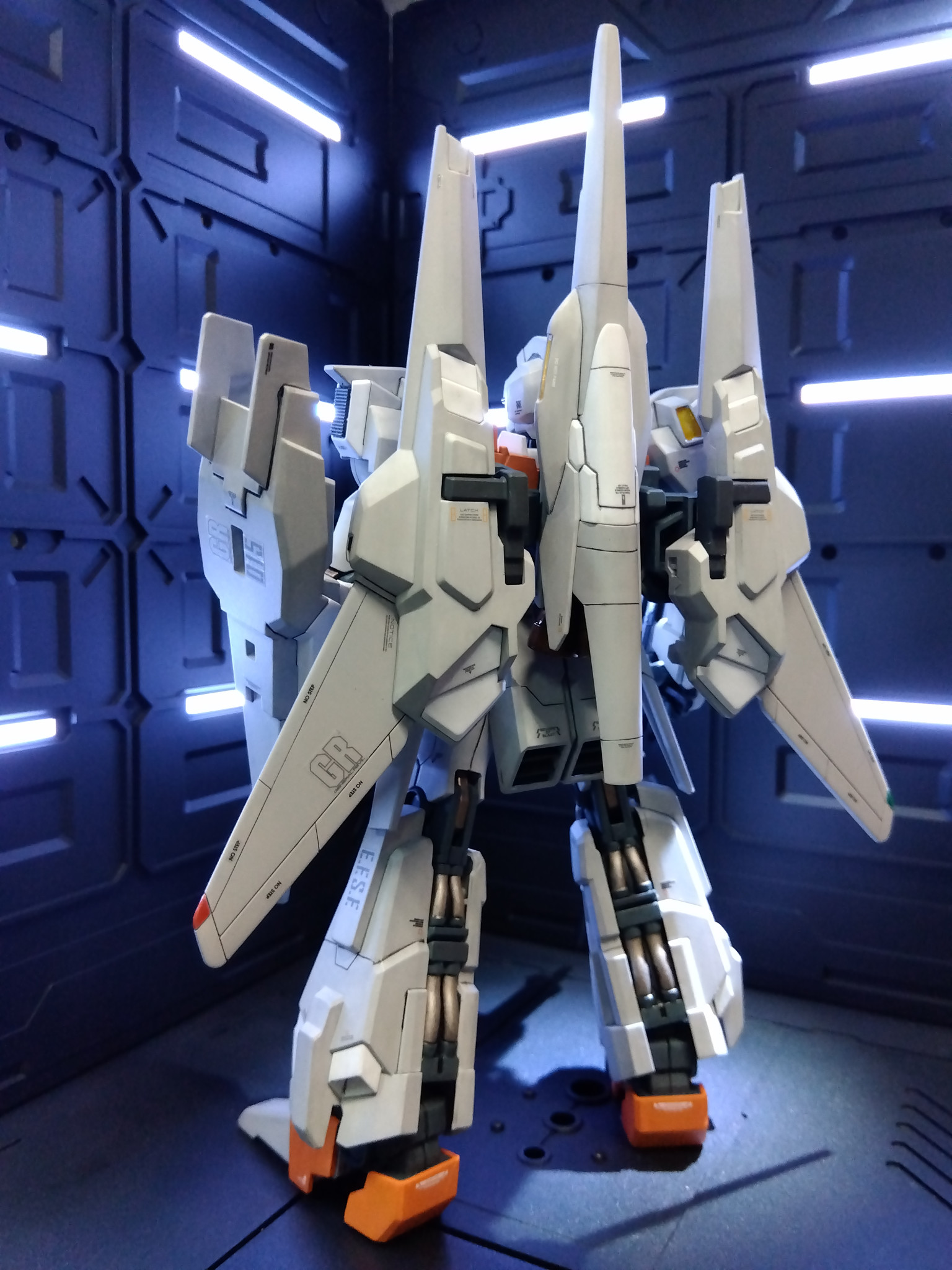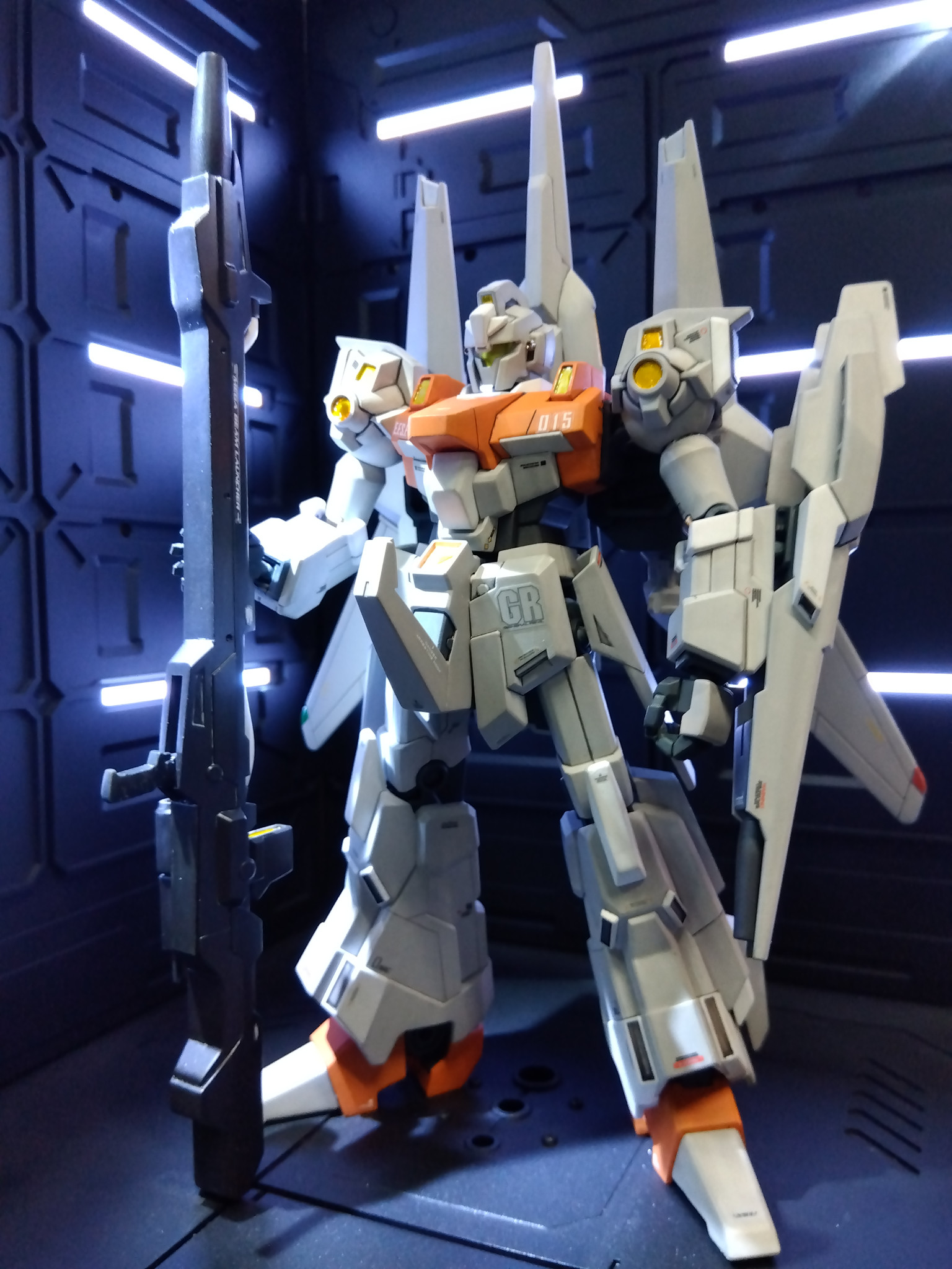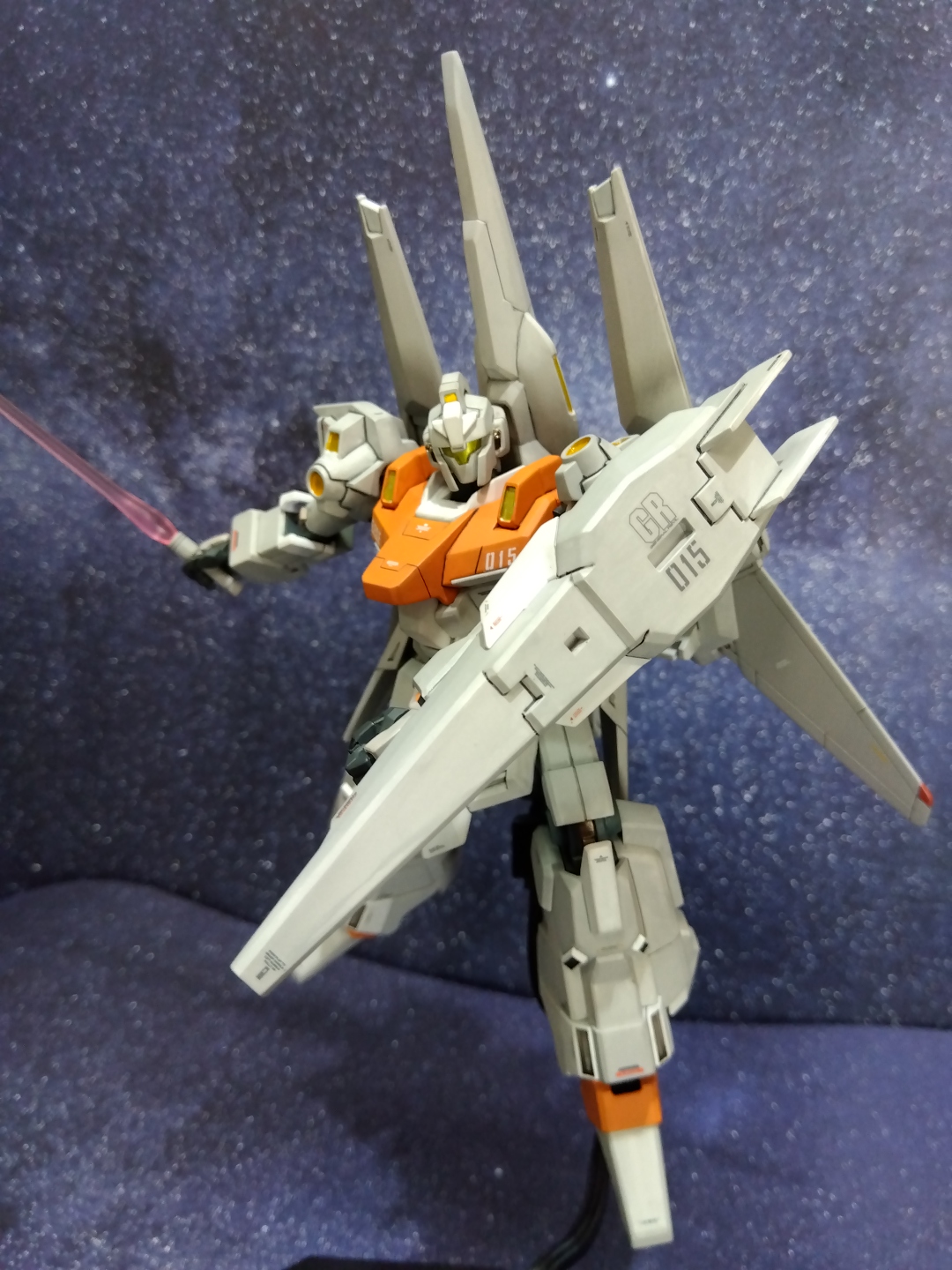 パケ絵と同じビームランチャー無しタイプで組みました。頭部バルカンの開口したらマズルが無くなってしまい、仕方なくメタルパーツを使用しましたがあまりの細かさに辟易。多用しているモデラーさんは尊敬します。