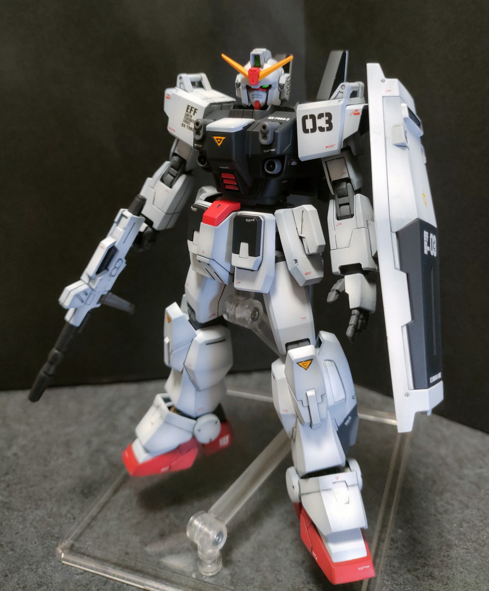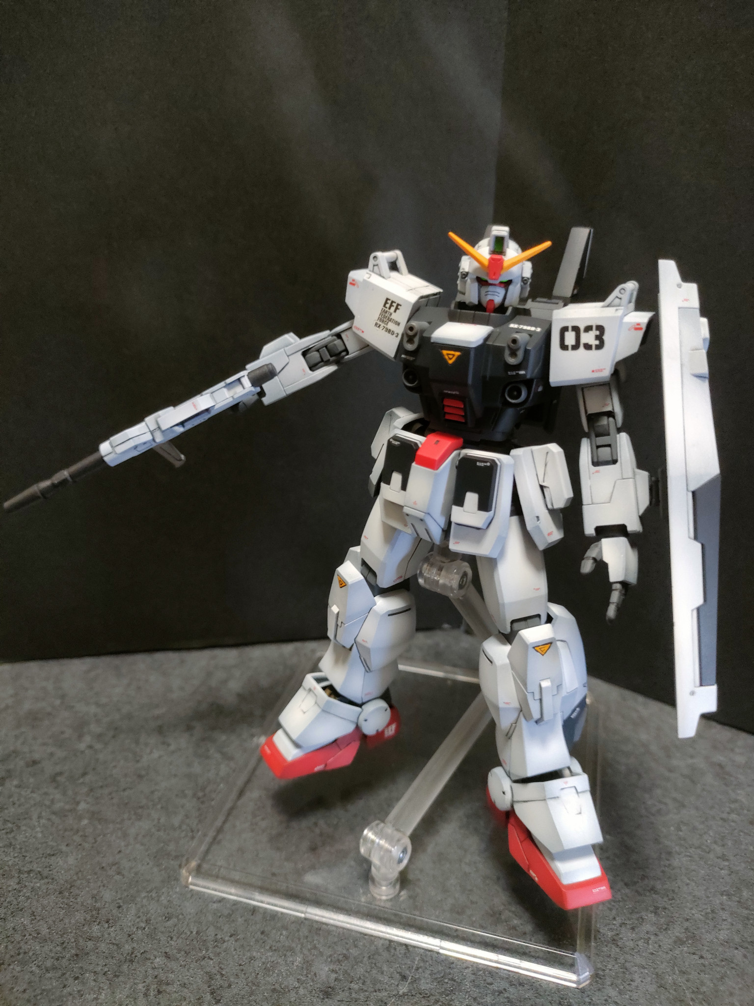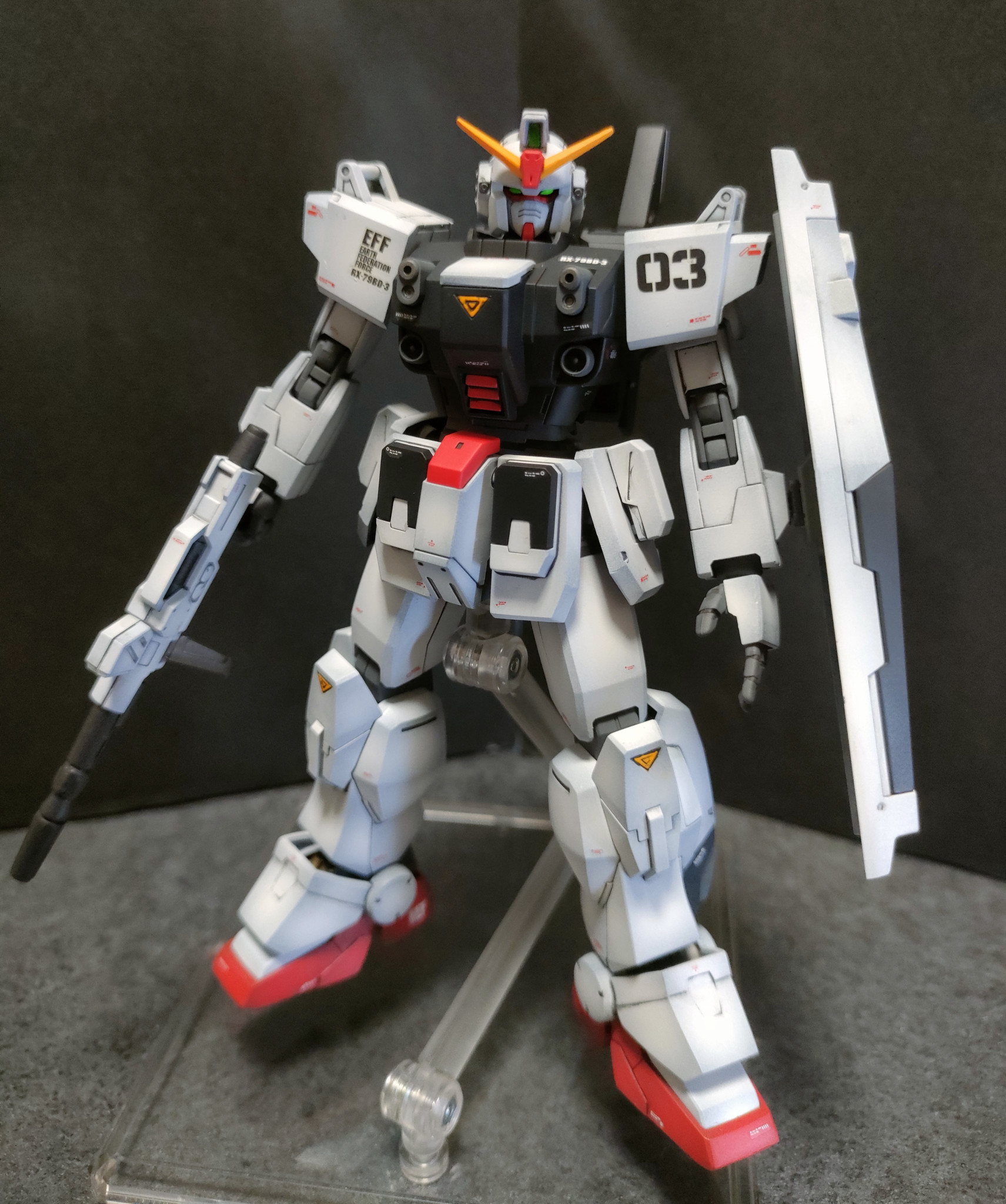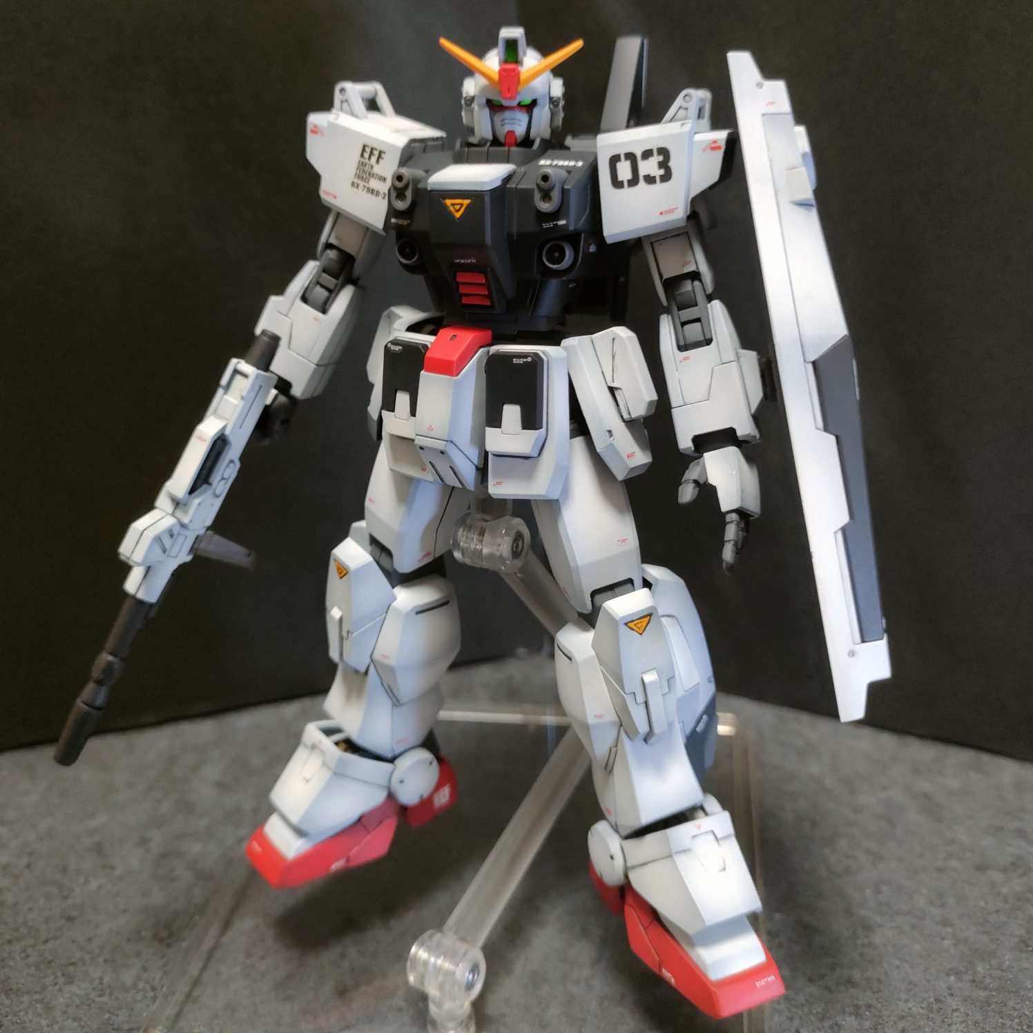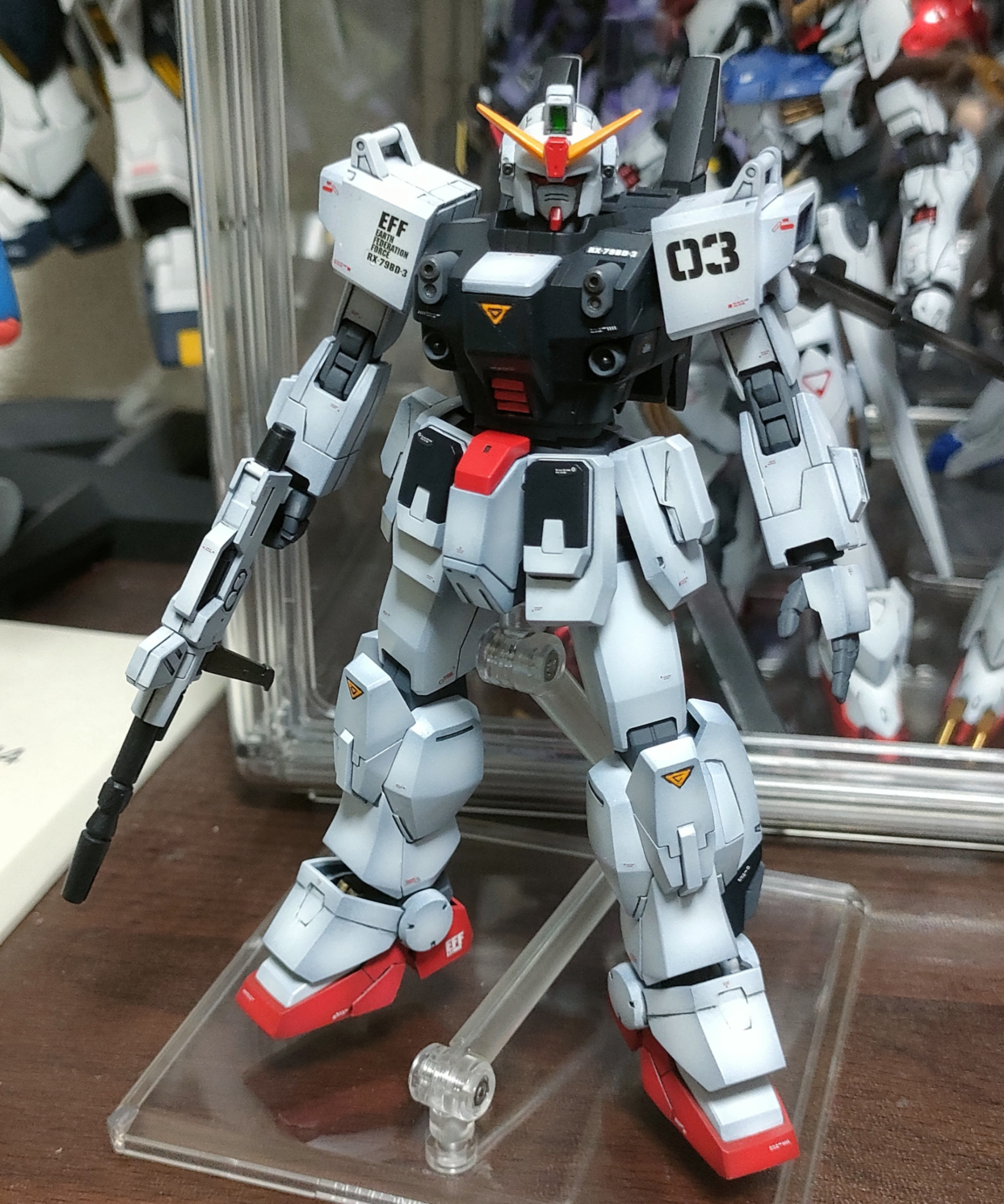 このブルーディスティニー3号機は全塗装仕上げしました。合わせ目は横着して段落ちモールド化。