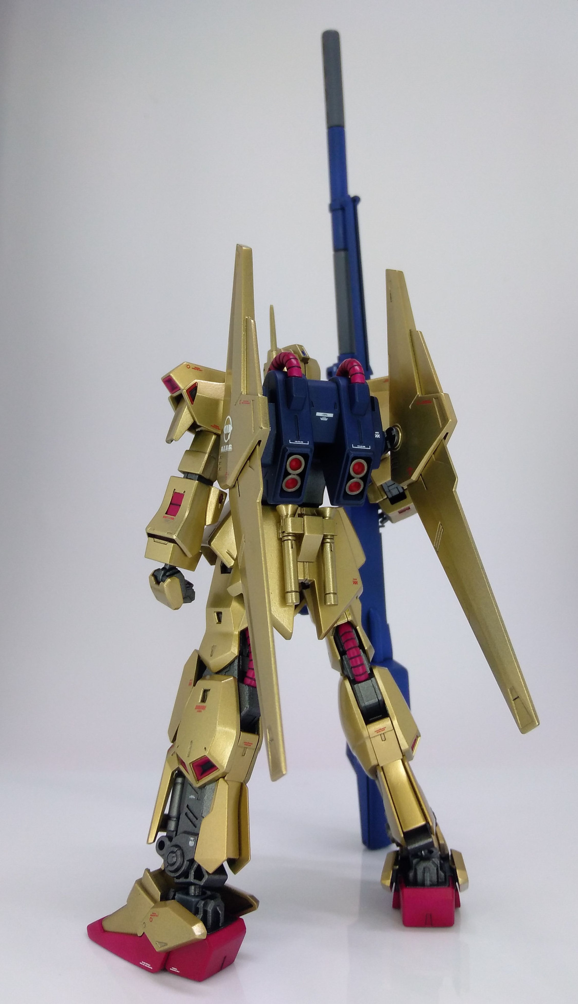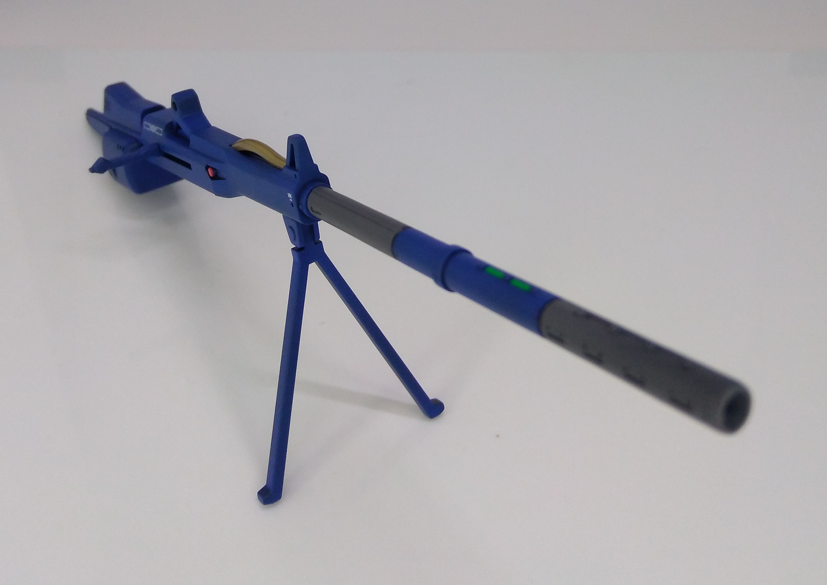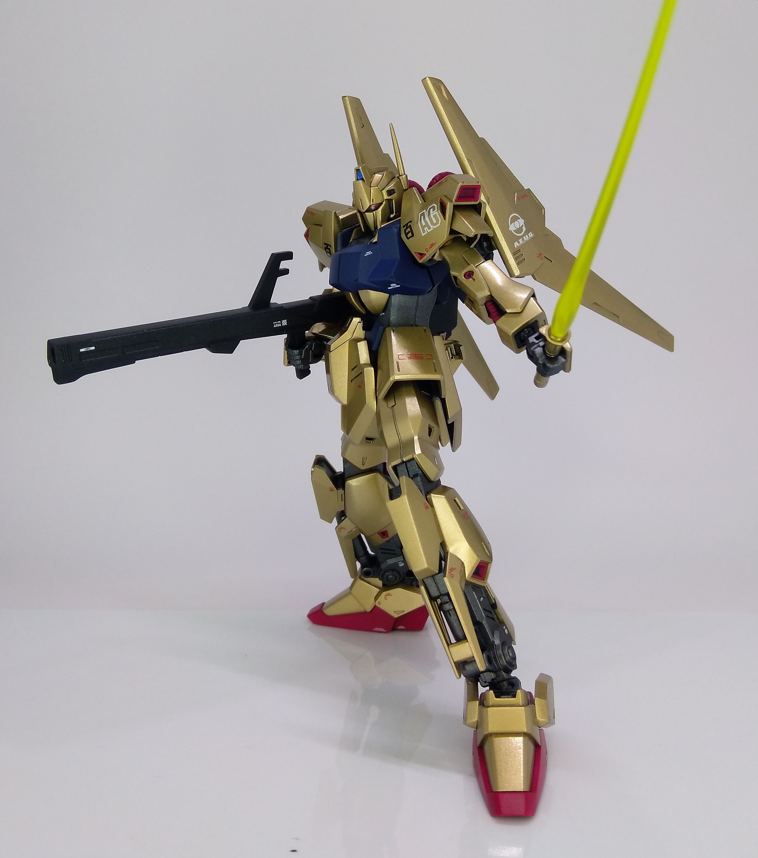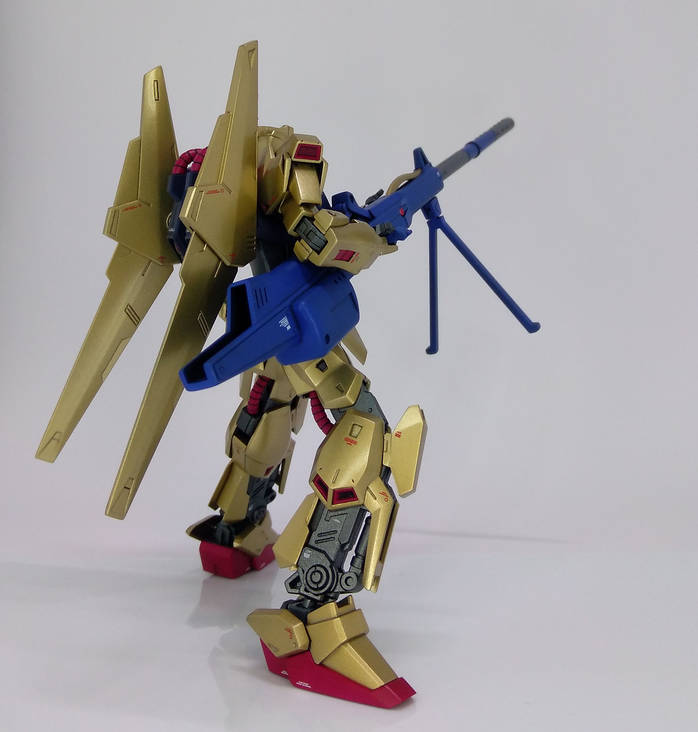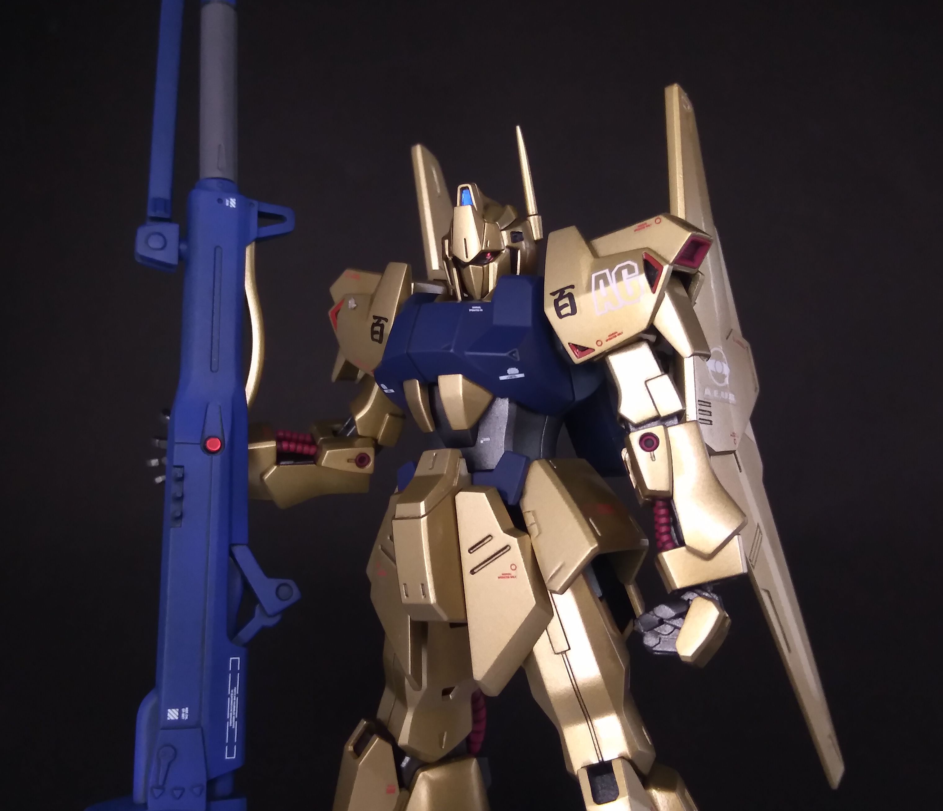 バスターランチャーはHGエルガイム(旧版)から拝借。これも素組ですが、百式が持つならこんなかな?と妄想してメガバズーカランチャーの配色にしてみました。アクセントになるよう赤と緑のプラスチックシールを貼り付けました。