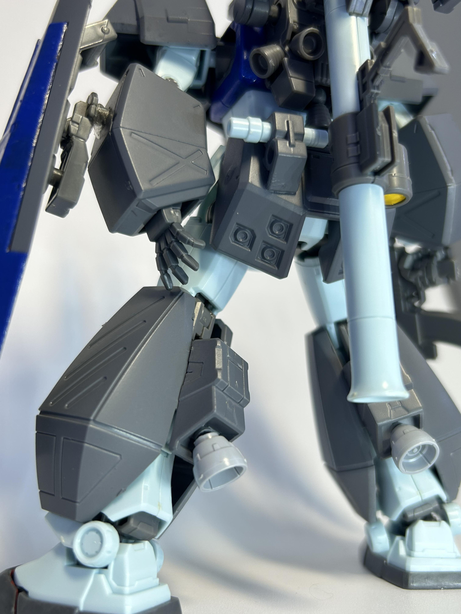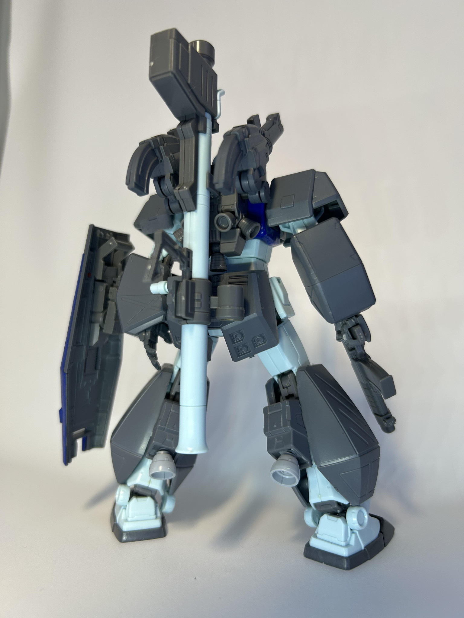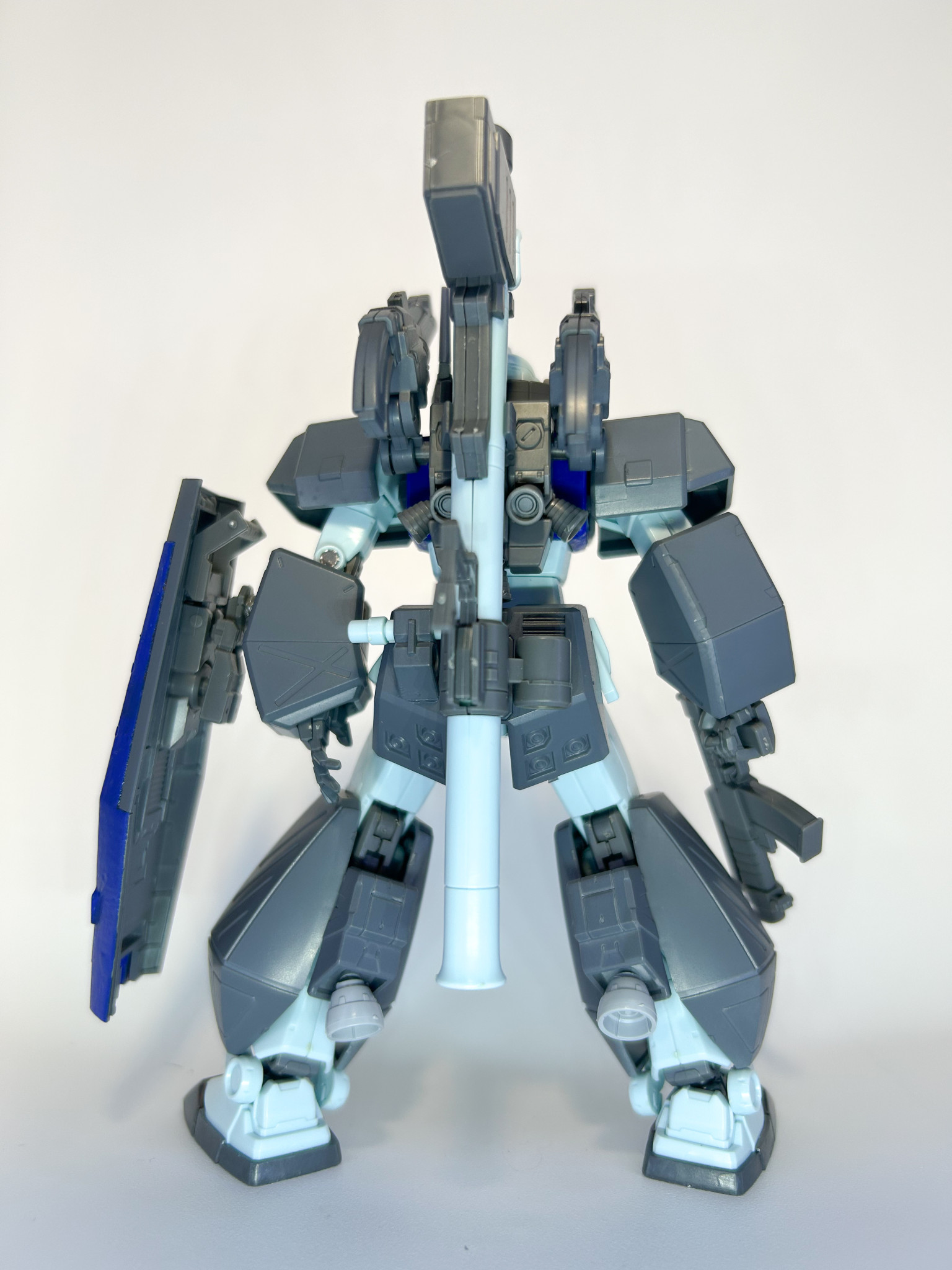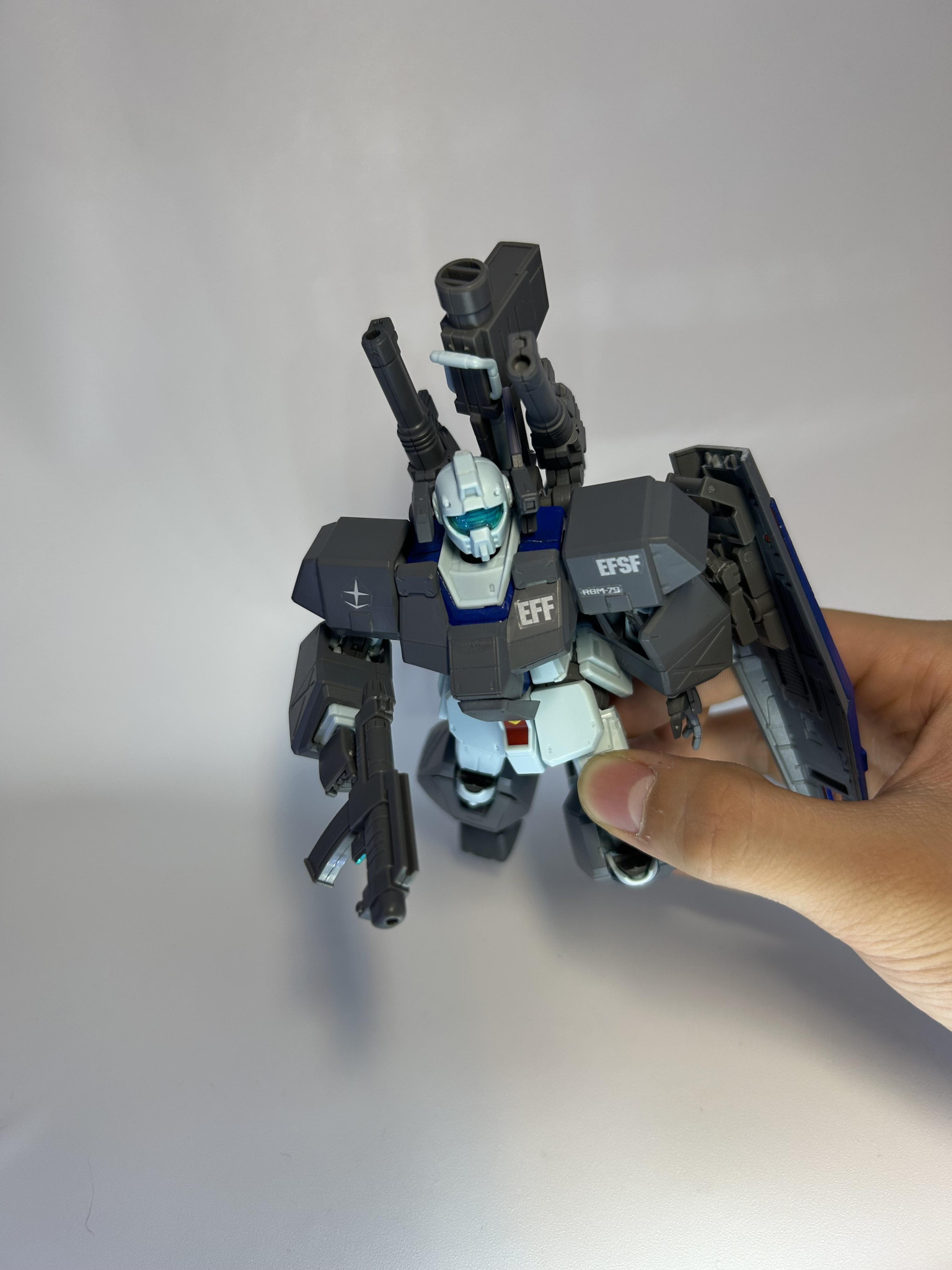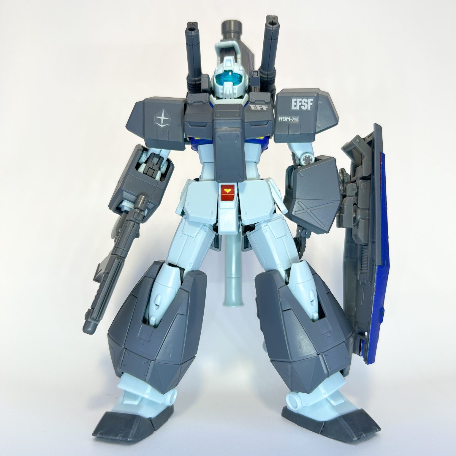 武装はビームライフル、ランチャー、キャノン×2、ビームサーベルです。アレックスのチョバムアーマーを流用し、ジムの防御力の増加、重装備化を目指し設計されたものの、アレックスの撃破により生産、運用は中止された、という設定です。