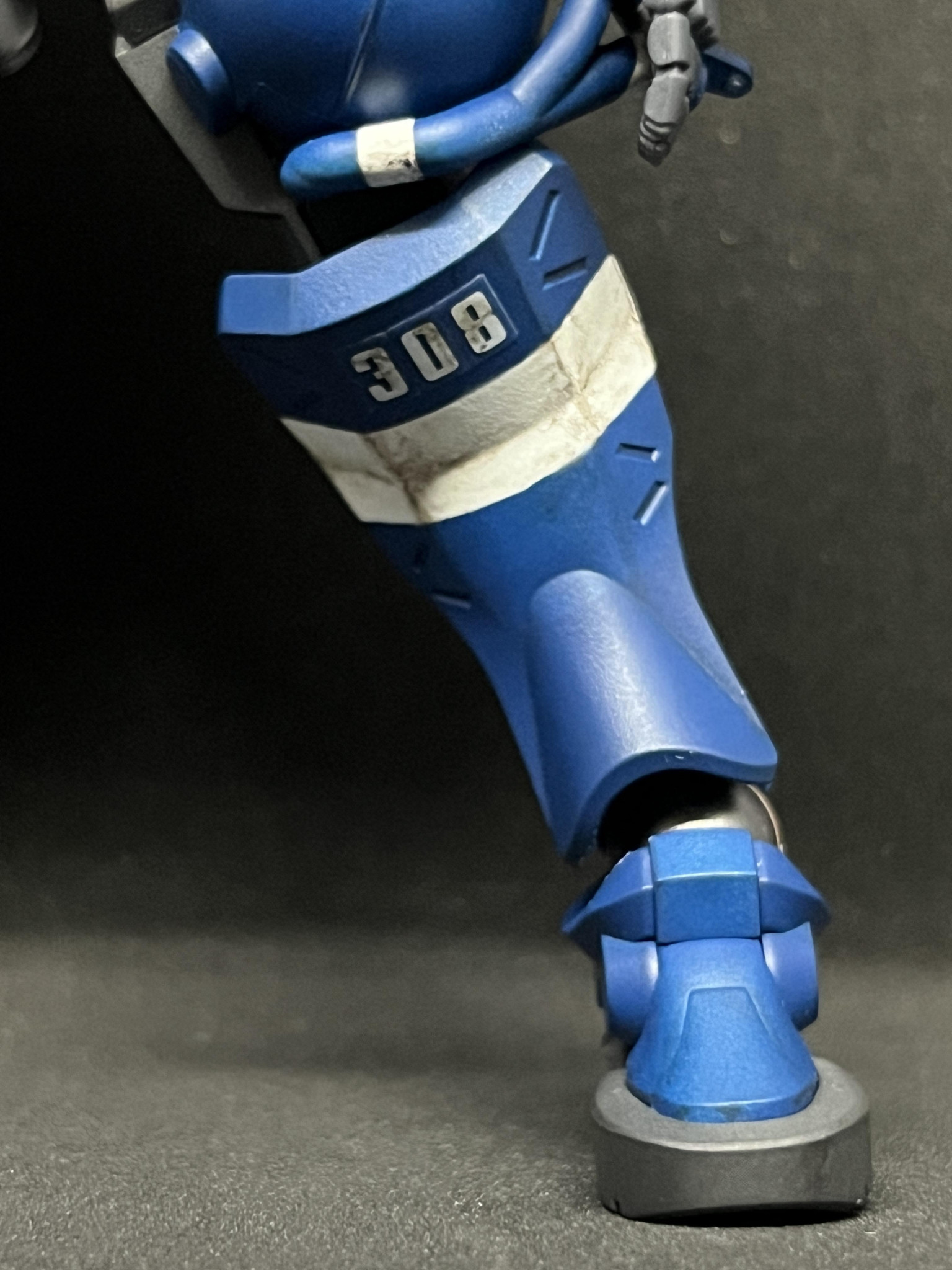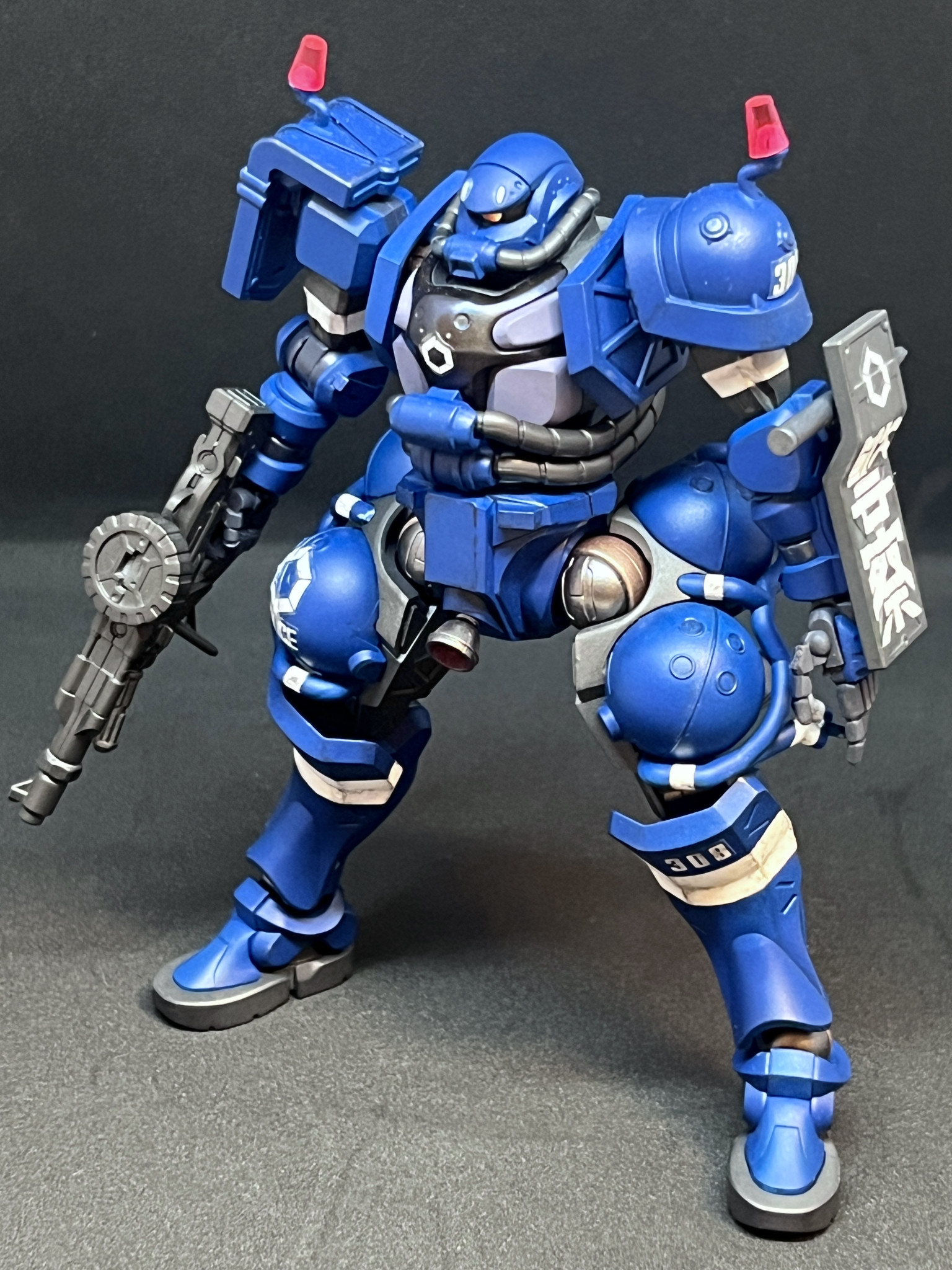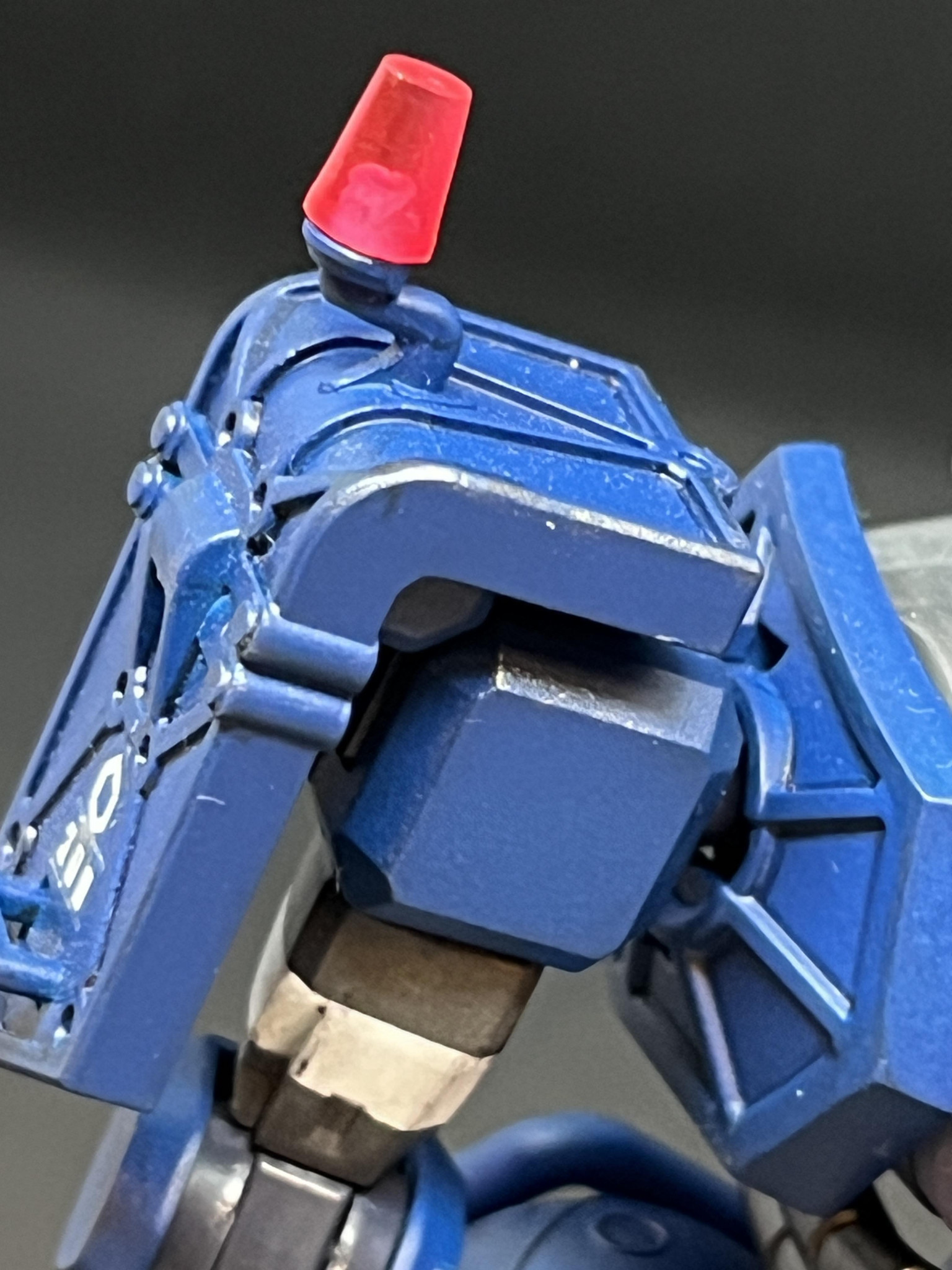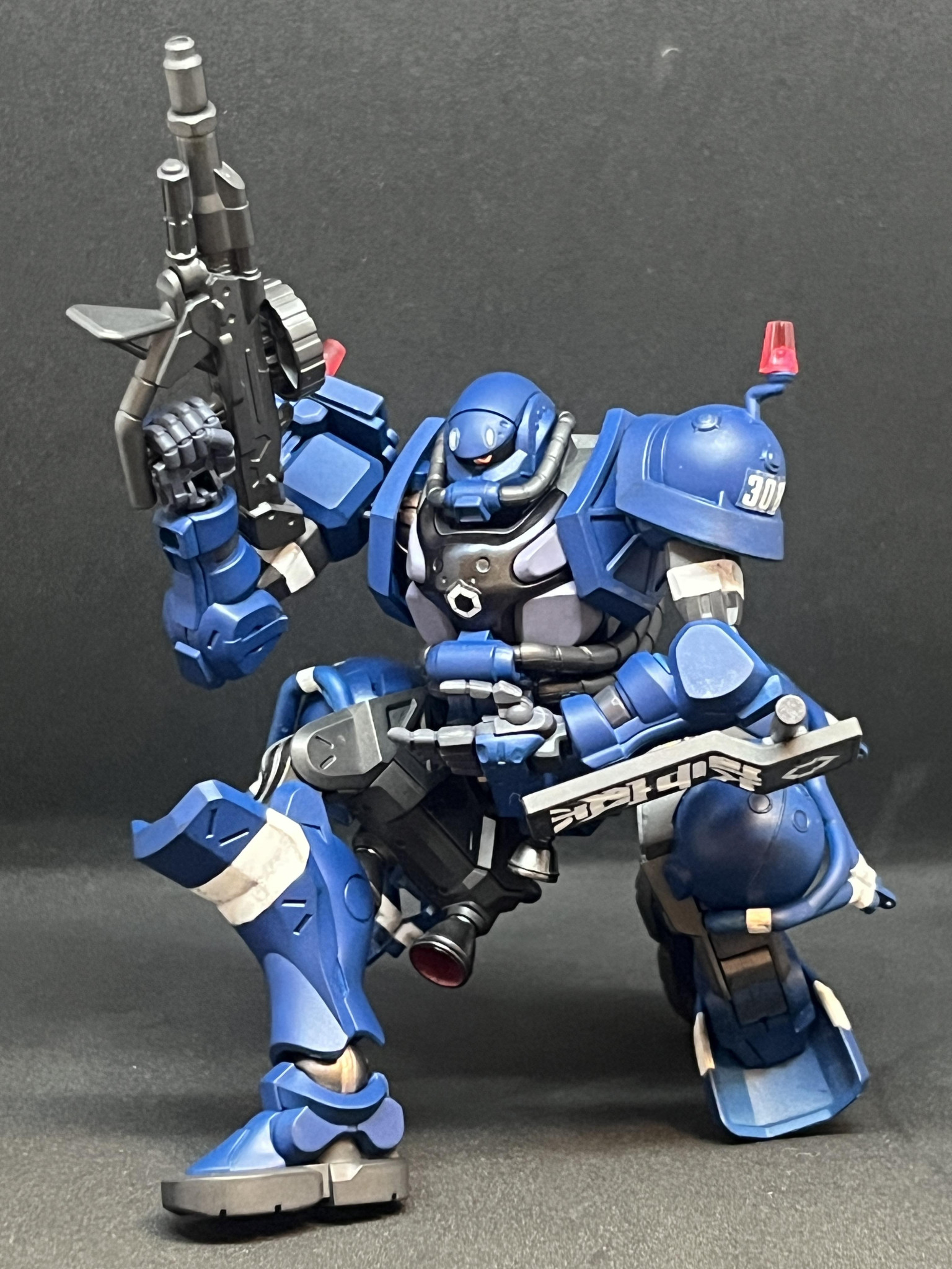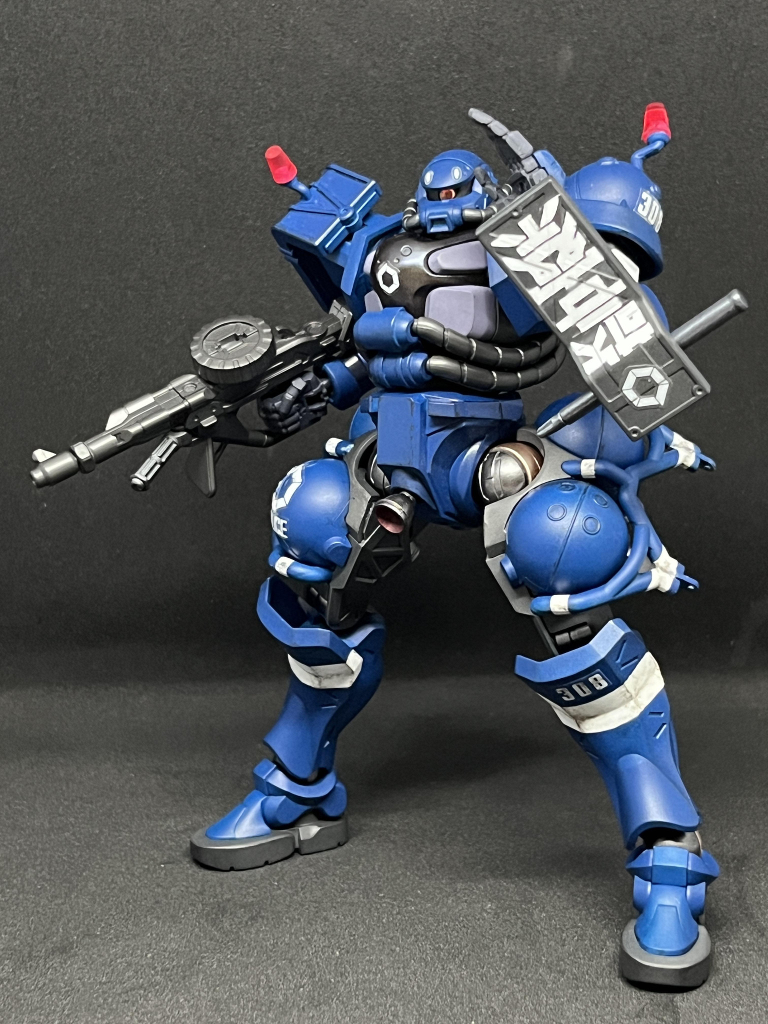今回は全塗装しました。ホワイト部分はシールドの「警察」、膝や上腕・腿のタンク周りのパイプのラインのホワイトはシールを使わず、マスキングして塗り分けました。