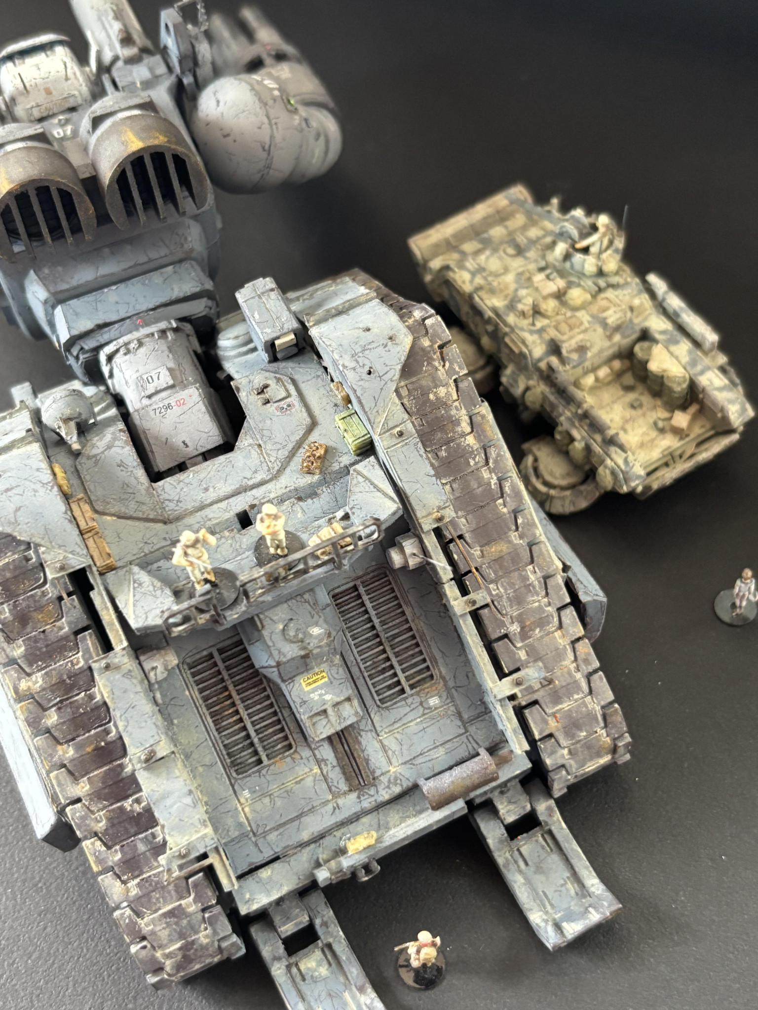 フェンダーは銅板で作ってダメージを付けてます。1/144なので1/35みたくやるとやりすぎになります。以前作ったホバートラックを横に置いて、オーバースケールにならないように気を付けました。