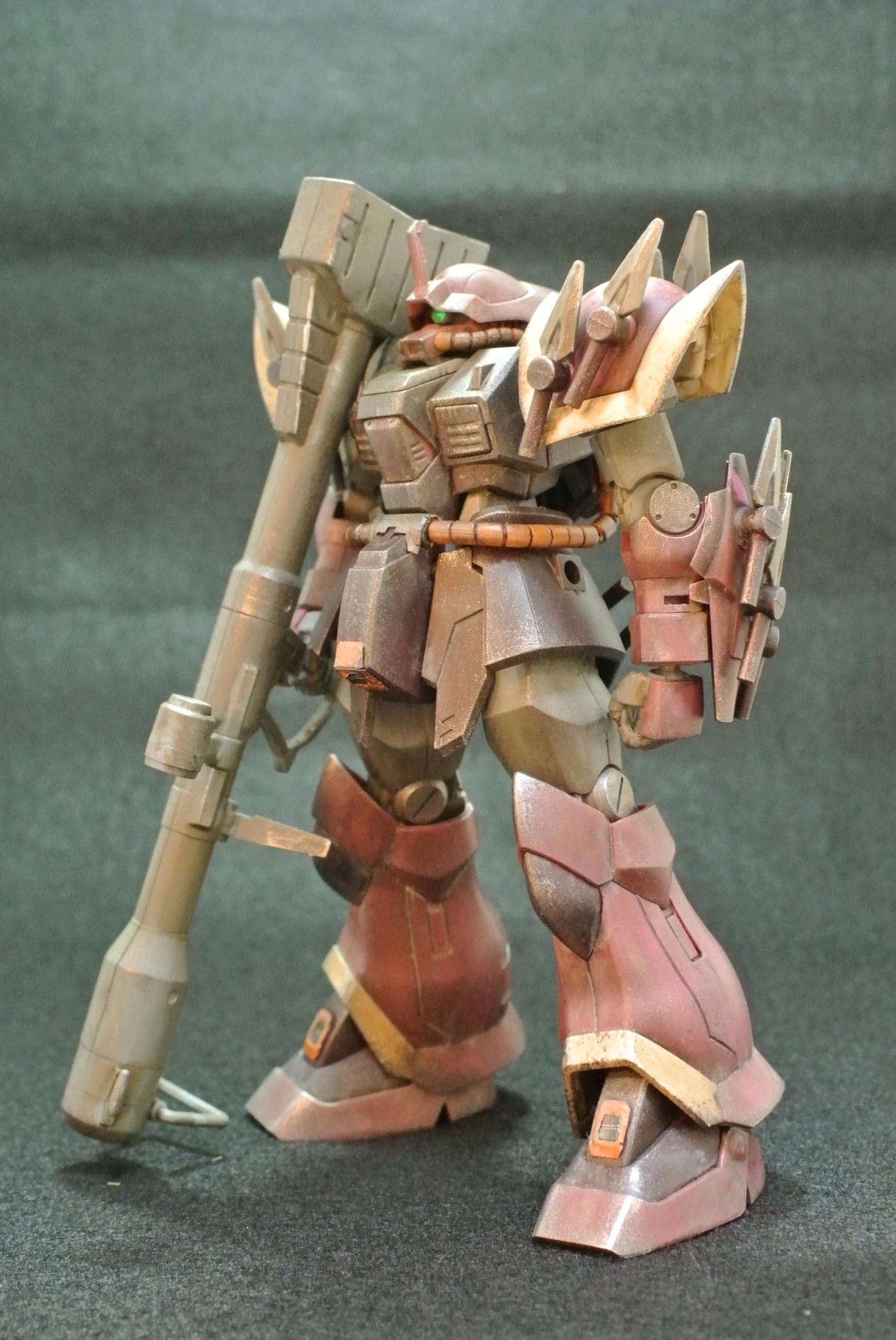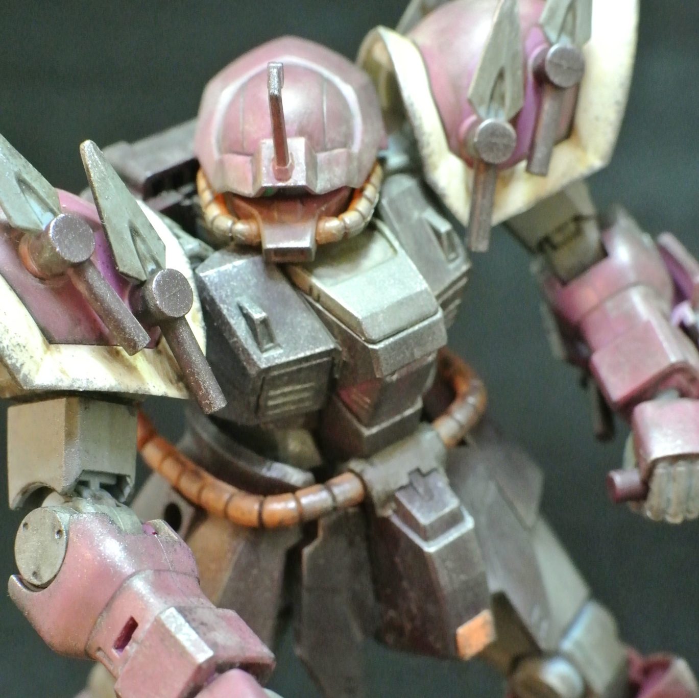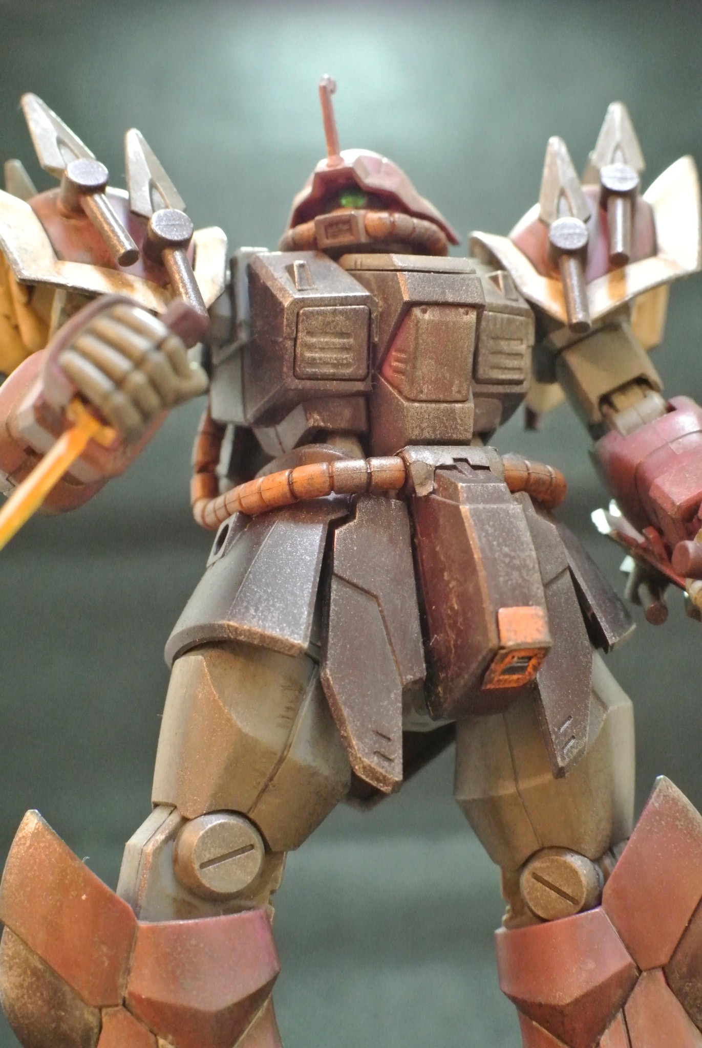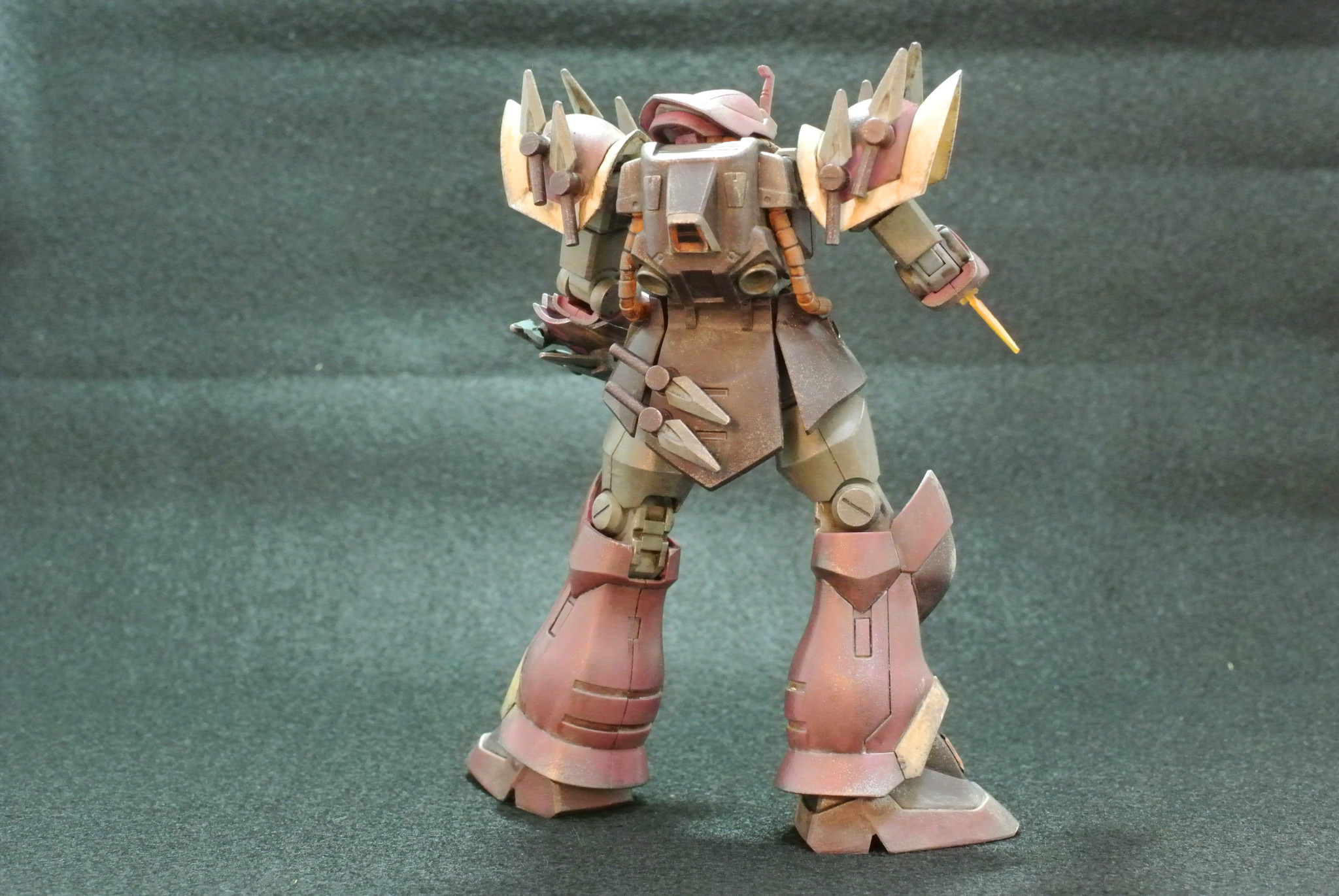 地上戦用のMSなので泥と砂埃で汚れたイメージで茶色系でウォッシング、焼鉄色でスポンジチッピングとシルバーでドライブラシをやっています。
