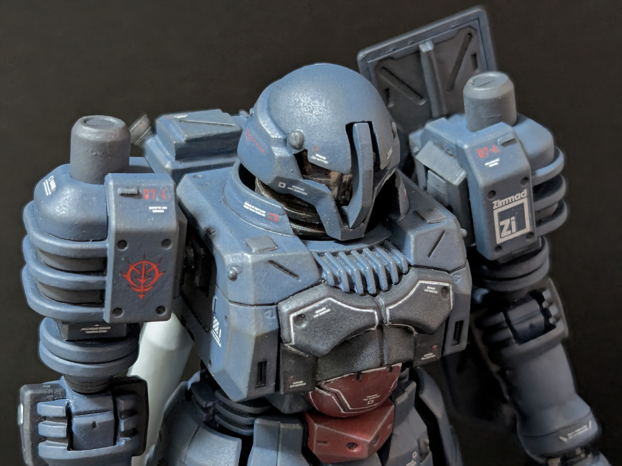 【上半身】上半身はほぼ無改造ですが、襟を少し高く、モノアイレールは微妙に上下に狭く。ウェザリングはデカールをつぶさないように、ウェザリングカラーで質感を足した程度に抑えました。