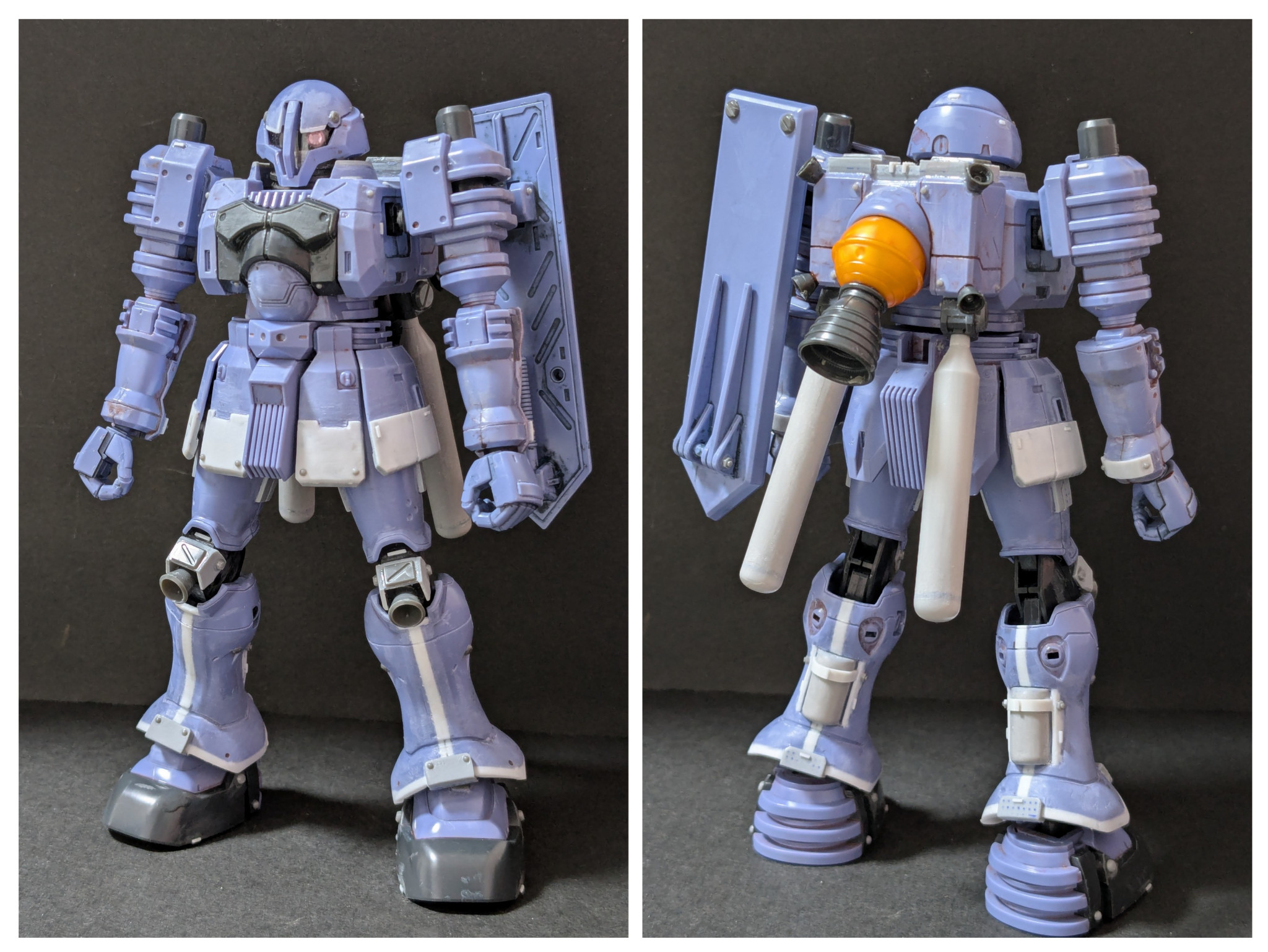 【正面】好きな機体過ぎて改造できずに塩漬けになっていたモノをさらに自分好みにしました。下半身ドッシリにして、ちゃんと止まれるように膝バーニアも追加。カラーリングは試作機感をなくす方向で。