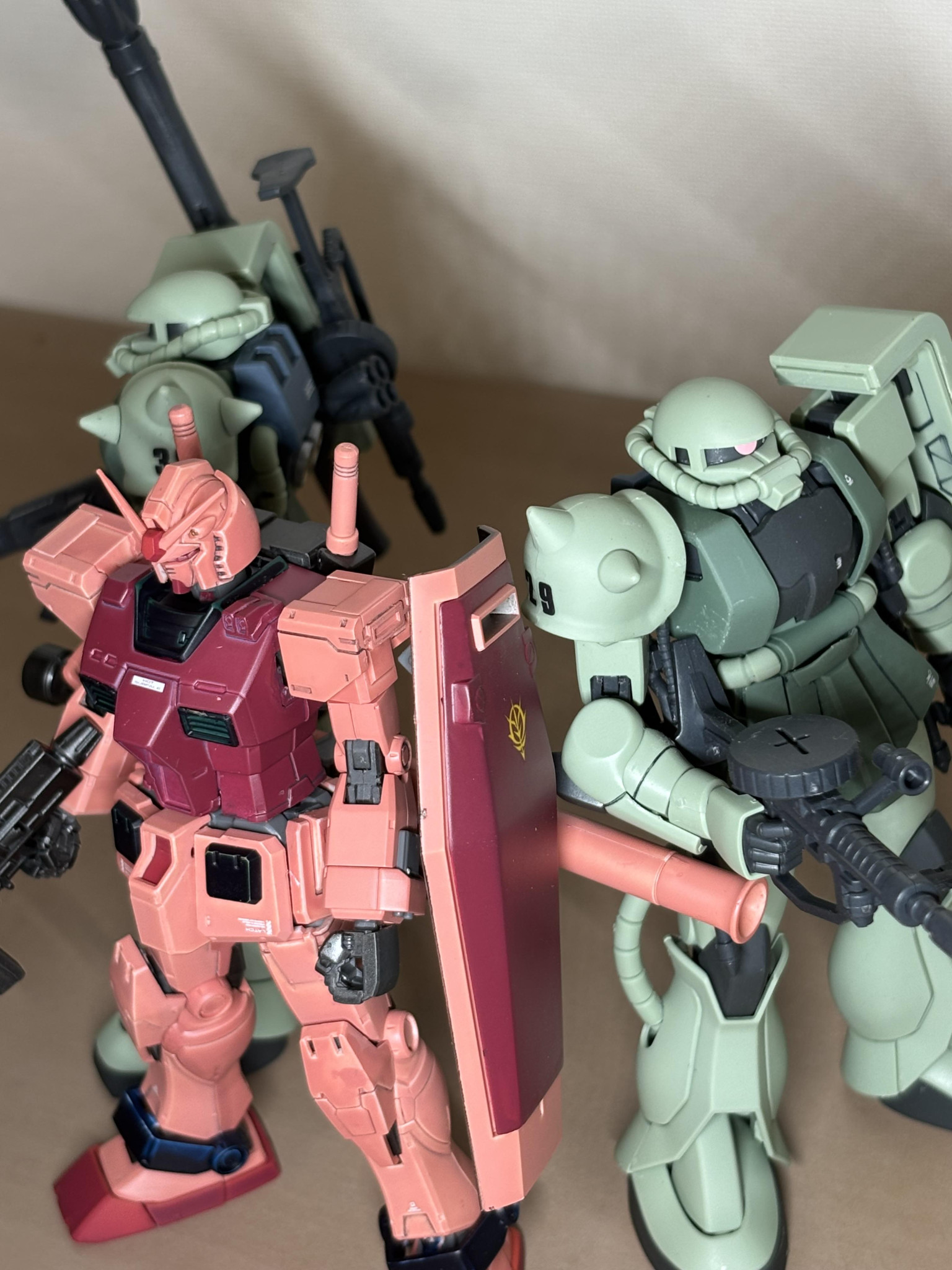 この二機は今回作った中でも時間はかからなかった方なのですが、私がザク好きなのもあって結構気に入ってます。