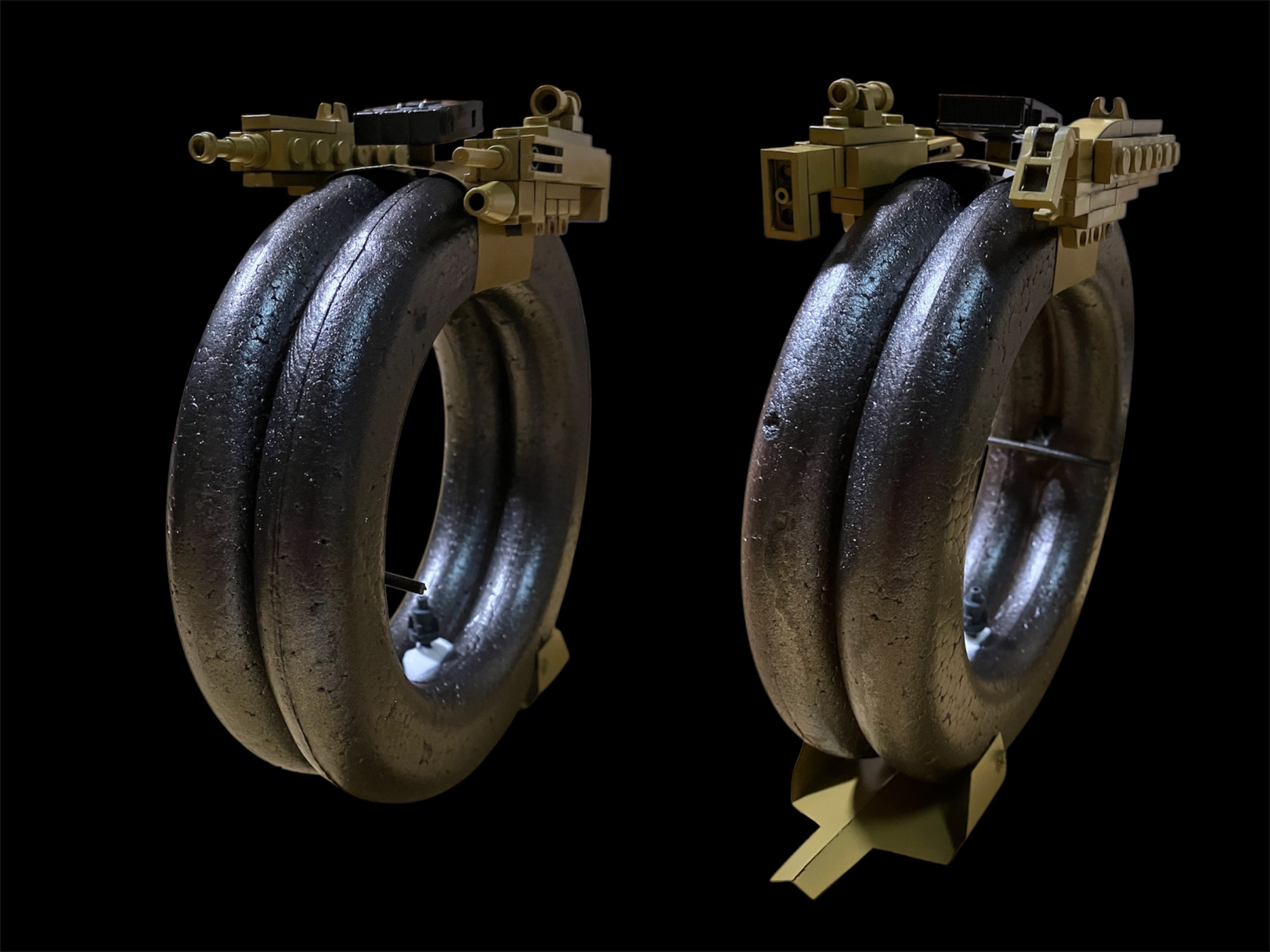 正面。季節商品の発泡スチロール製レリーフ二つを塗装して二つ一組に接着。ミサイルの土台やタイヤストッパーはプラ板で製作^_^