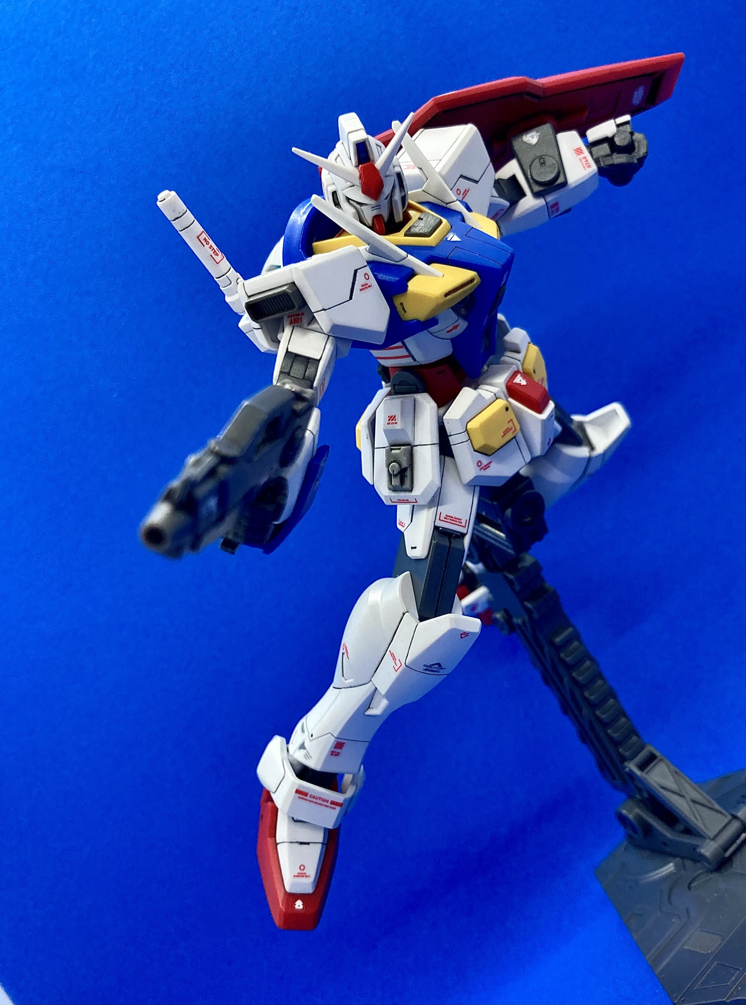 ②:右腕にオークアンタの余剰パーツを使いアームガード(青色)に。隙間に予備のビームサーベルを取り付け。
