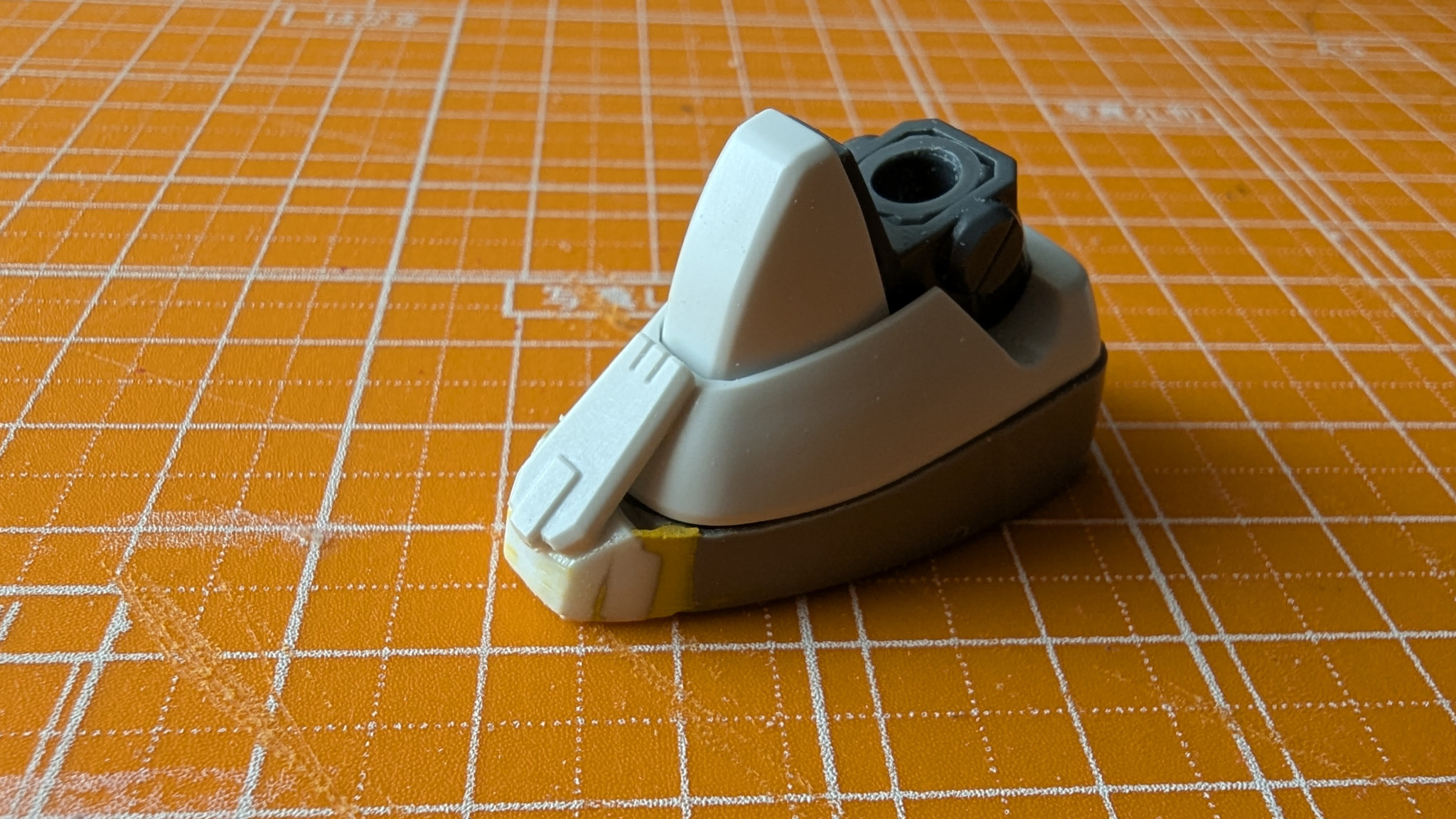 サイドスカートが前方向に干渉するので切り欠いて前スカートに接合。飾りには本来キットのバックパックのスタビライザーを。