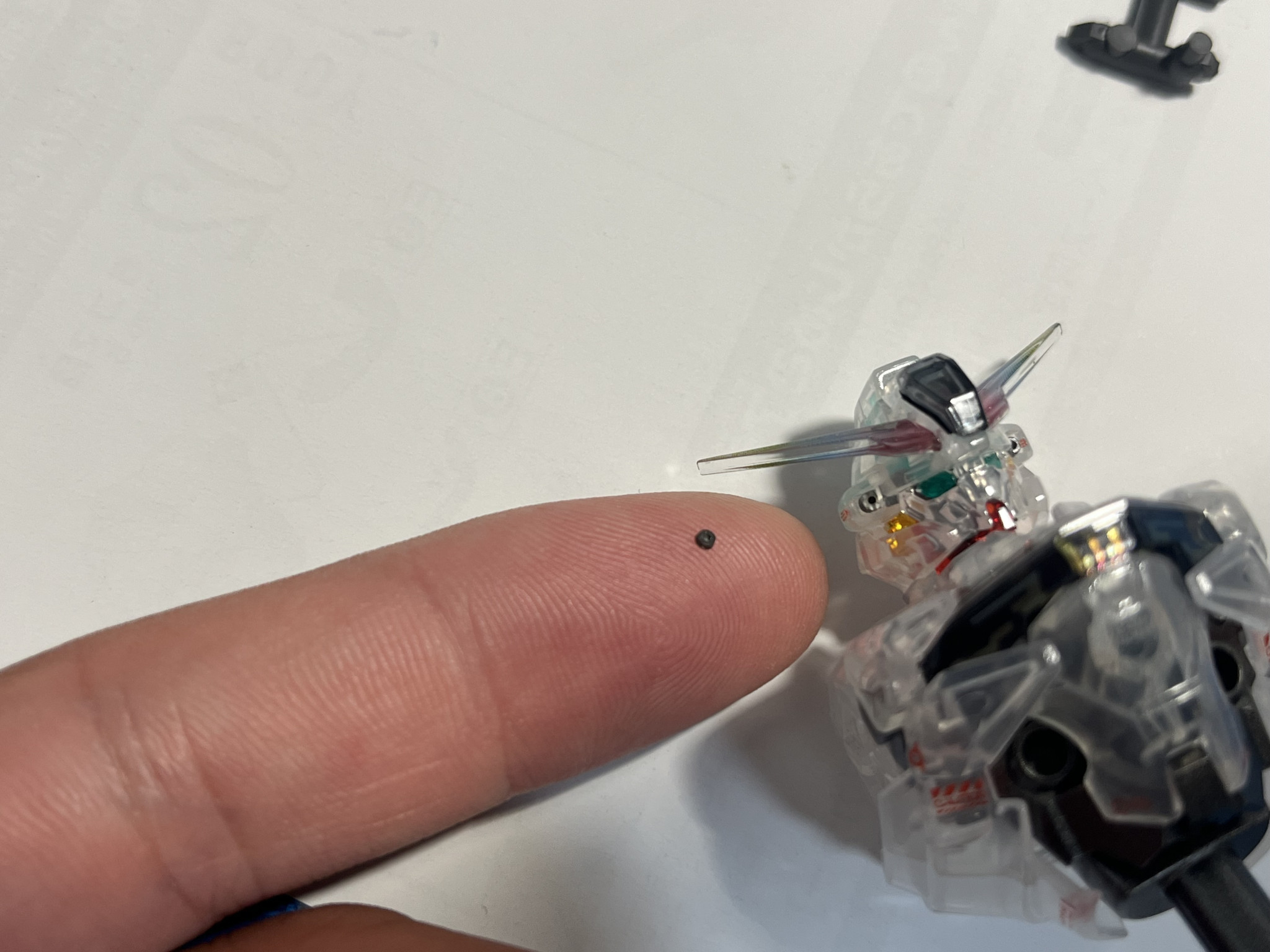 顔パーツをパチっとはめ込むとバルカンを挟んで削れてしまったので伸ばしランナーにピンバイスで孔開けて修復(ひとつ目は接着時にどこかに飛んでいったので、もうひとつ作りました。もう、バルカンが無くなっても怖くない)