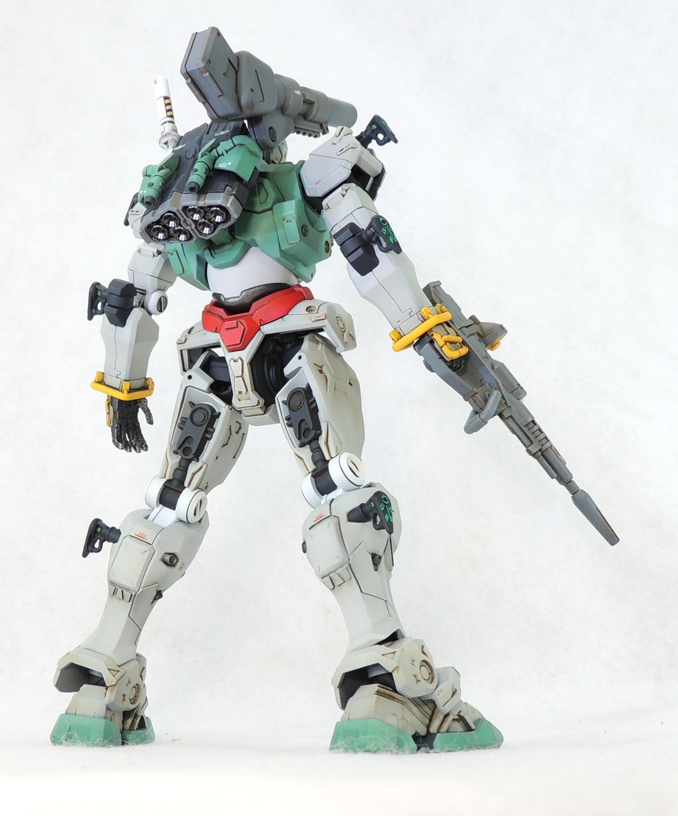 薄いグレーやグリーンの部分の下地にはメカサフスーパーヘヴィを使用し、それをプレシェードとして生かしながら基本色を塗装しました。その後、ホワイトを加えたハイライト色を作り、広い面の中央や各パーツの上側に薄っすらと吹き付けて立体感を強調しています。