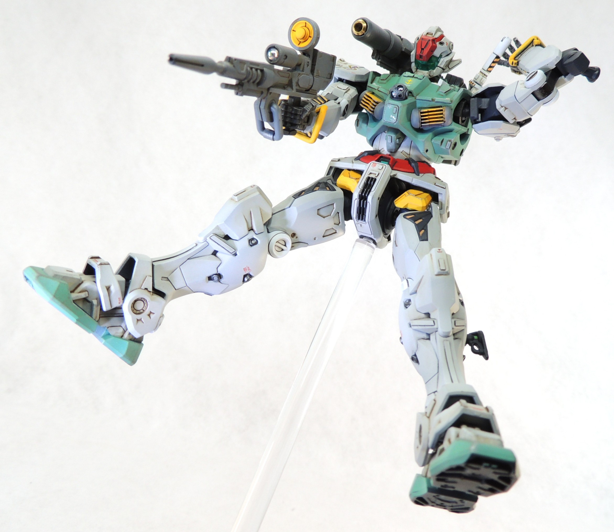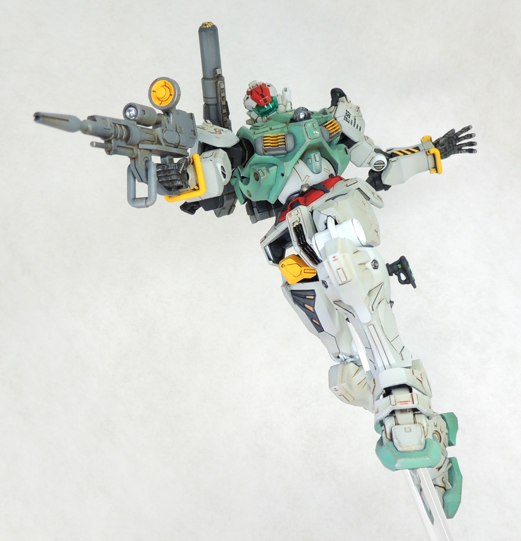 以前製作したセイラ専用機と差別化を図るため、ディティールを追加・変更しています。カラーリングは、映画「機動戦士ガンダム ククルス・ドアンの島」に登場したスレッガー専用GMのパーソナルカラーを踏襲しつつ、ジークアクスに登場したセイラ専用軽キャノンのテイストを盛り込んでアレンジしています。