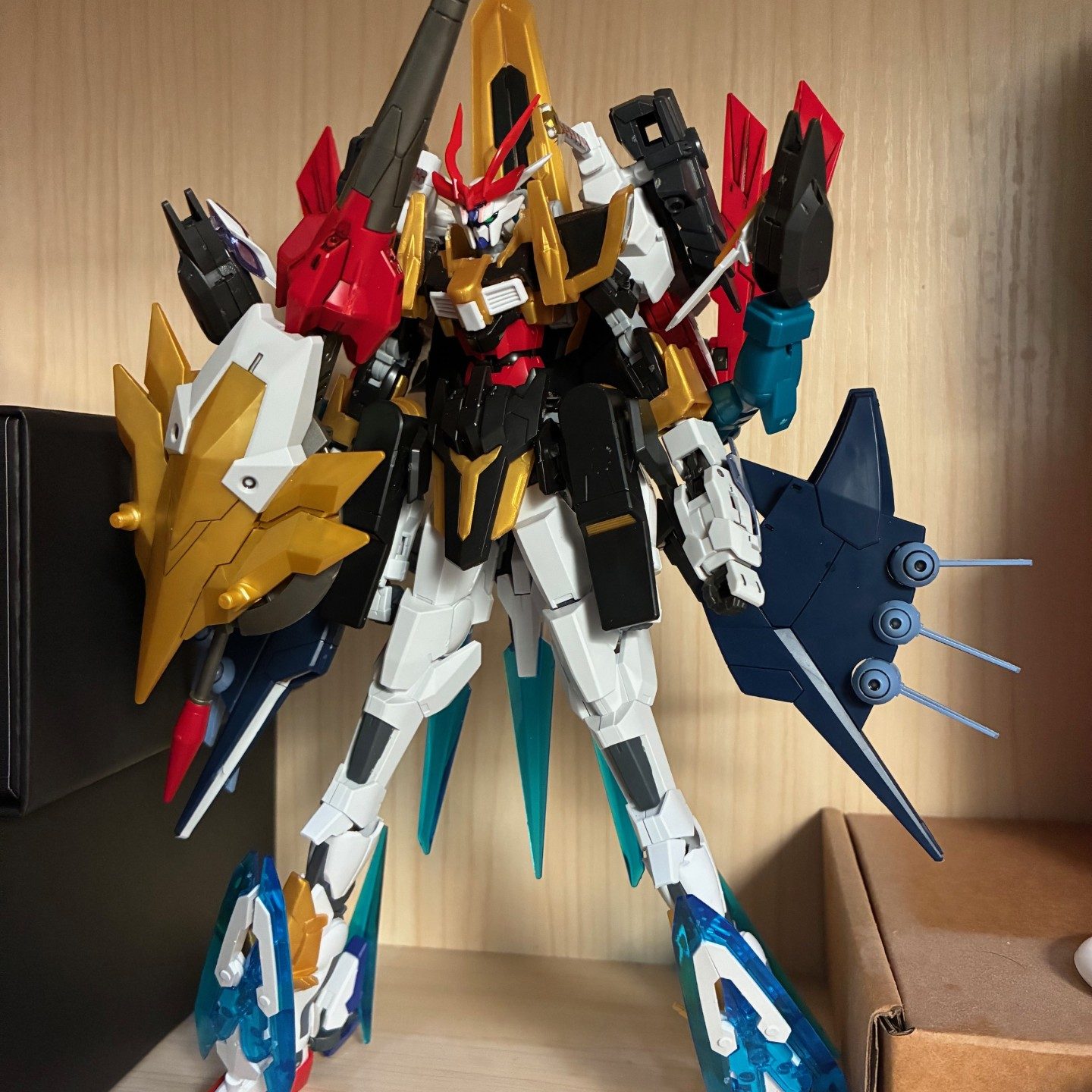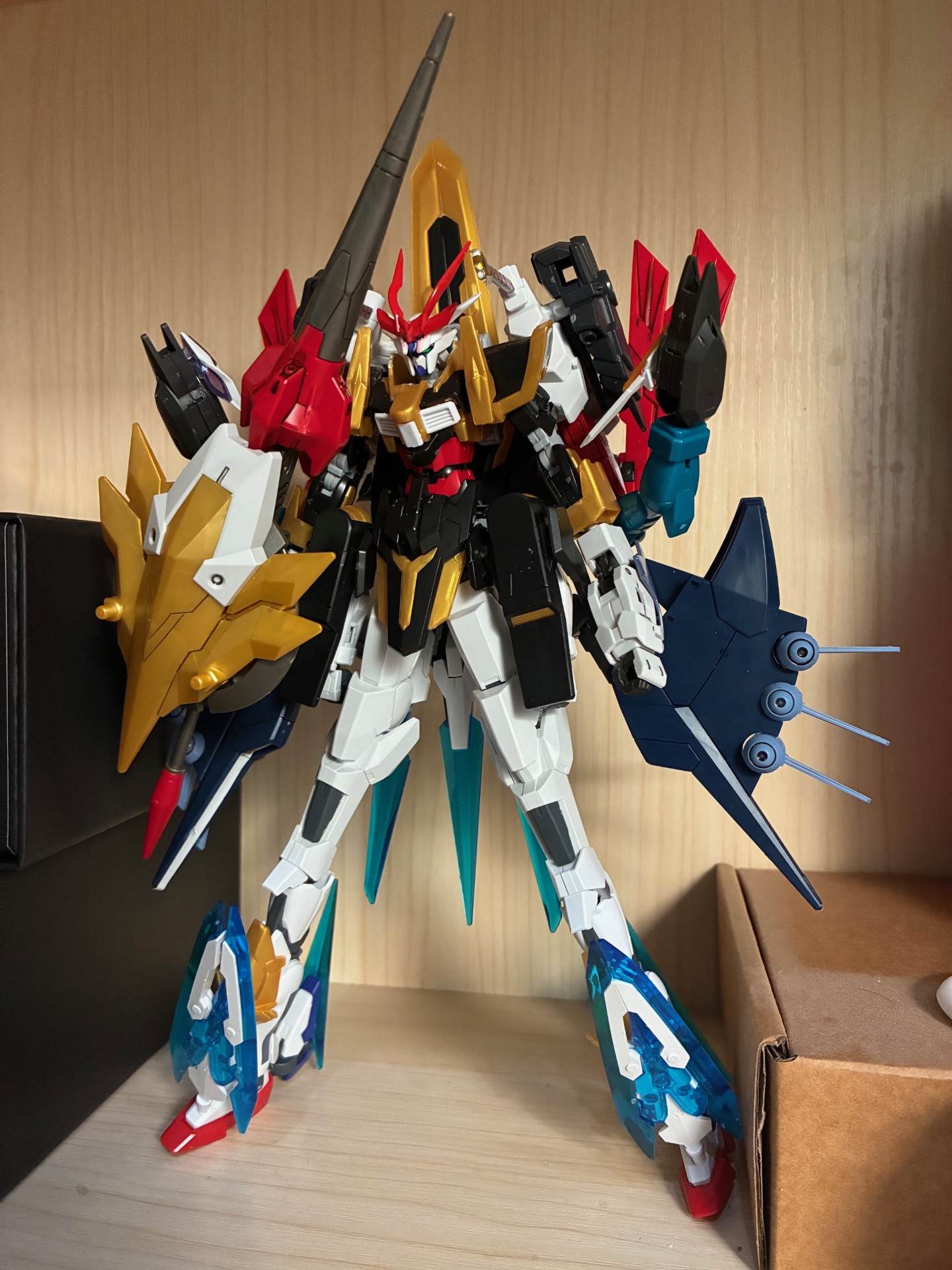 タイトル通り戦国アストレイ、シュバルツリッター、トランジェントといろいろのミキシングです。最初は戦国アストレイ、シュバルツリッターとダブルオーの足でミキシング、それからトランジェントプラストーリスリッターとイージスナイトと他のパーツを追加しました。技術がまた未熟で全身は3mm棒と接着剤で維持してます、解体が怖くて今は家で半固定で飾ってます。。。(gundam-kao5)