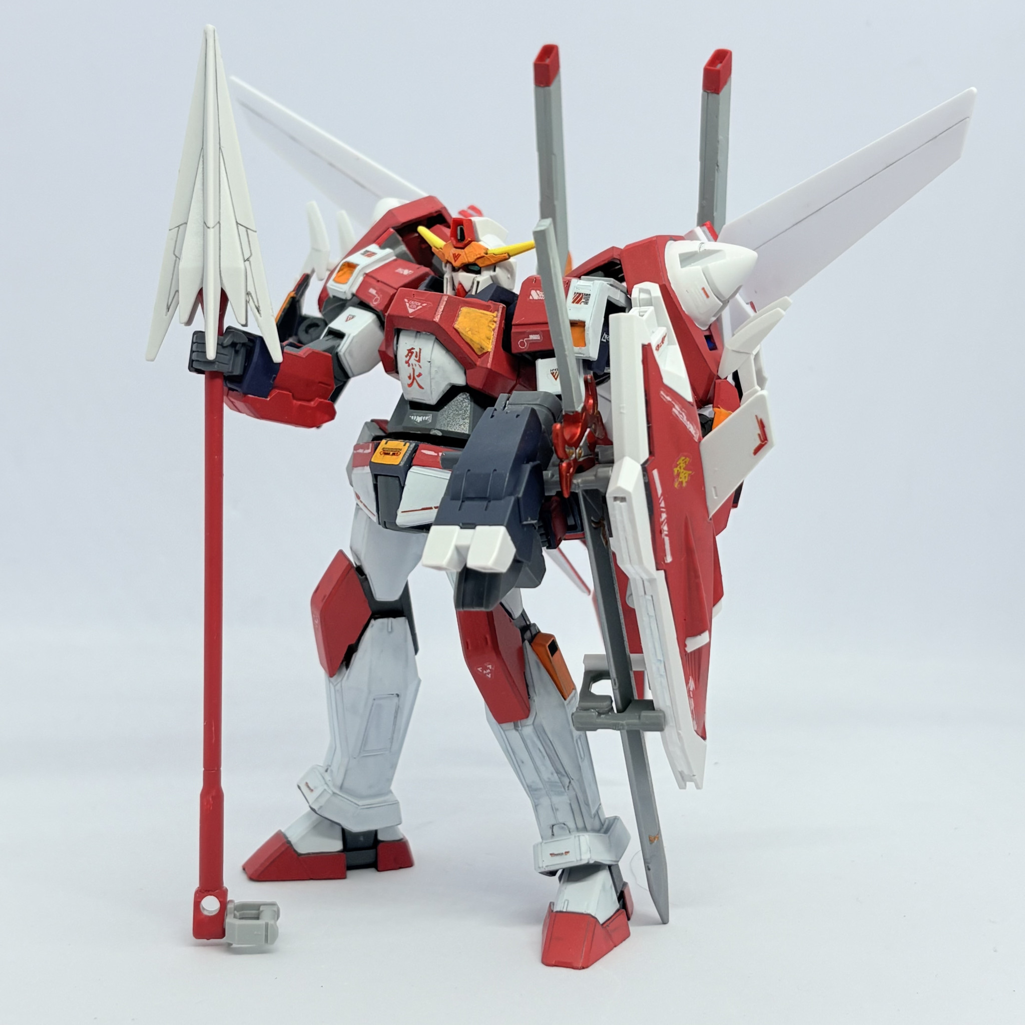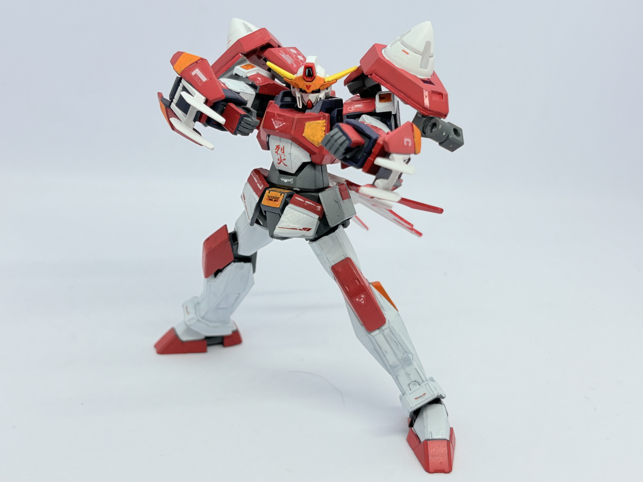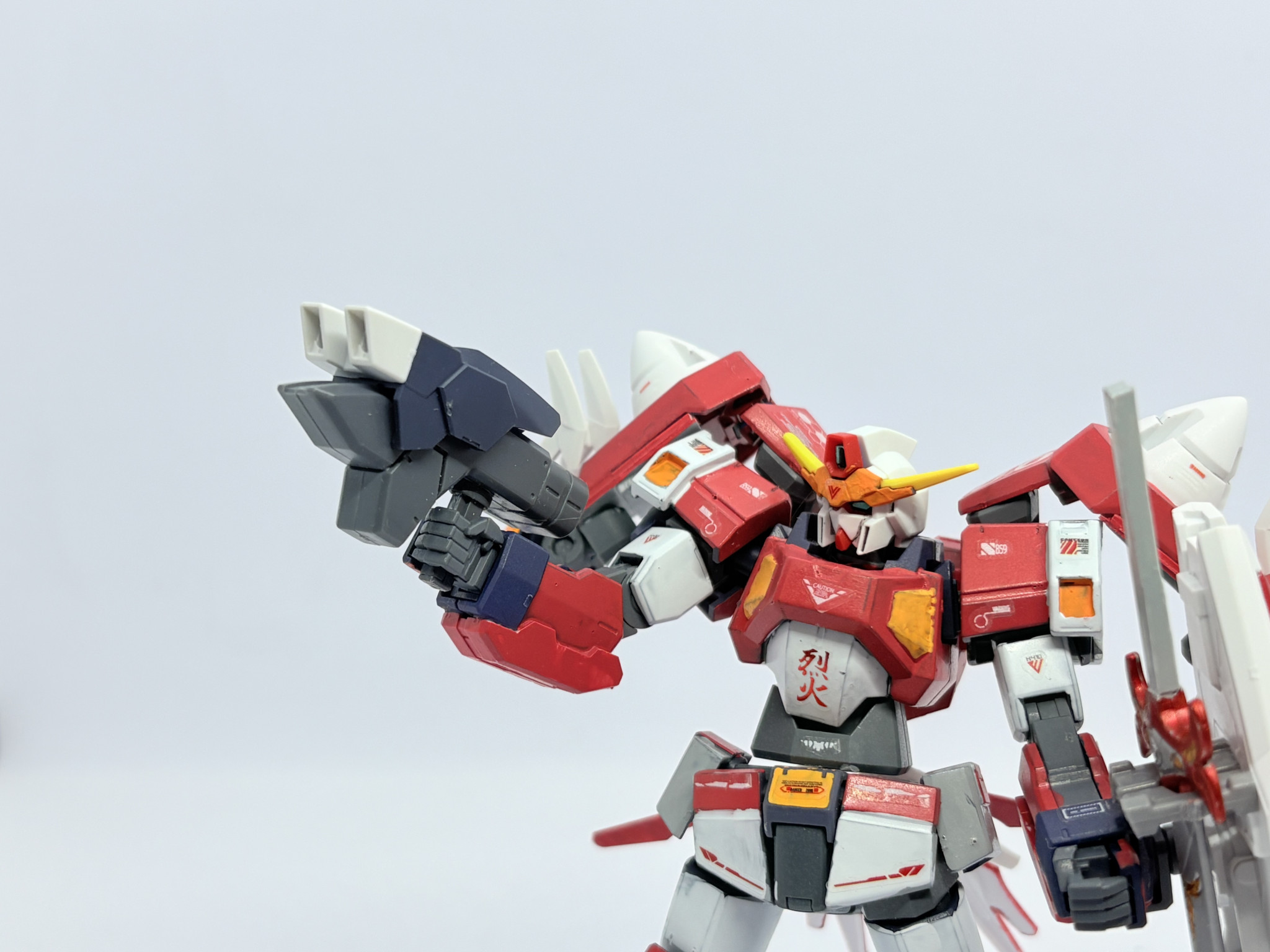 N9バトラーから一転真っ赤に染まった機体。どことなく技や武器の名前・腹部の烈火という所に彼の厨二的な要素は残しつつ、自分が1人のガンプラビルドファイターとして戦う為に00を視聴し採用した形の機体です。