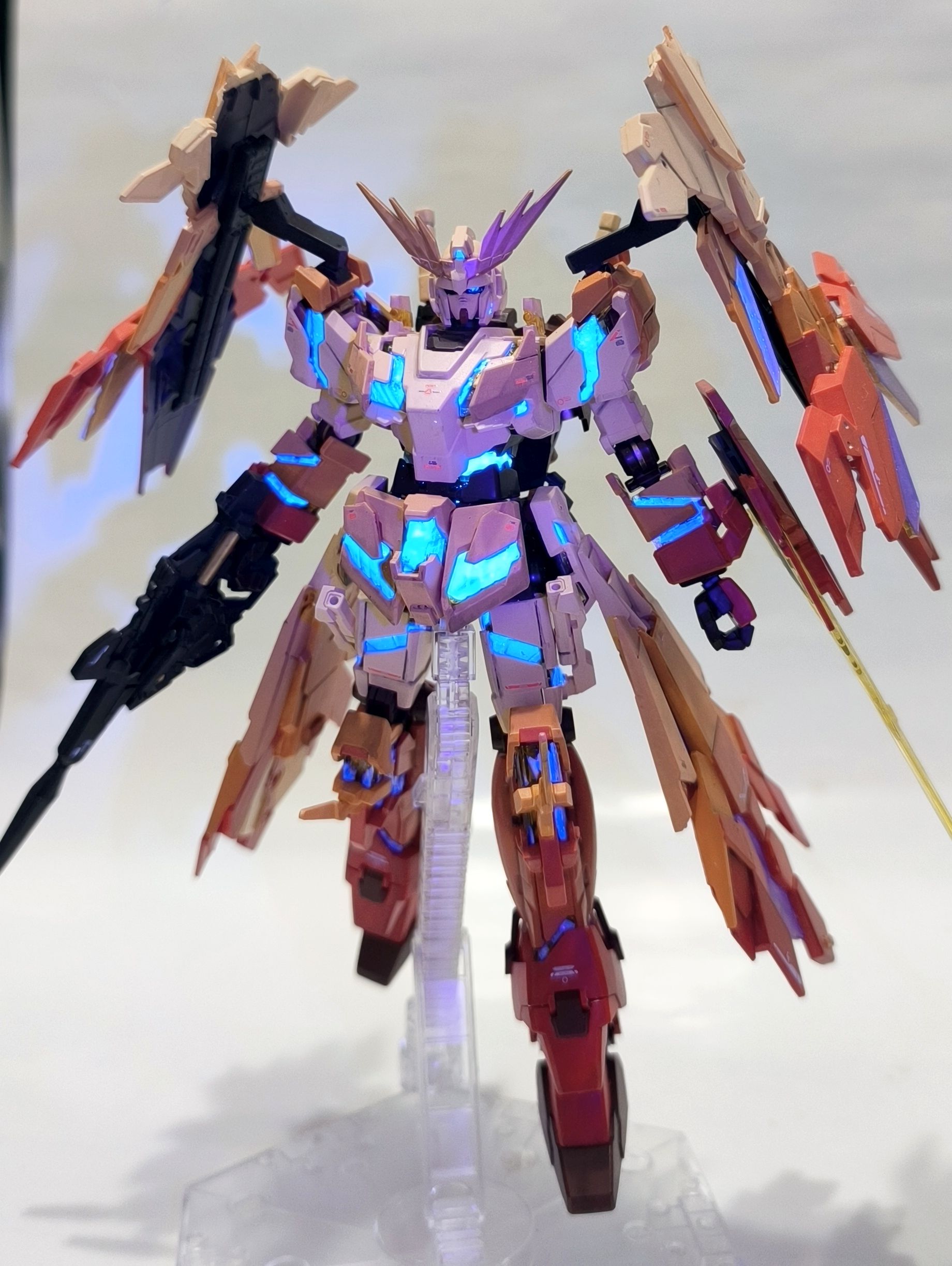 サイコフレームは、シルバー→クリアイエローの上に、蛍光クリアを塗っています。UVライトでの発光が可能です。