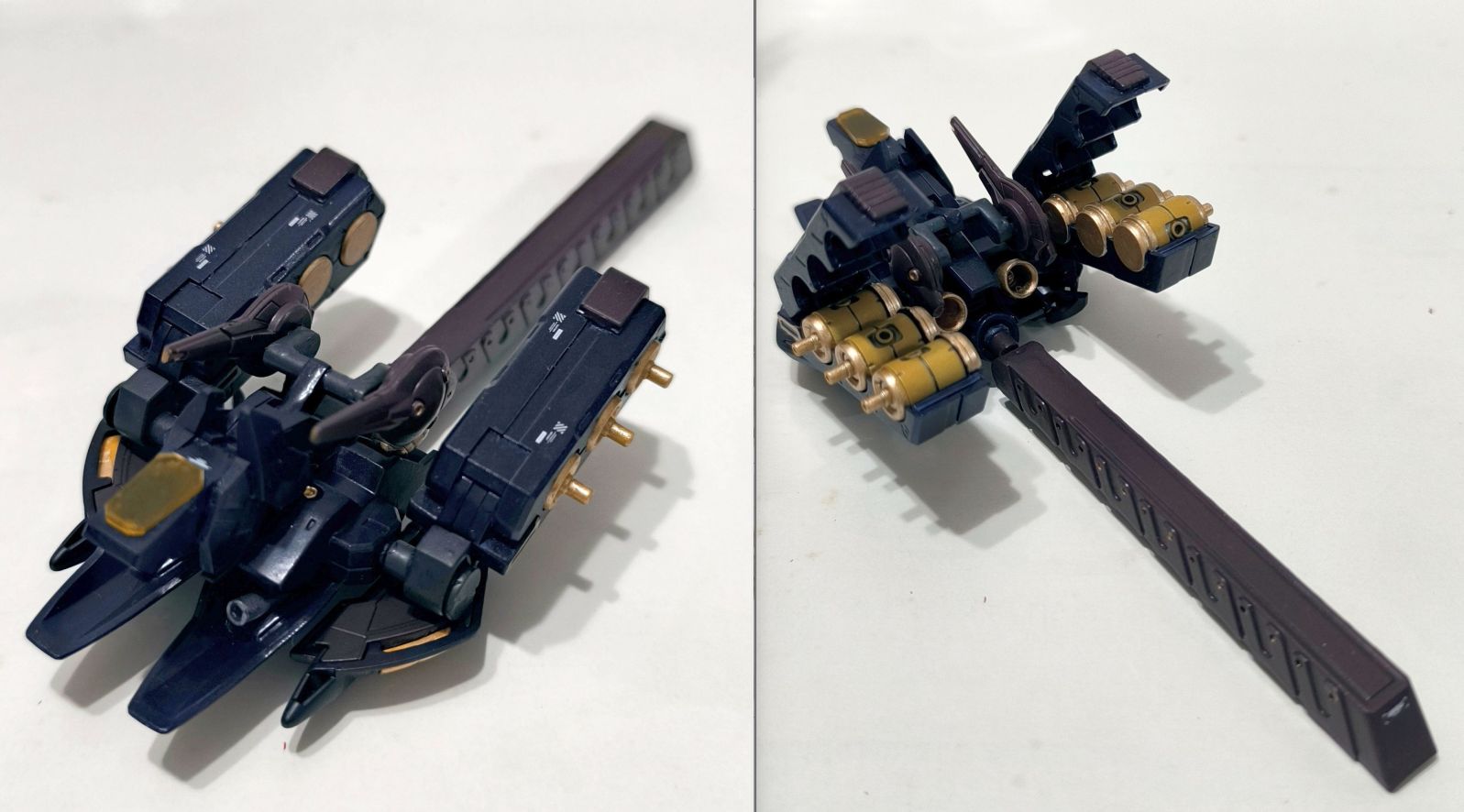 単独動作時には、ビームカノンやファンネルにより、フェネクス・ソールの支援を行う。常時は自立システムによる無人運用ではあるが、有人用コックピットも備えている。かつてのコアファイター運用プランに通ずるような、パイロットの緊急脱出ポッド及び戦闘機としての運用も可能…、という設定です。