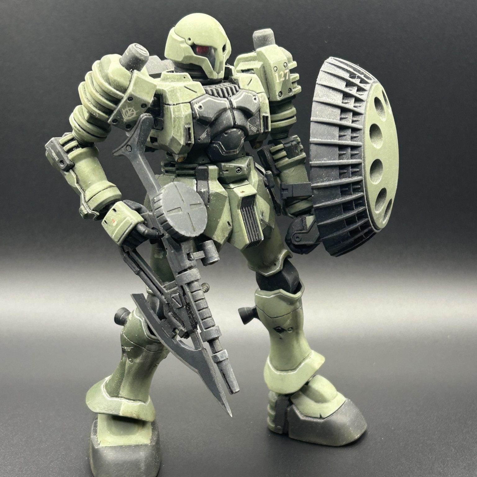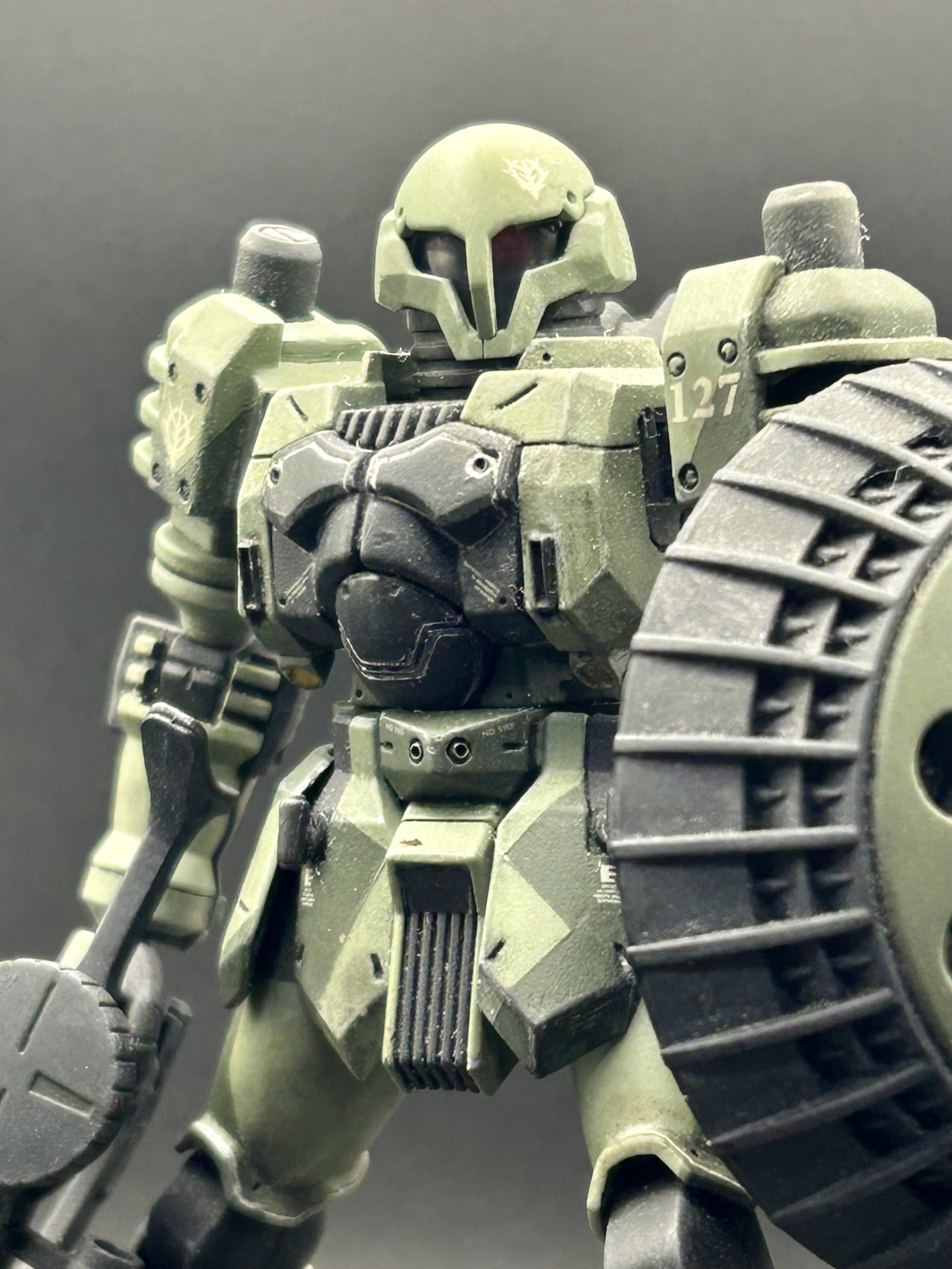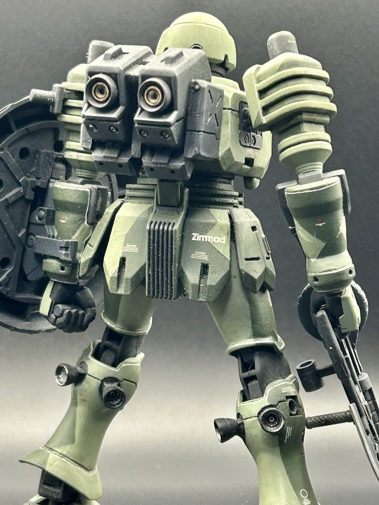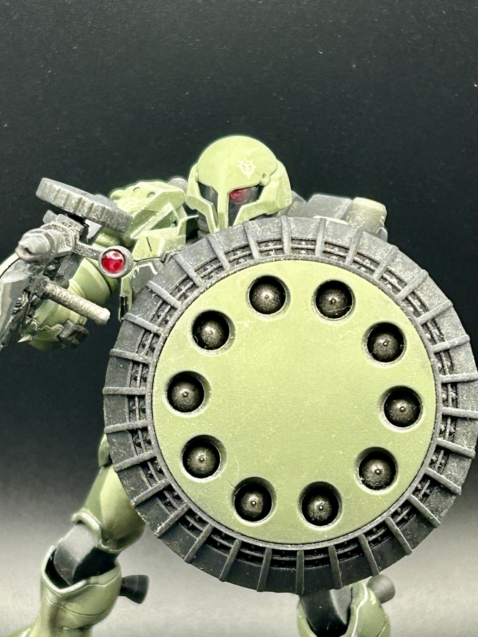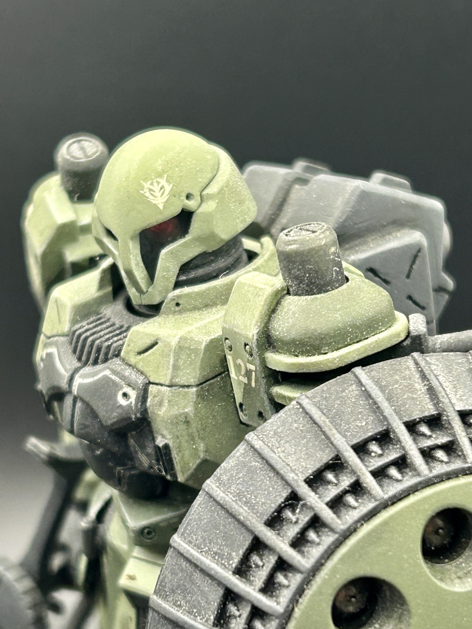 【自分設定】ツィマッド社がドム開発前に地上用エンジンのテスト用に製造した機体。ジオン軍の地上撤退に合わせて地上残留部隊に配備、半ば投棄された。ツィマッド社製の火器管制システムによりギャン用の試作シールドを装備可能。